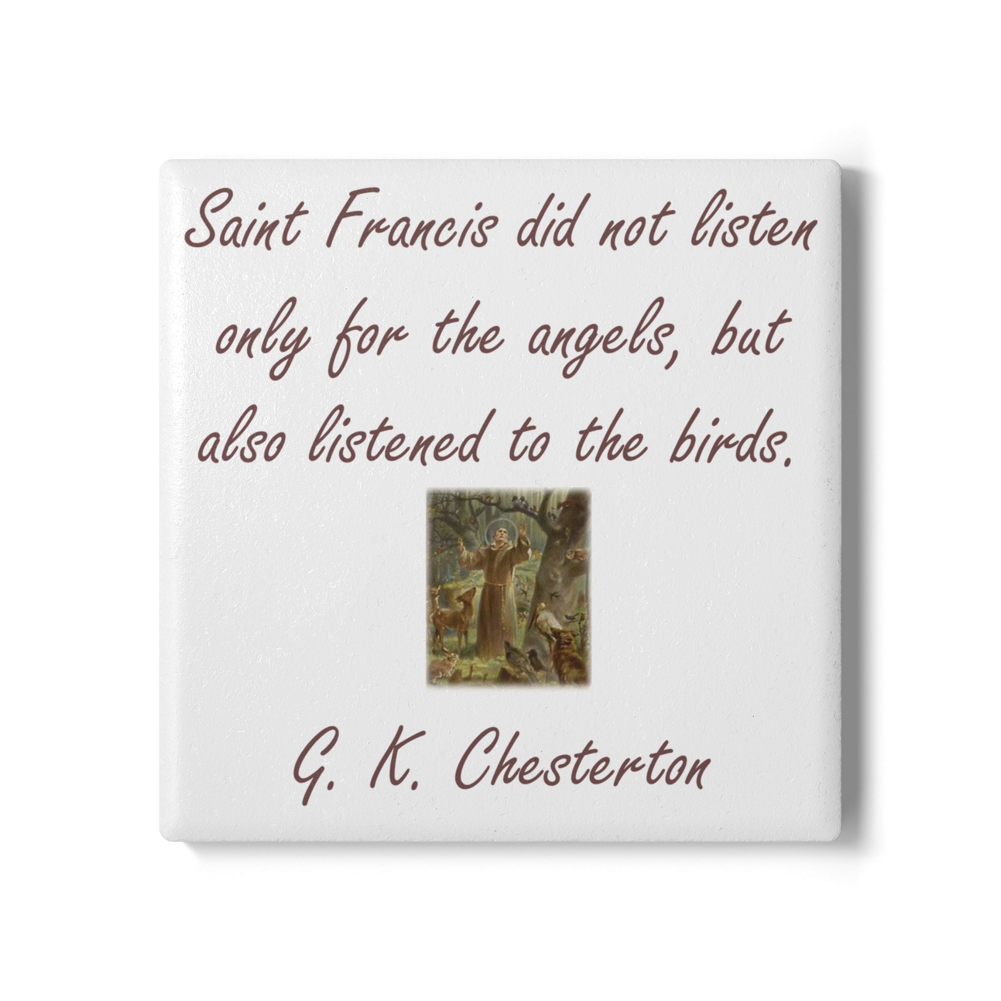 More than a simple coaster—this piece is a tribute to harmony between faith and the natural world. Featuring a thoughtful quote from G.K. Chesterton alongside a tranquil depiction of St. Francis of Assisi surrounded by animals, this design invites reflection on the beauty of listening to all voices—earthly and divine. A meaningful addition for nature lovers, environmentalists, and admirers of St. Francis’ timeless wisdom, it blends inspiration with function. Crafted from premium white ceramic with a non-slip cork backing, it serves as both a practical home accessory and a gentle reminder to embrace the world with reverence.
