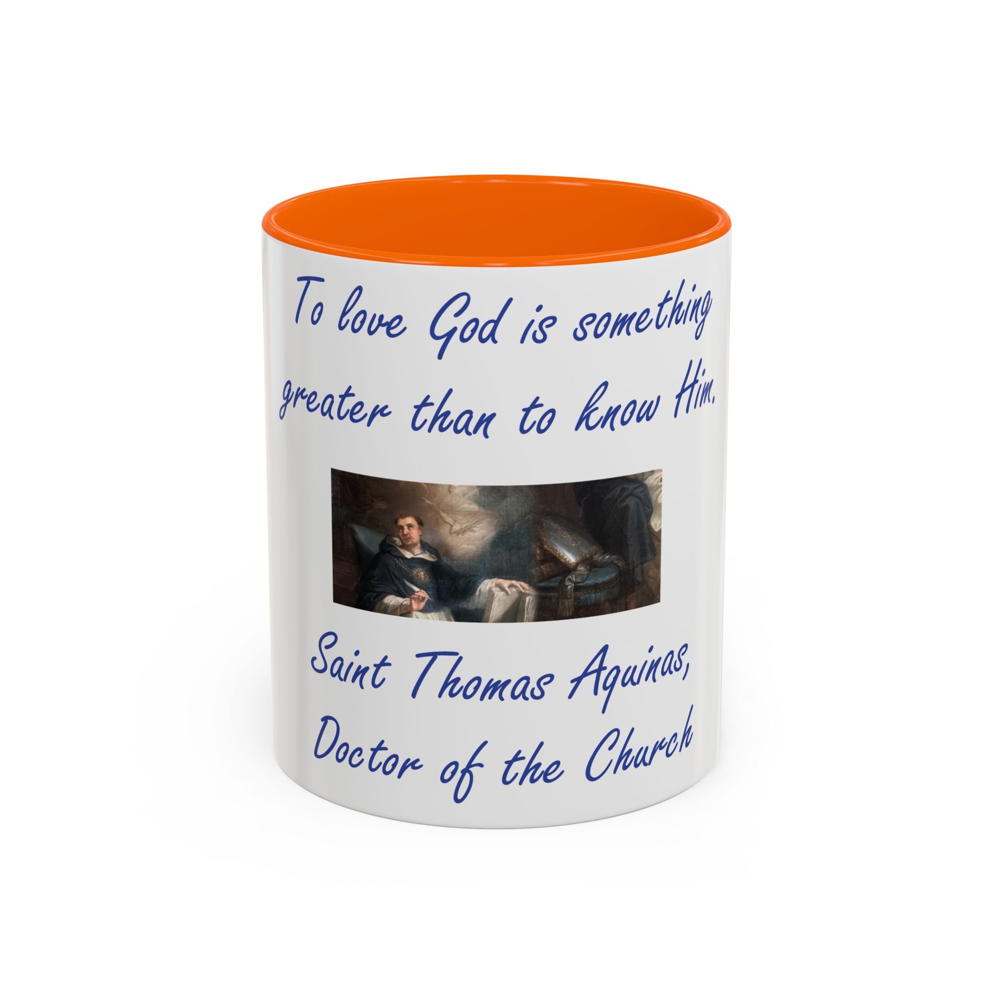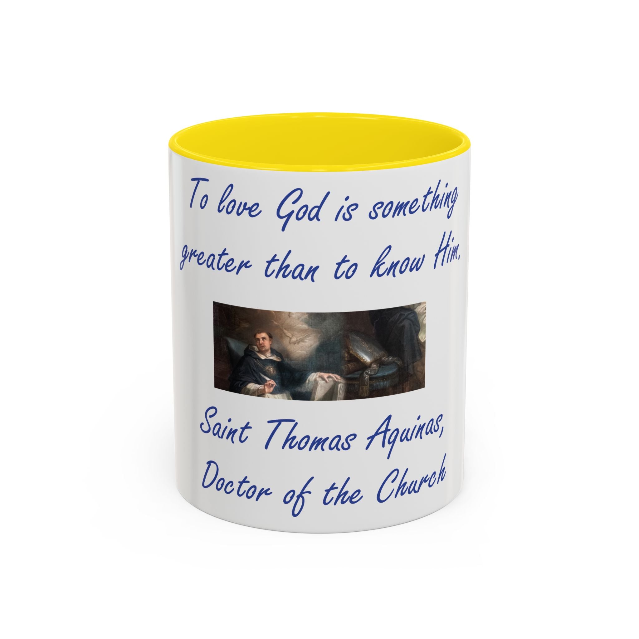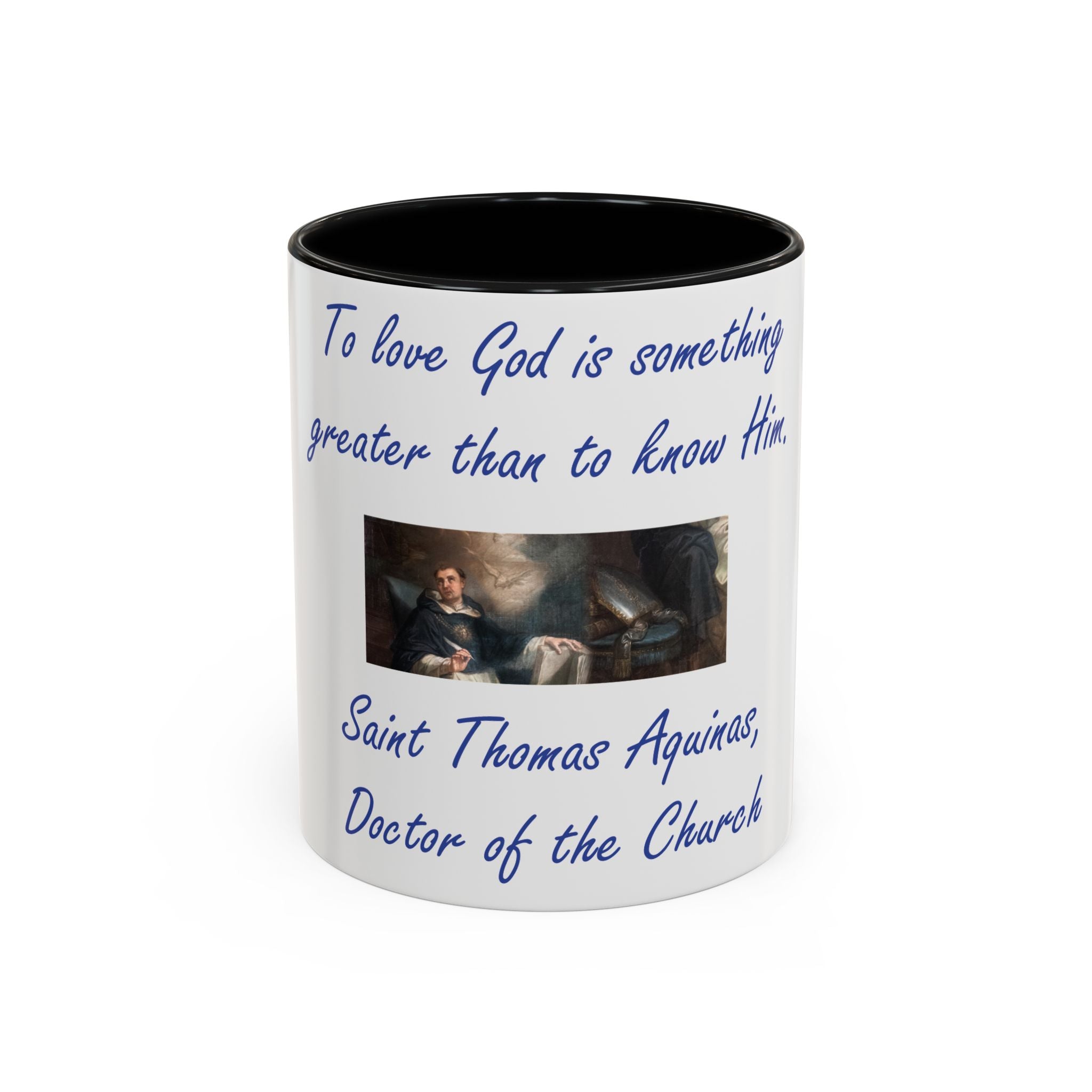 Enhance your coffee routine with this Accent Coffee Mug, featuring the profound wisdom of St. Thomas Aquinas: 'To love God is something greater than to know Him.' Crafted from high-quality white ceramic, this mug’s glossy finish and bold color contrast make it a meaningful and stylish addition to any kitchen or office space.