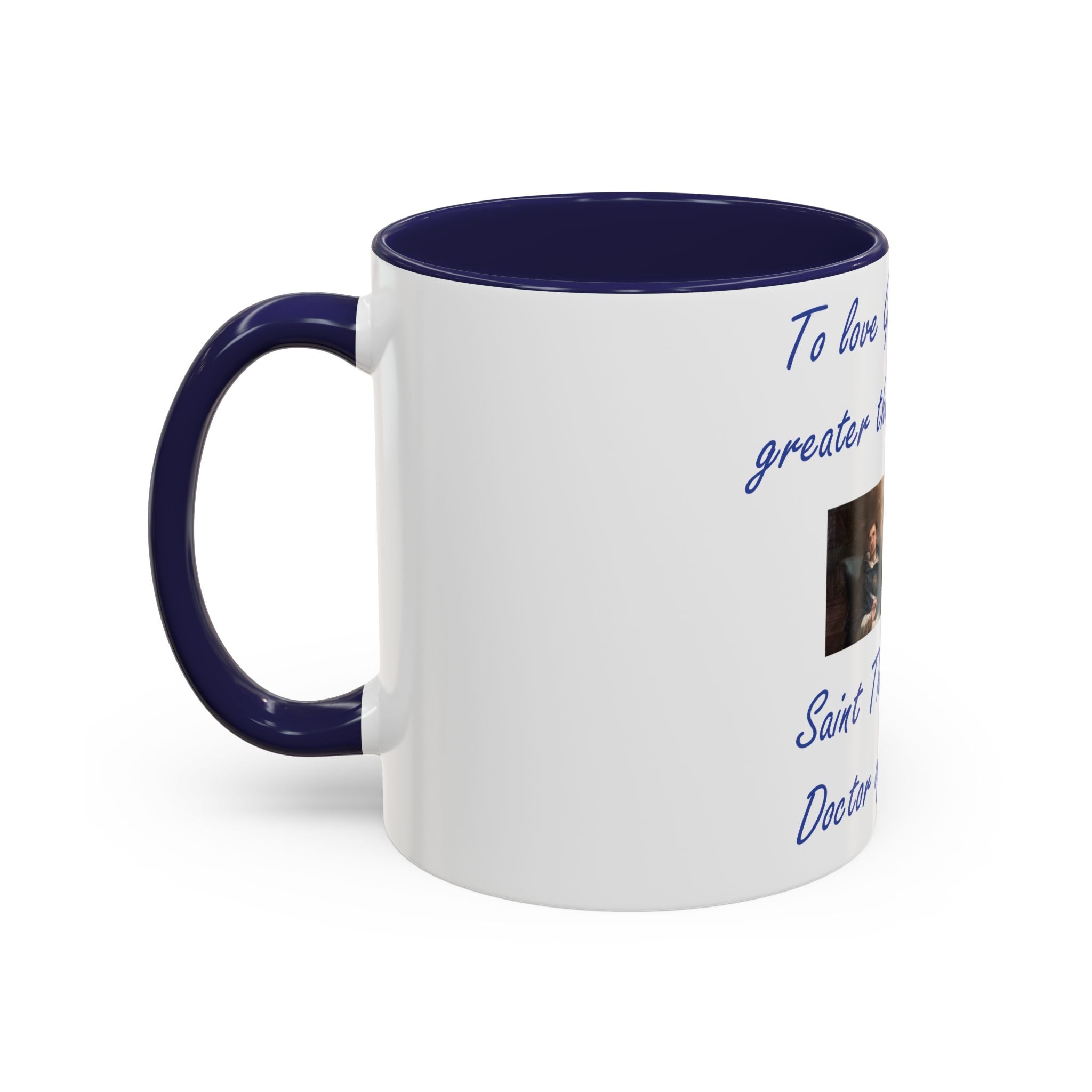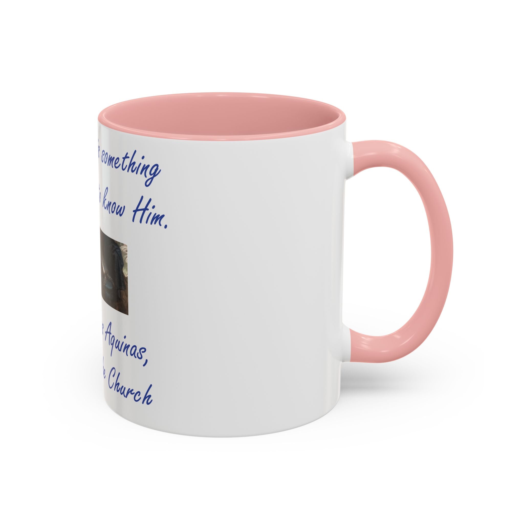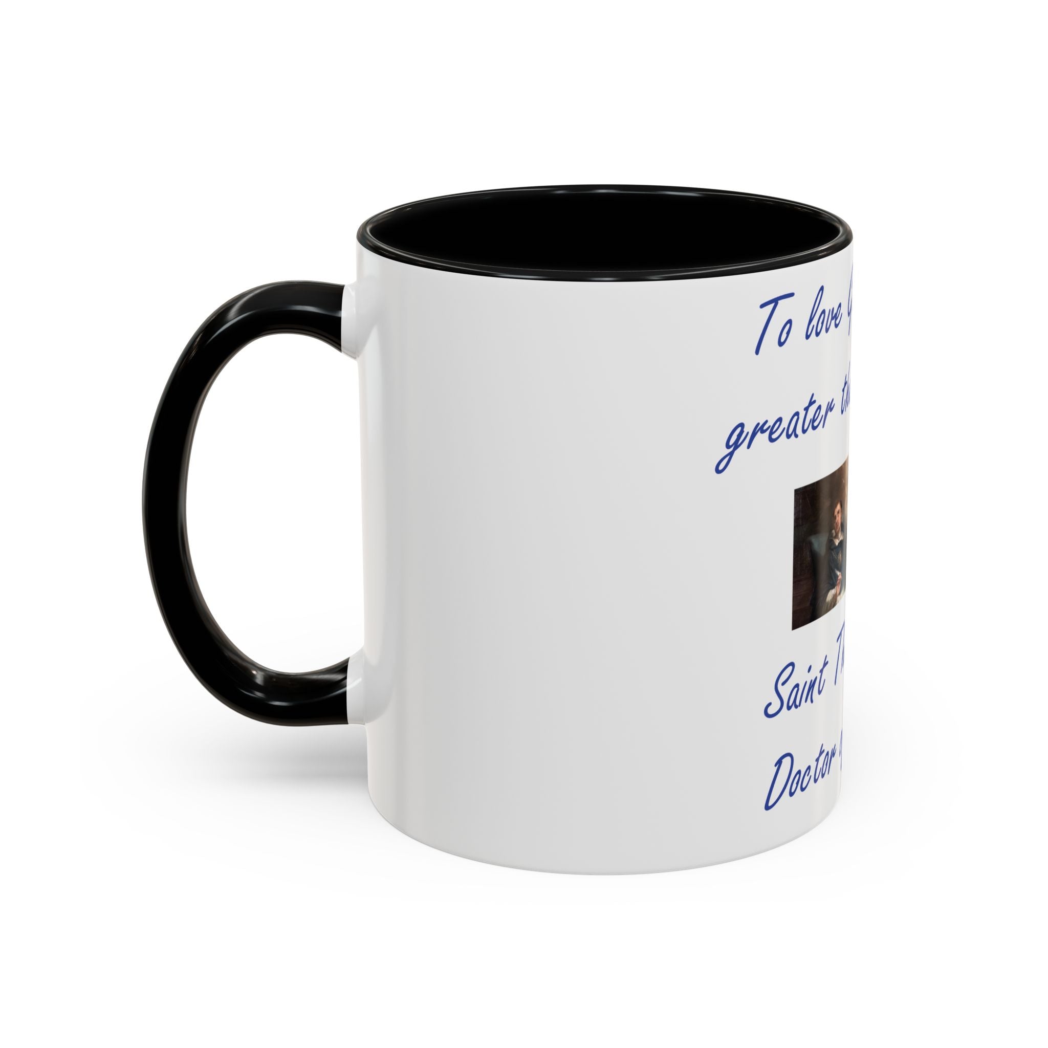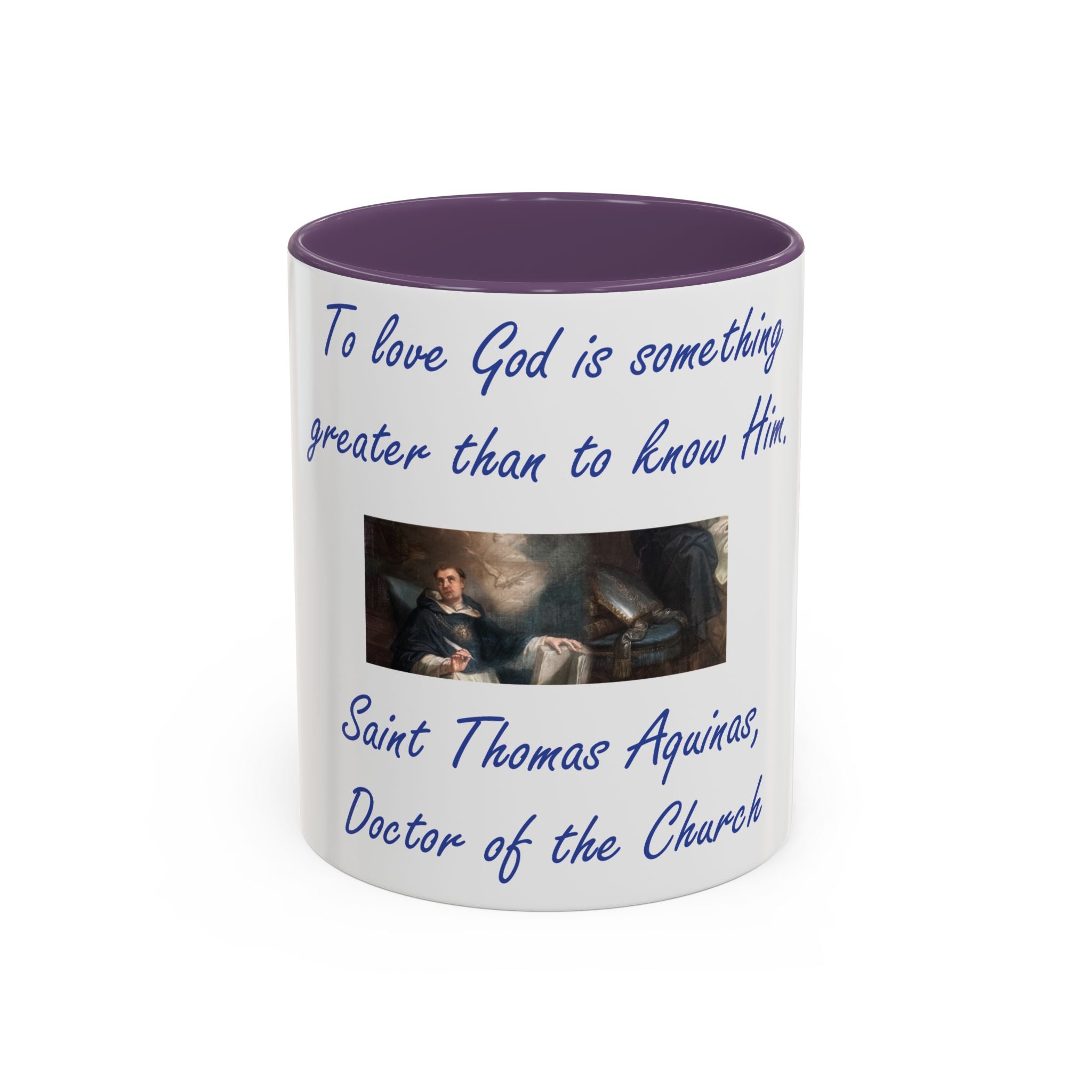 Enhance your coffee routine with this Accent Coffee Mug, featuring the profound wisdom of St. Thomas Aquinas: 'To love God is something greater than to know Him.' Crafted from high-quality white ceramic, this mug’s glossy finish and bold color contrast make it a meaningful and stylish addition to any kitchen or office space.
