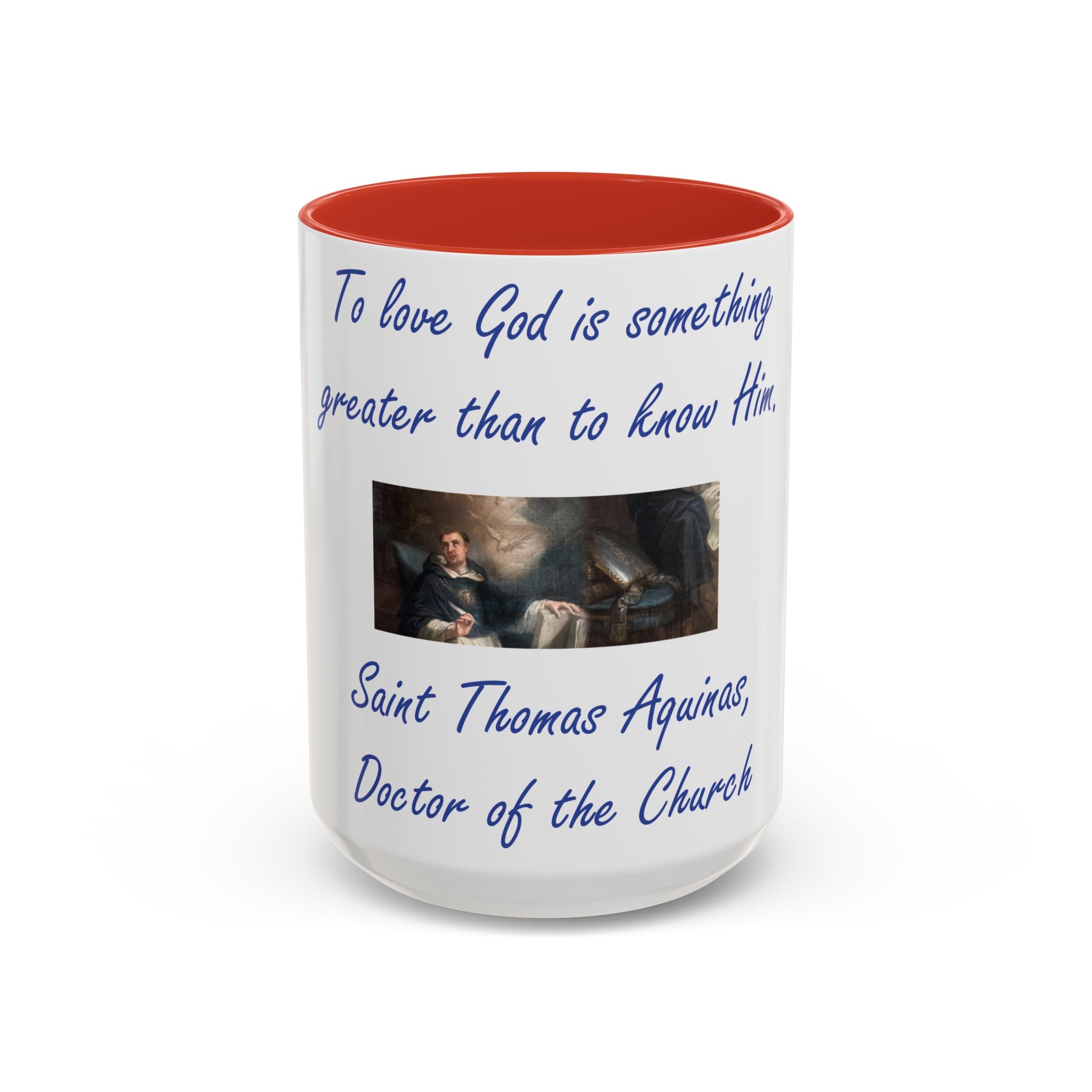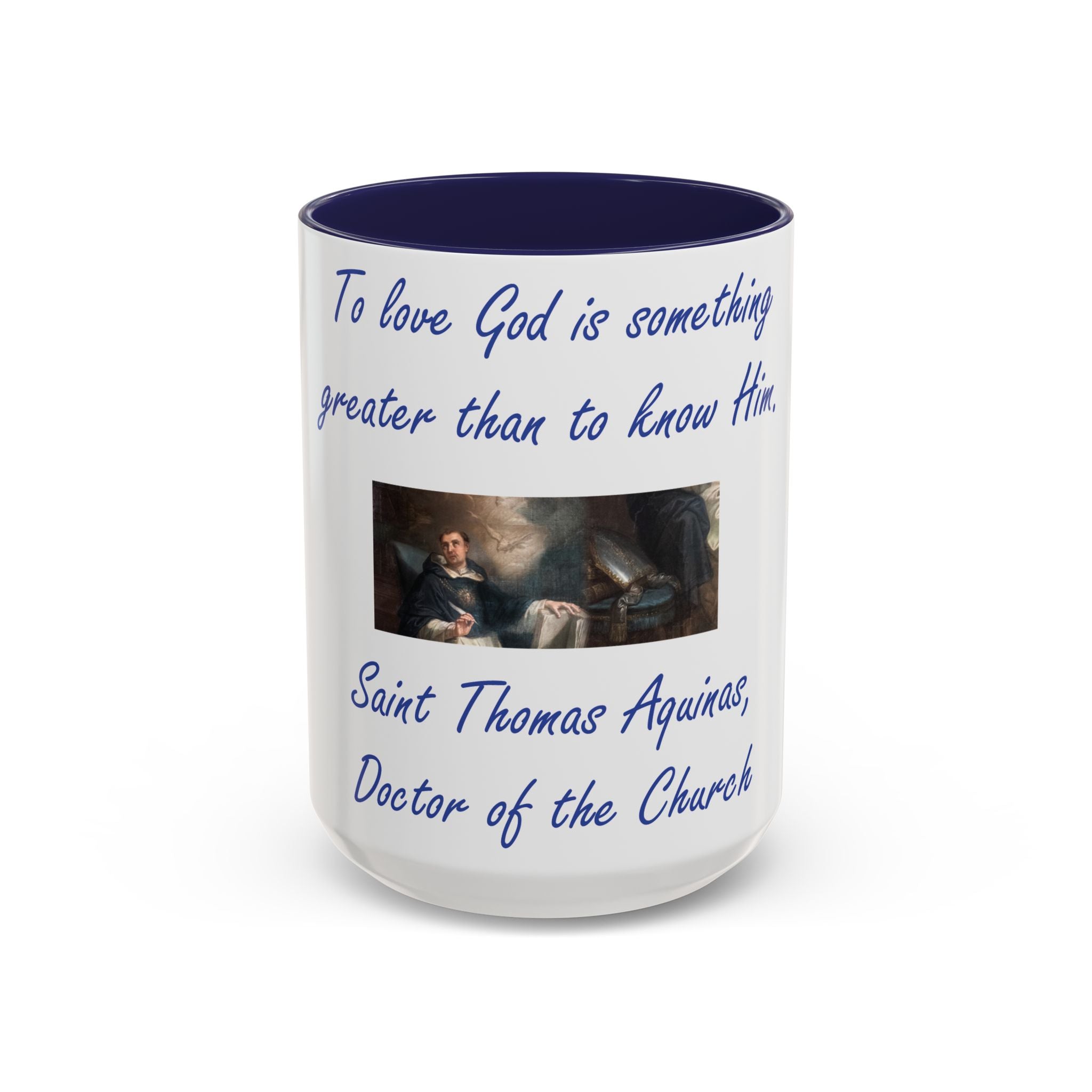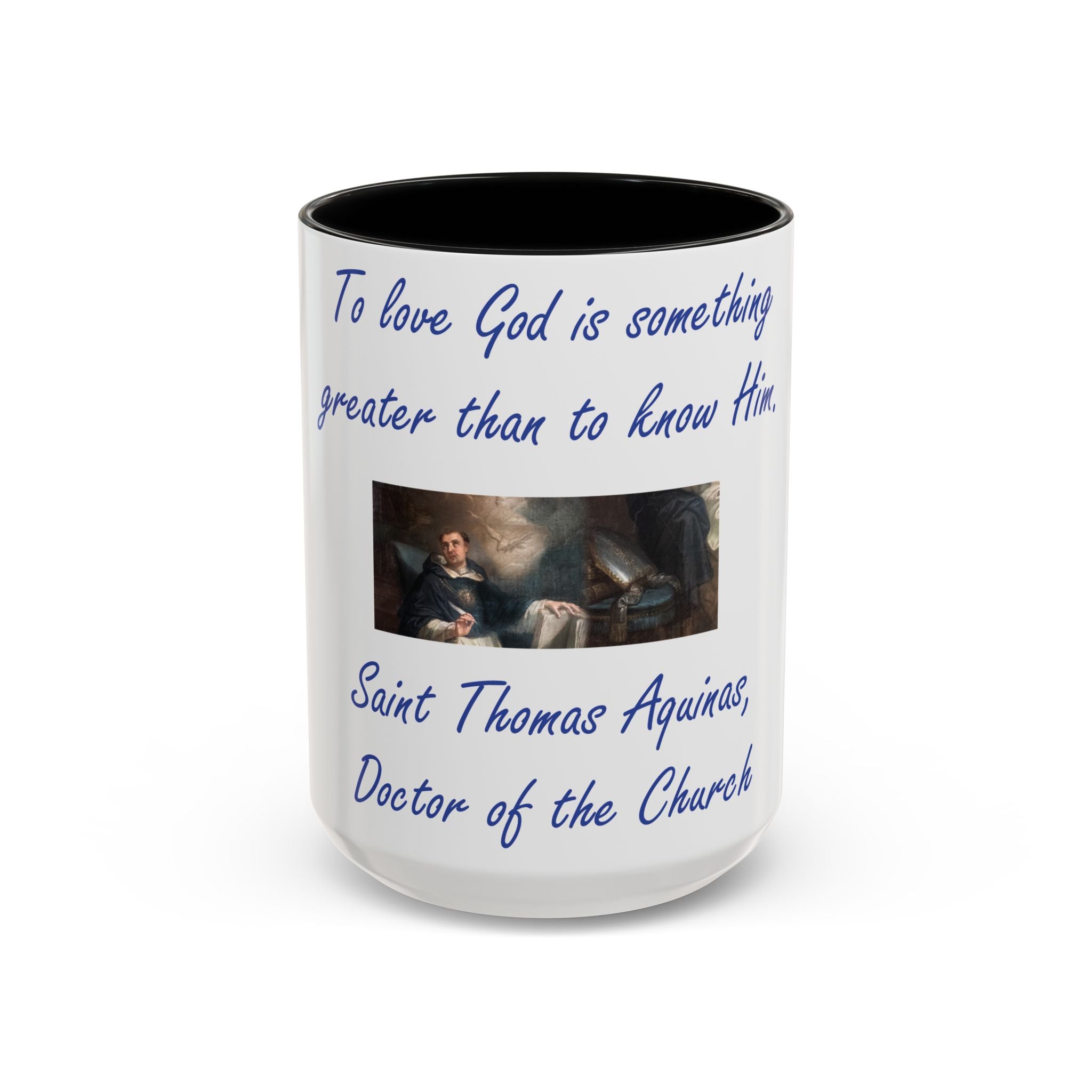 Add depth and inspiration to your coffee routine with this vibrant Accent Coffee Mug, featuring the timeless quote from St. Thomas Aquinas: 'To love God is something greater than to know Him.' The striking color contrast, glossy ceramic finish, and colorful interior make it a stylish yet meaningful addition to any kitchen or office space.