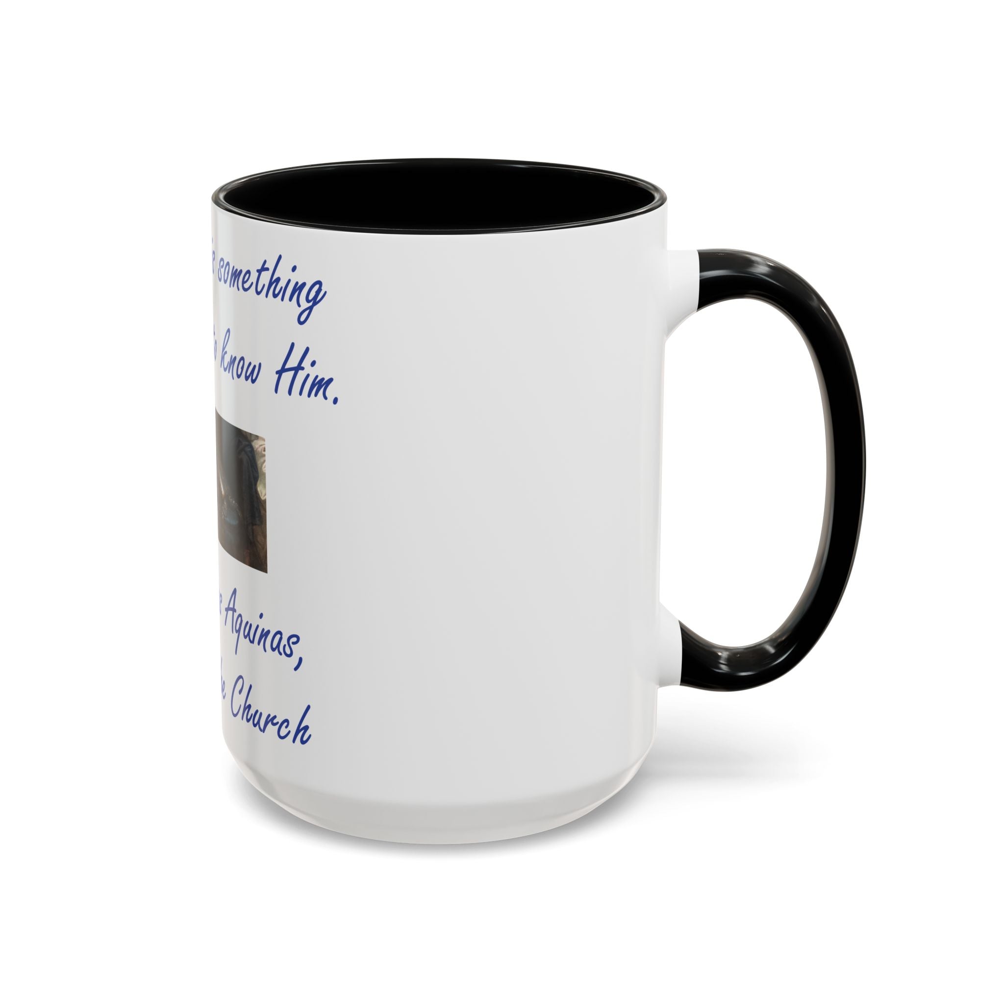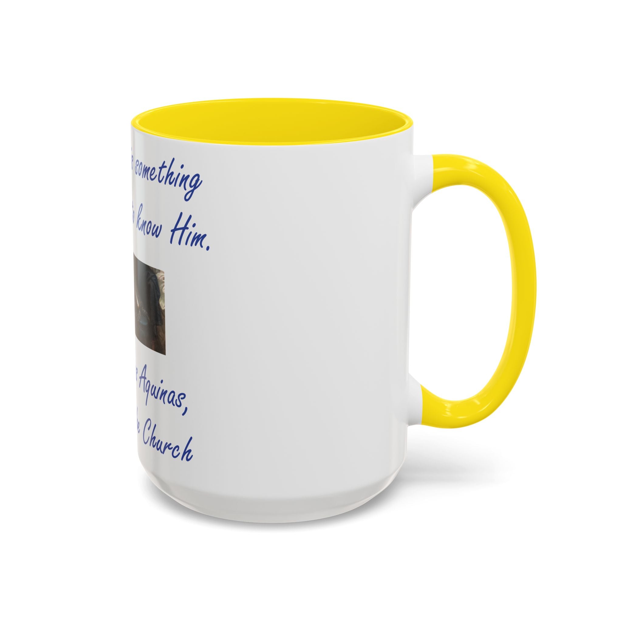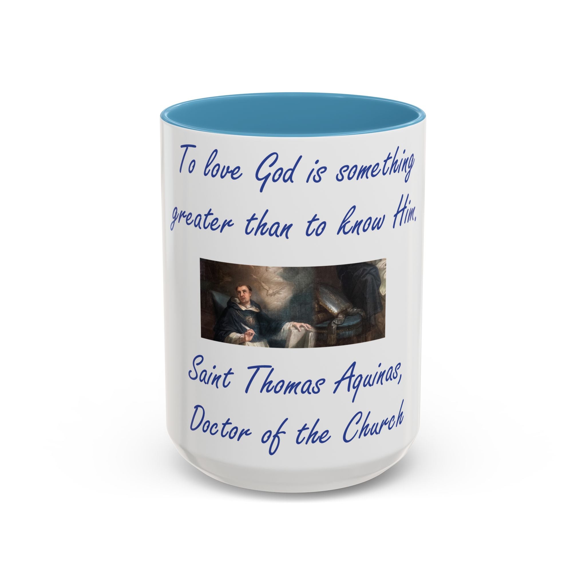 Add depth and inspiration to your coffee routine with this vibrant Accent Coffee Mug, featuring the timeless quote from St. Thomas Aquinas: 'To love God is something greater than to know Him.' The striking color contrast, glossy ceramic finish, and colorful interior make it a stylish yet meaningful addition to any kitchen or office space.