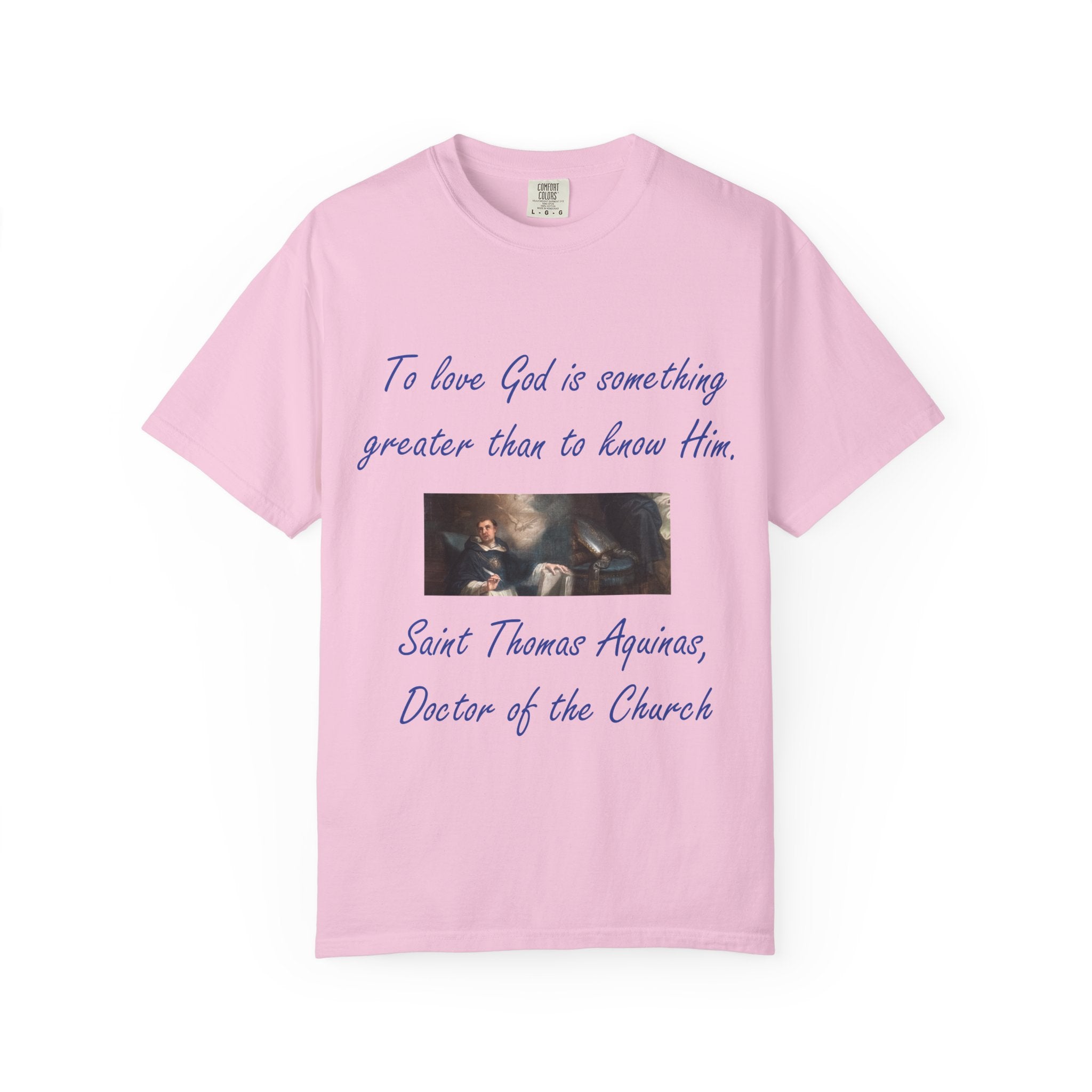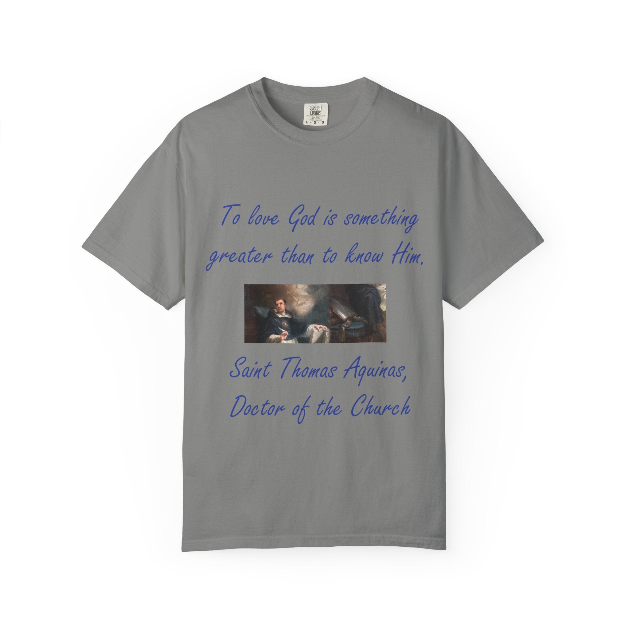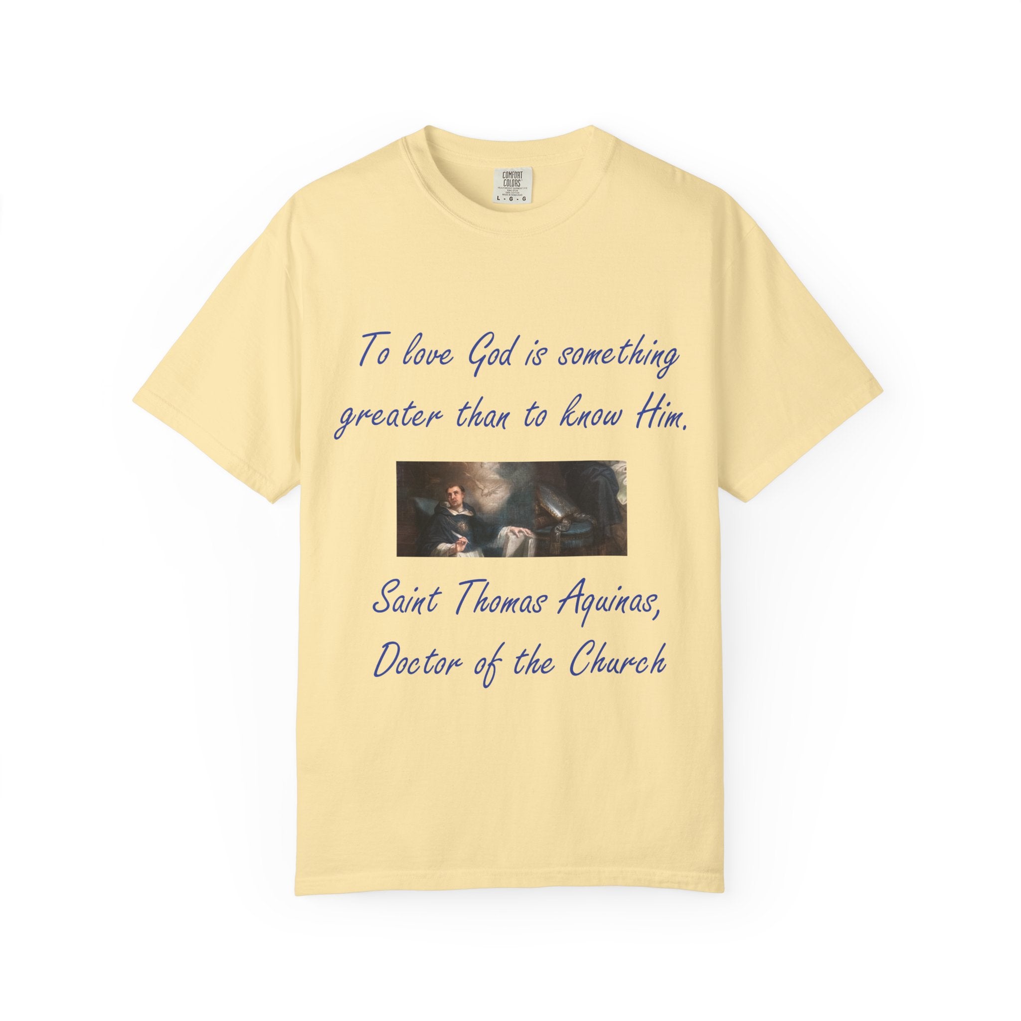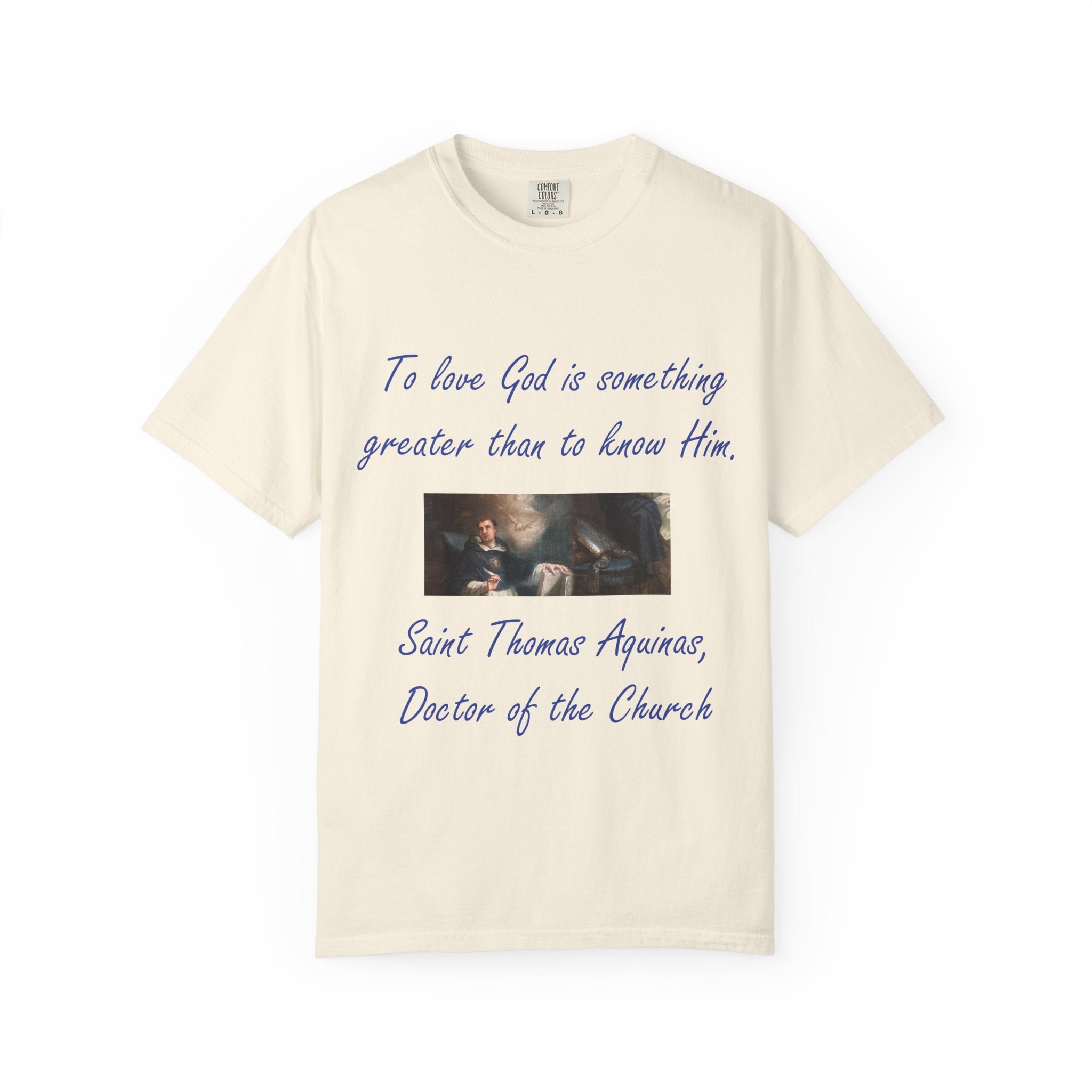 Celebrate wisdom and elegance with this Unisex Garment-Dyed T-shirt, featuring the inspiring quote from St. Thomas Aquinas: 'To love God is something greater than to know Him.' Crafted for those who value both comfort and meaningful design, this shirt boasts a relaxed fit that’s perfect for casual outings or semi-formal occasions.