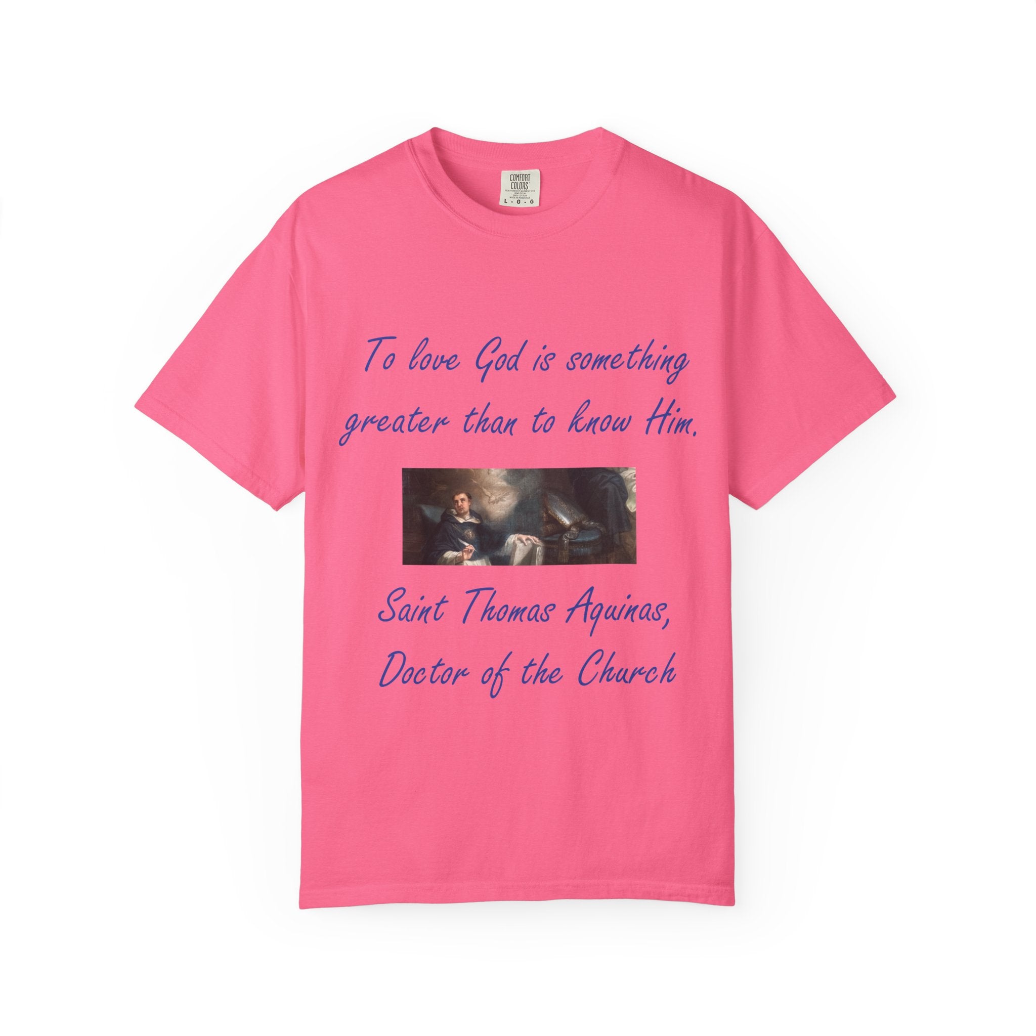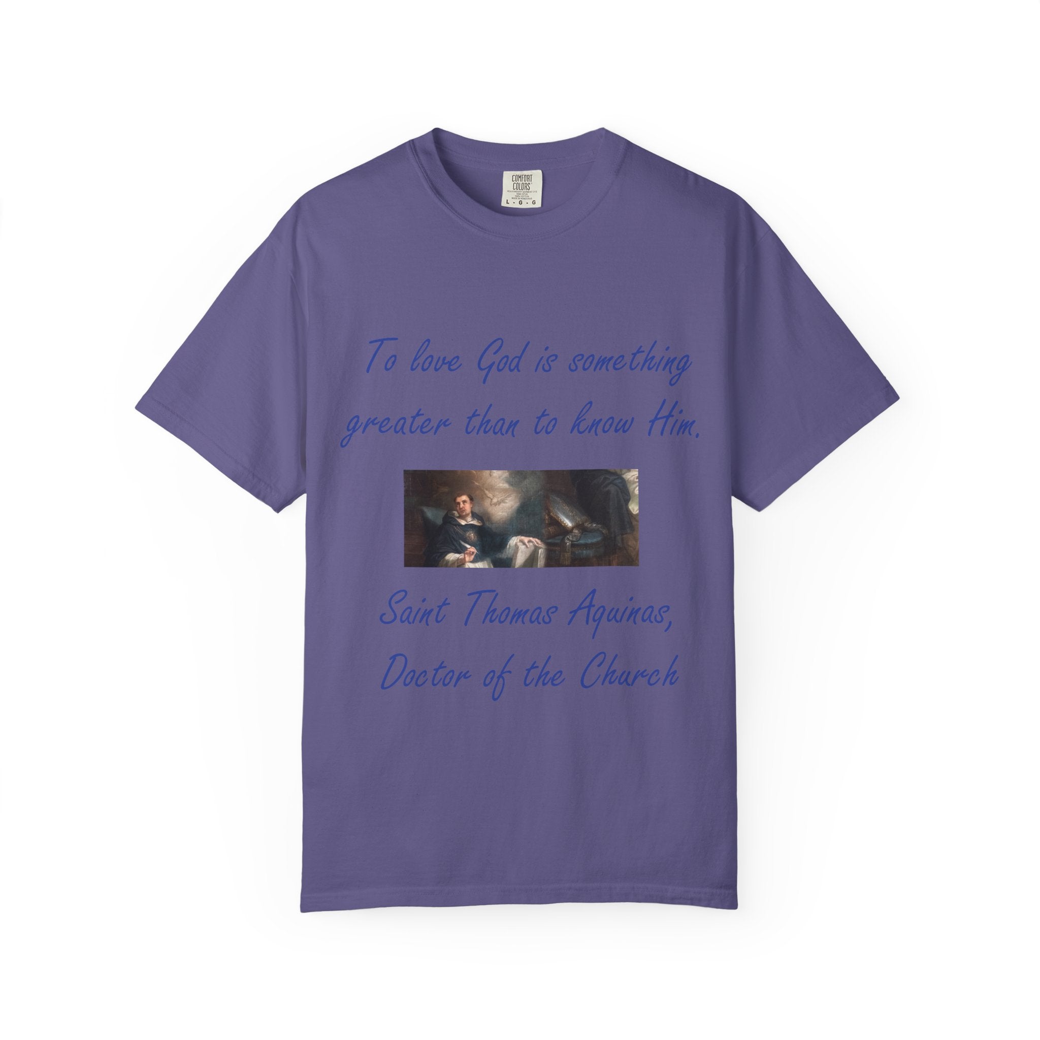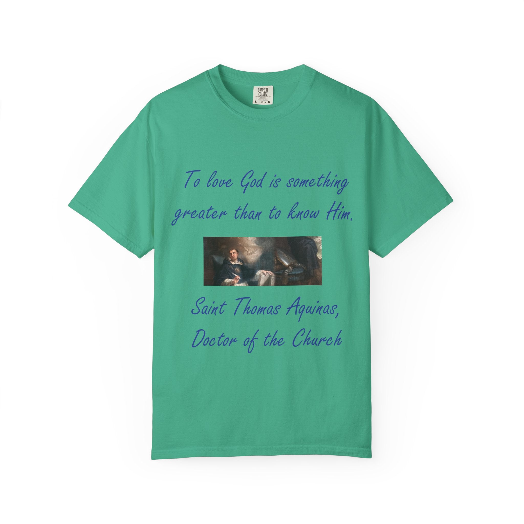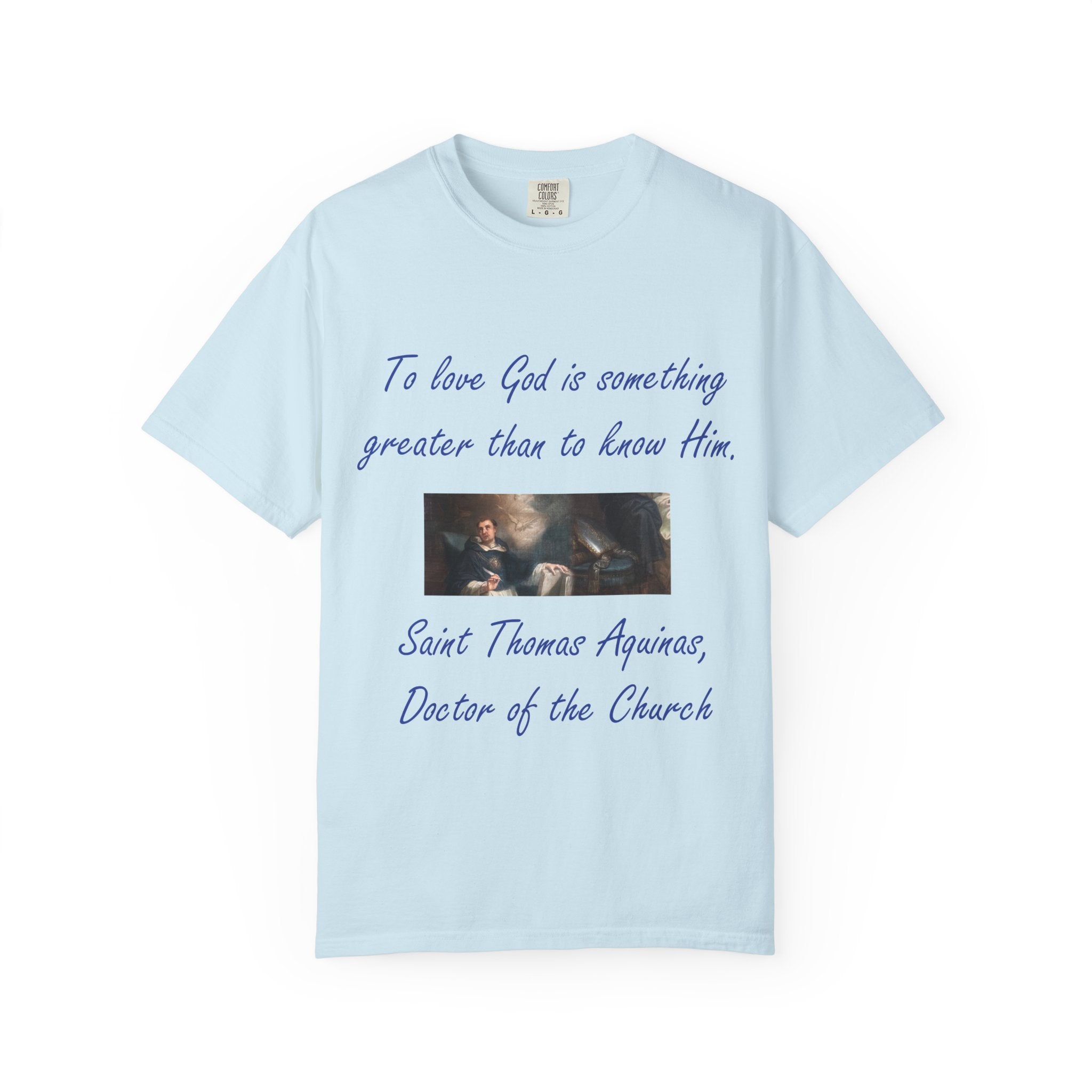 Celebrate wisdom and elegance with this Unisex Garment-Dyed T-shirt, featuring the inspiring quote from St. Thomas Aquinas: 'To love God is something greater than to know Him.' Crafted for those who value both comfort and meaningful design, this shirt boasts a relaxed fit that’s perfect for casual outings or semi-formal occasions.