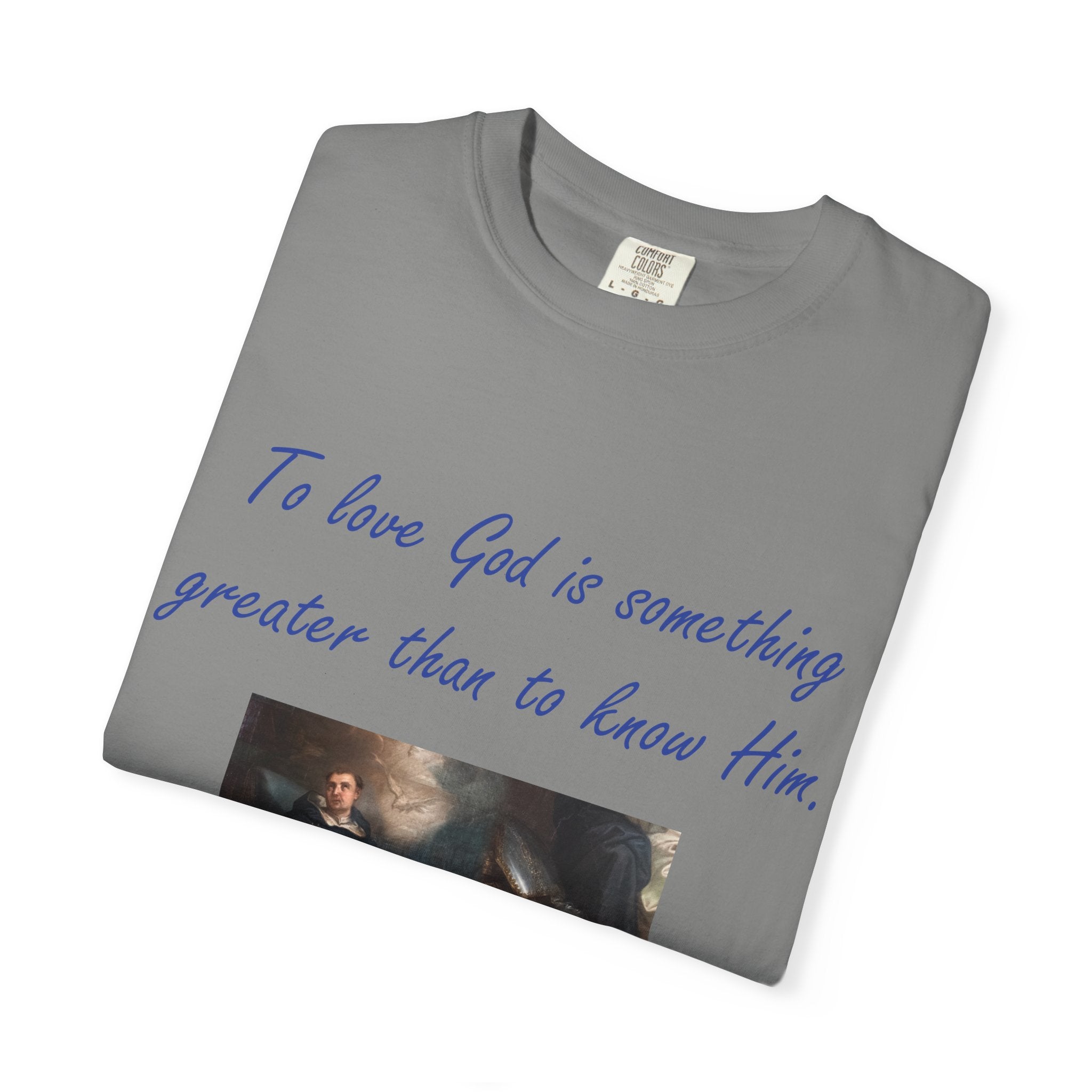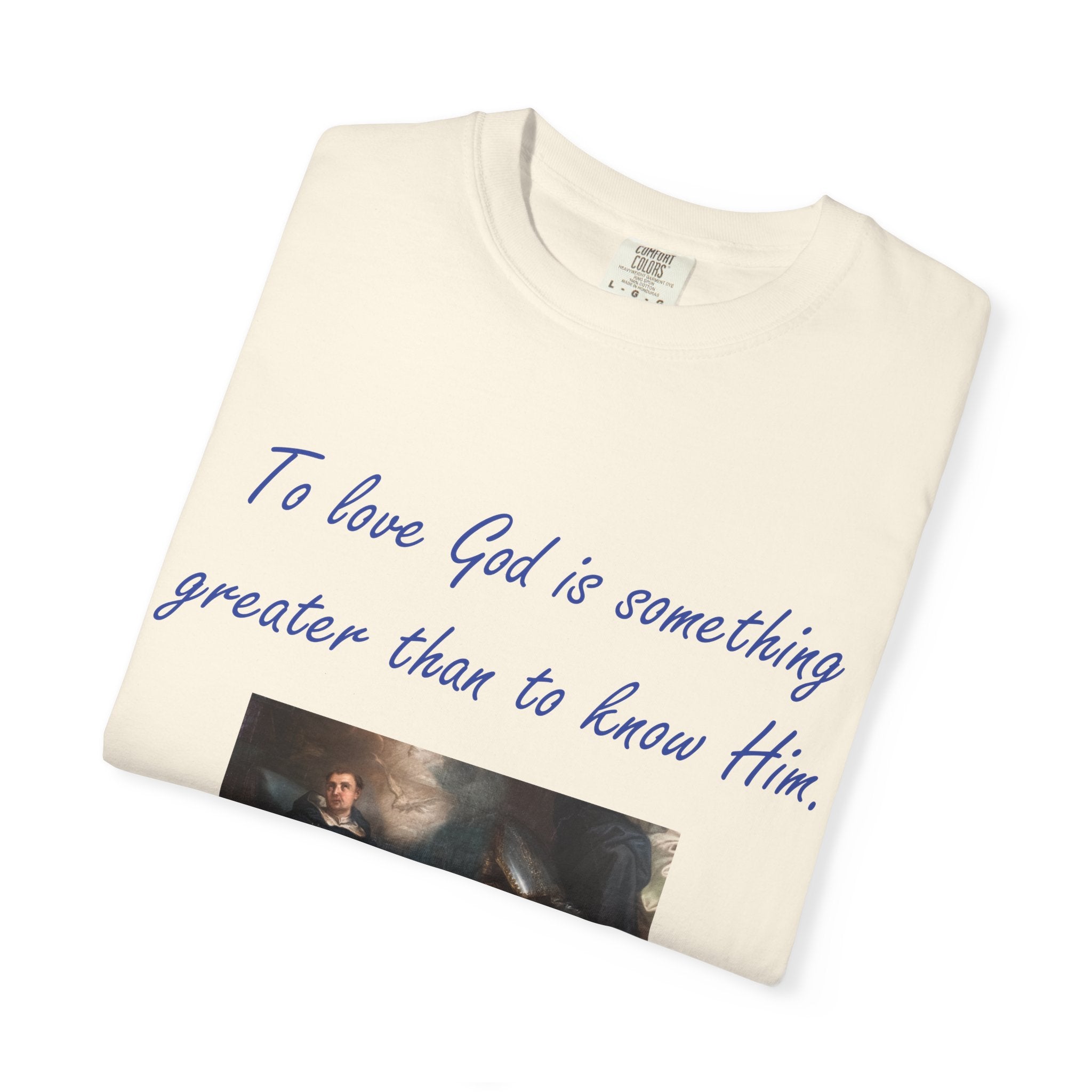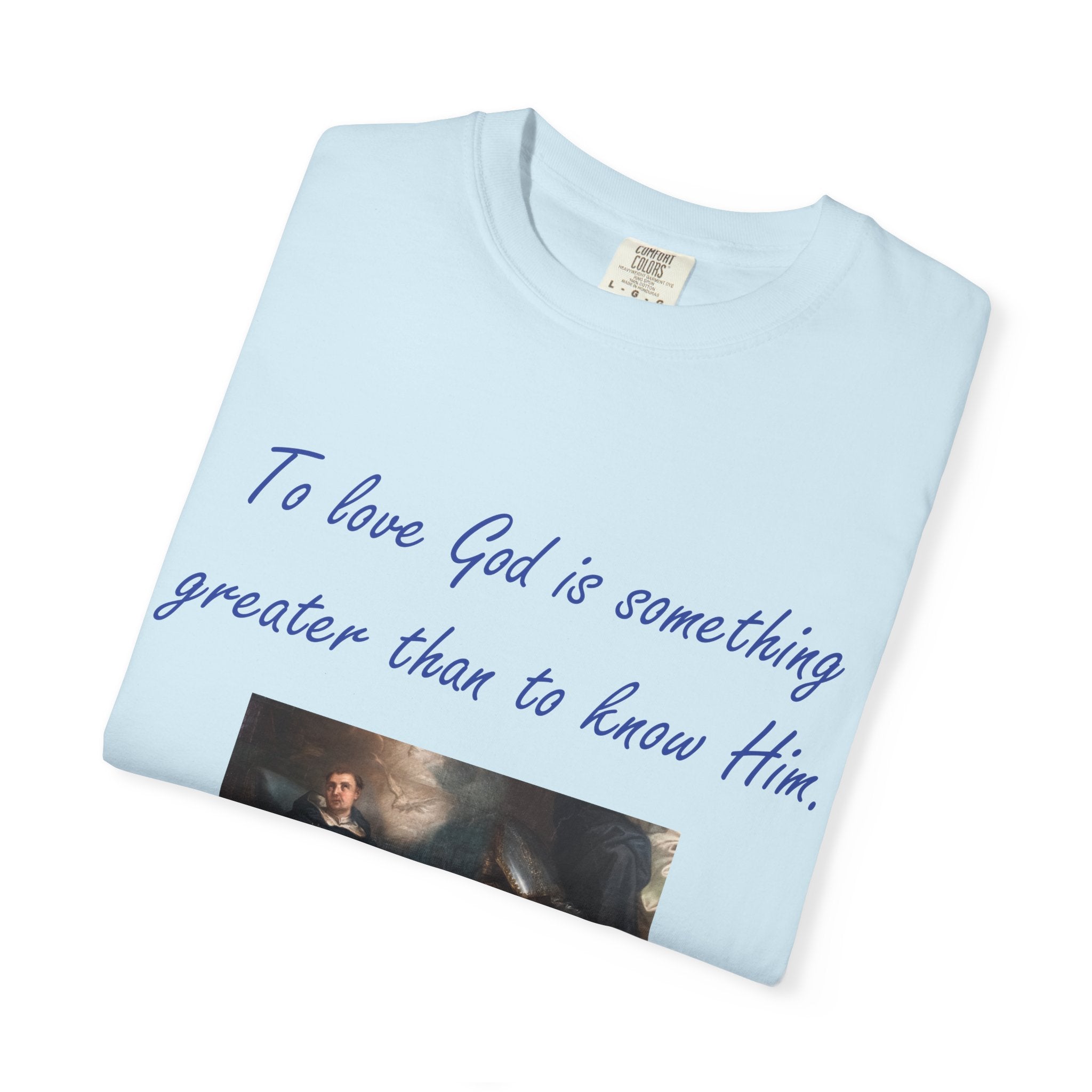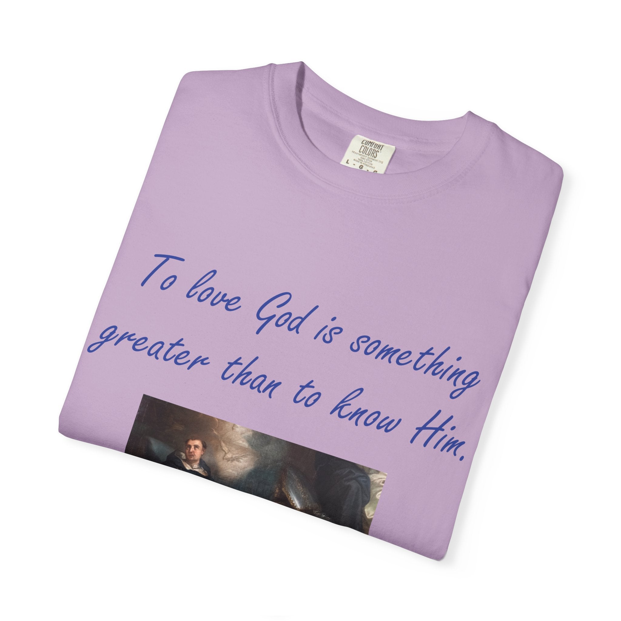 Celebrate wisdom and elegance with this Unisex Garment-Dyed T-shirt, featuring the inspiring quote from St. Thomas Aquinas: 'To love God is something greater than to know Him.' Crafted for those who value both comfort and meaningful design, this shirt boasts a relaxed fit that’s perfect for casual outings or semi-formal occasions.