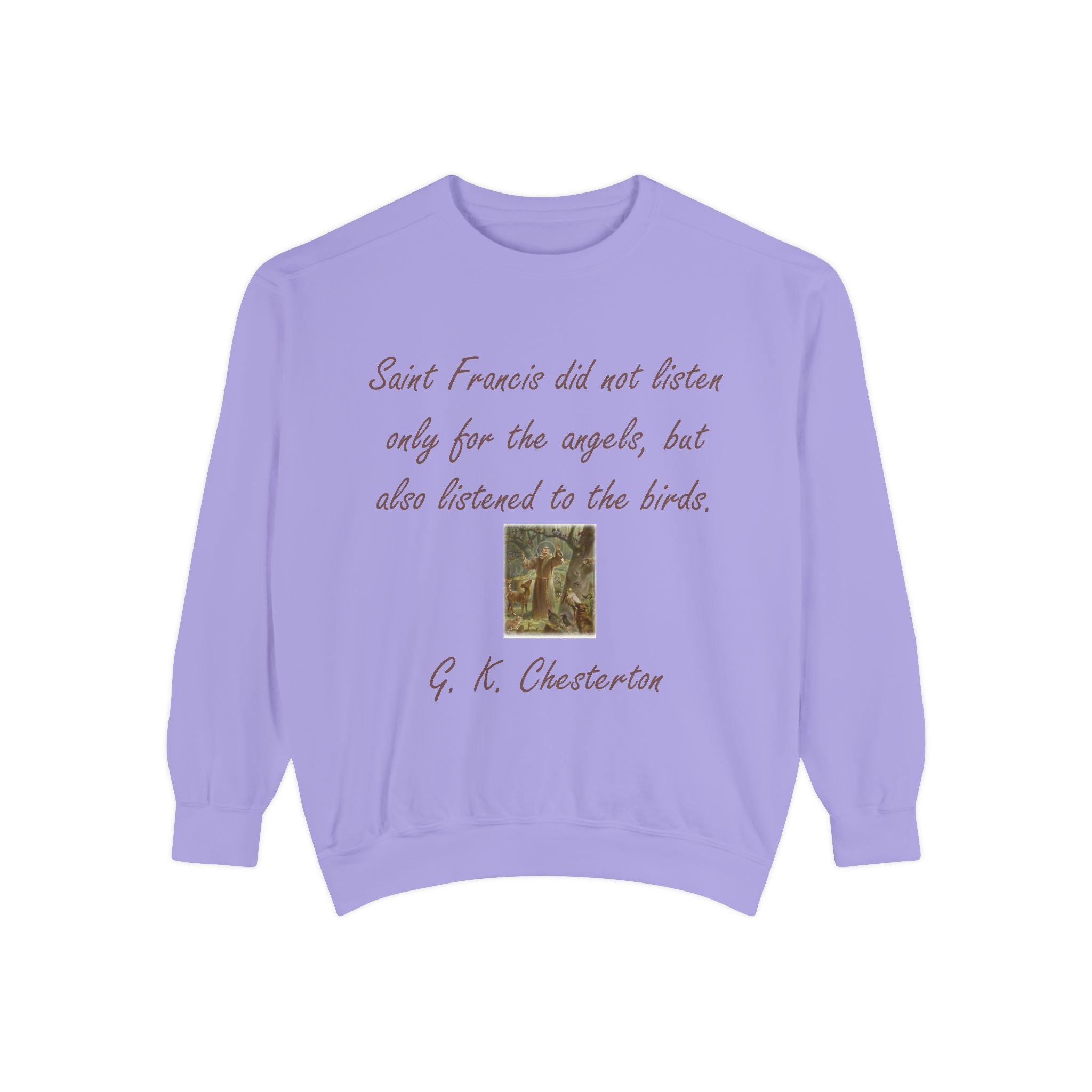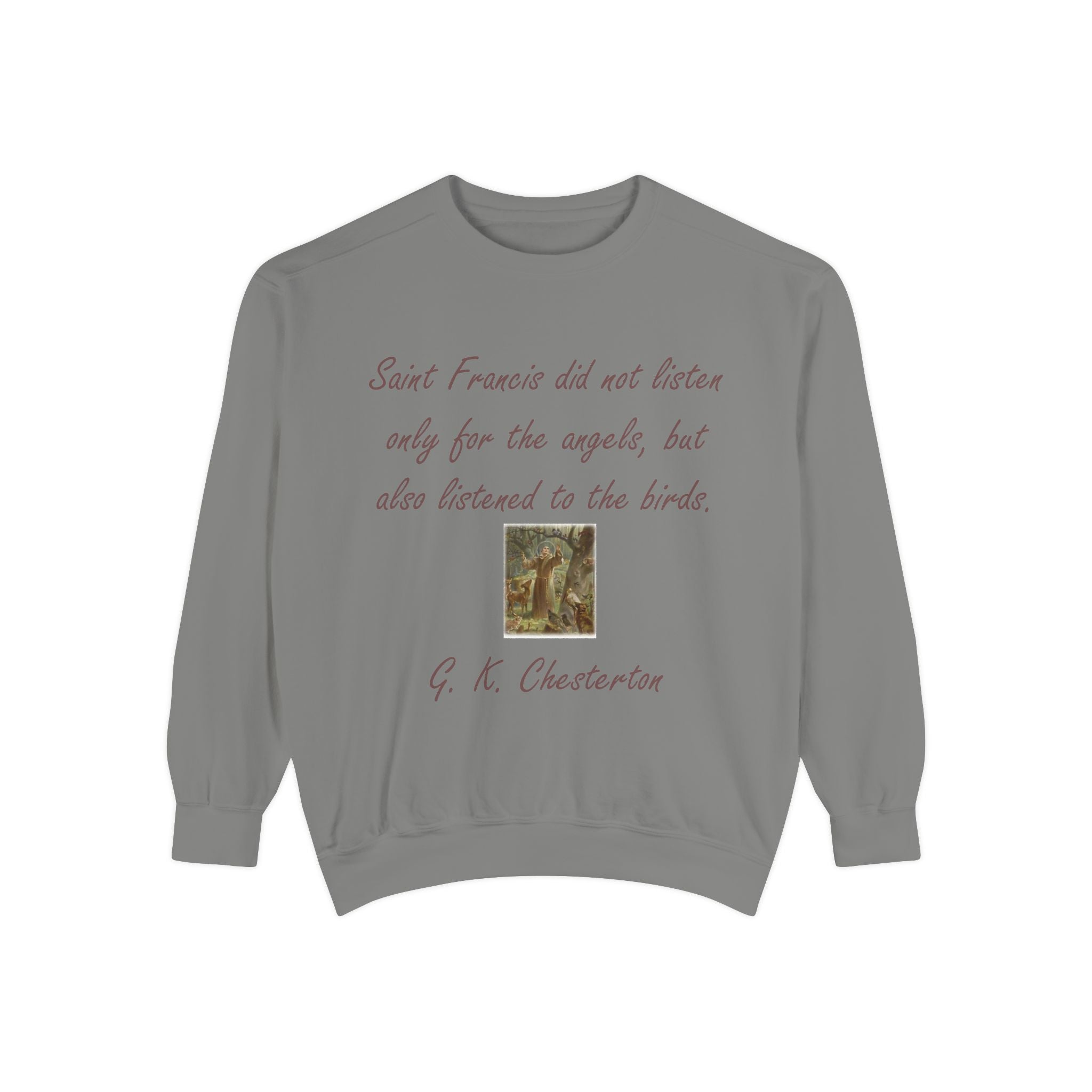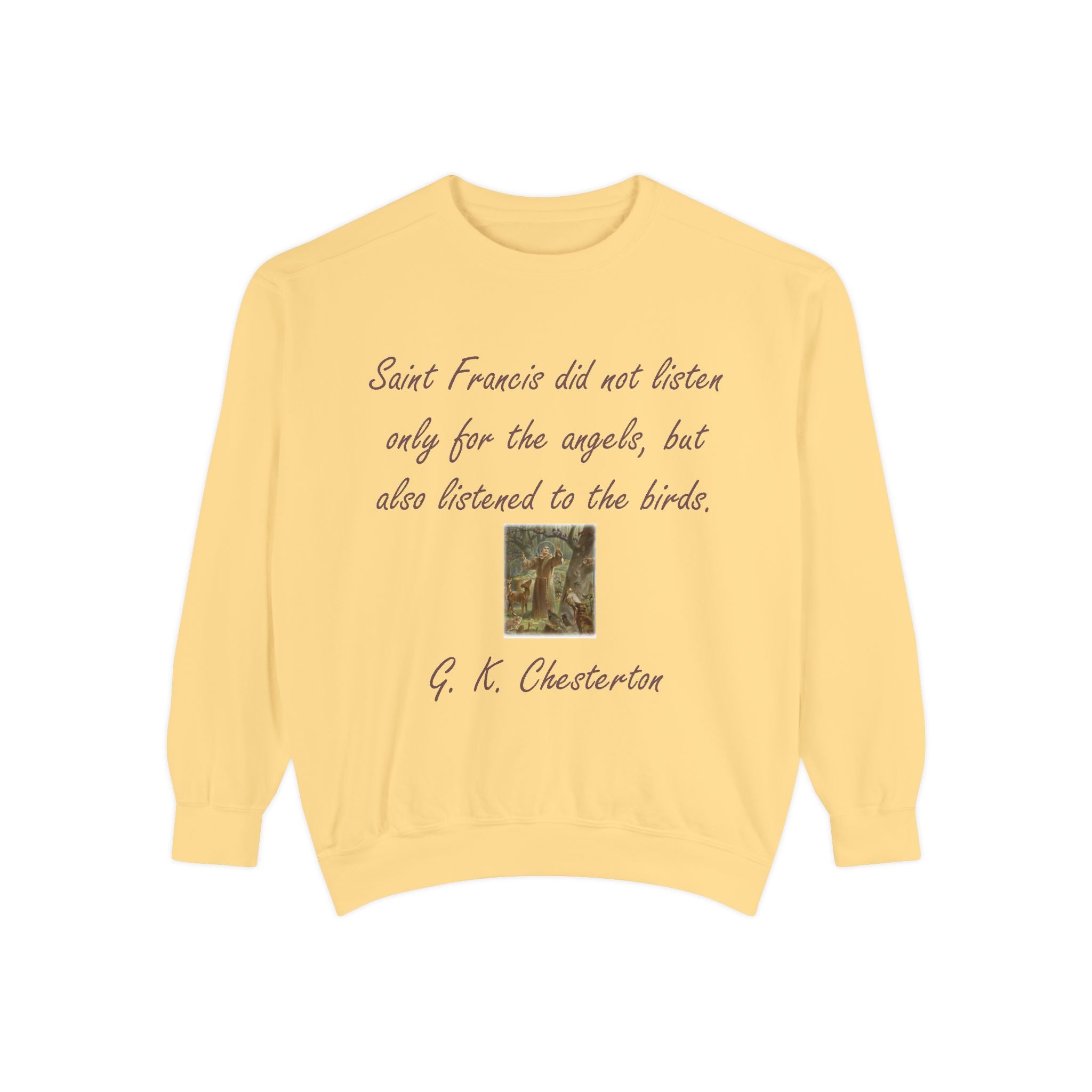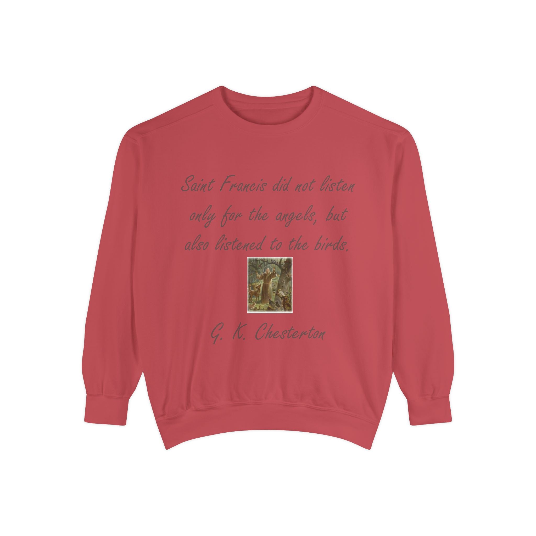 Stay cozy and inspired with this Unisex Garment-Dyed Sweatshirt, featuring a serene illustration of St. Francis of Assisi surrounded by animals, paired with G.K. Chesterton’s heartfelt quote: “Saint Francis did not listen only for the angels, but also listened to the birds.” This design captures the harmony between faith and the natural world, making it more than just a piece of clothing—it’s a meaningful expression of connection and wisdom.