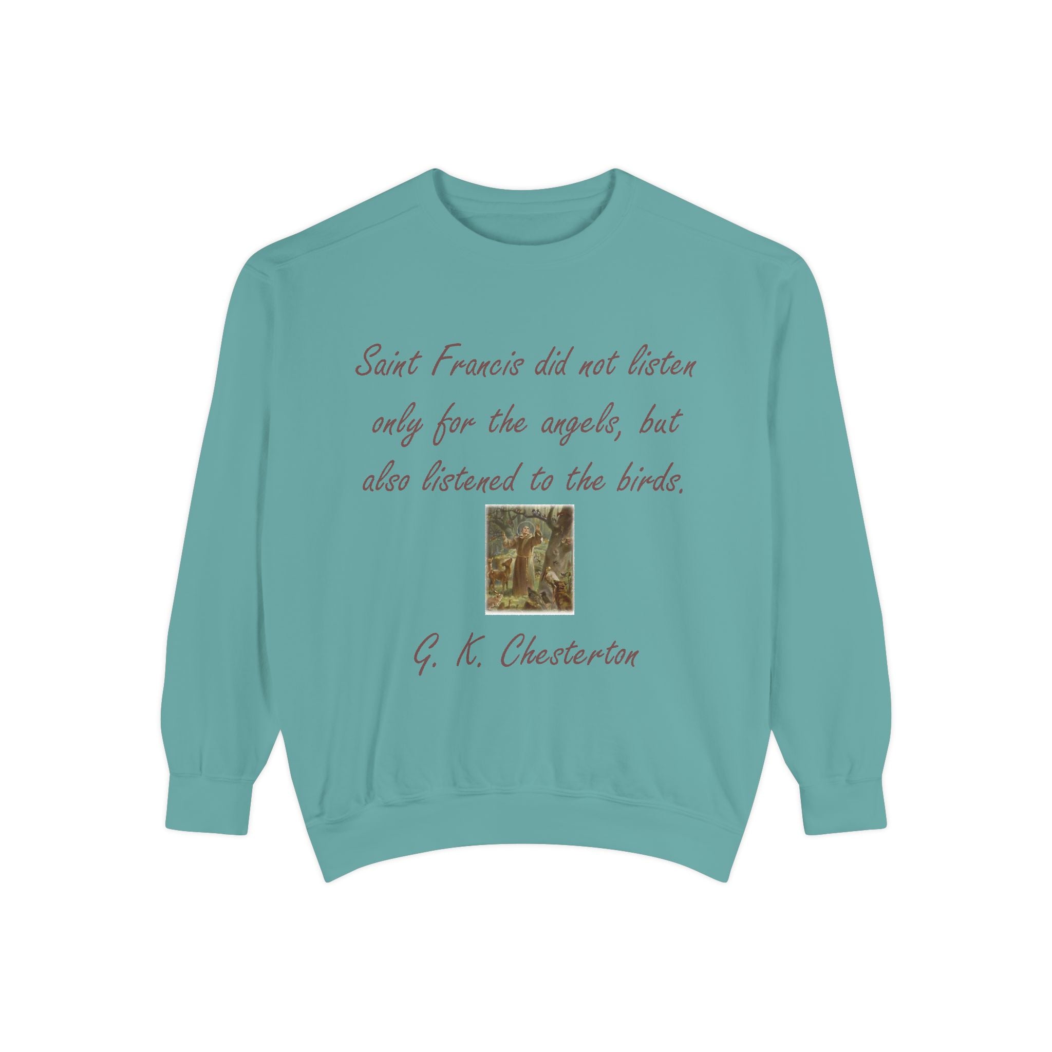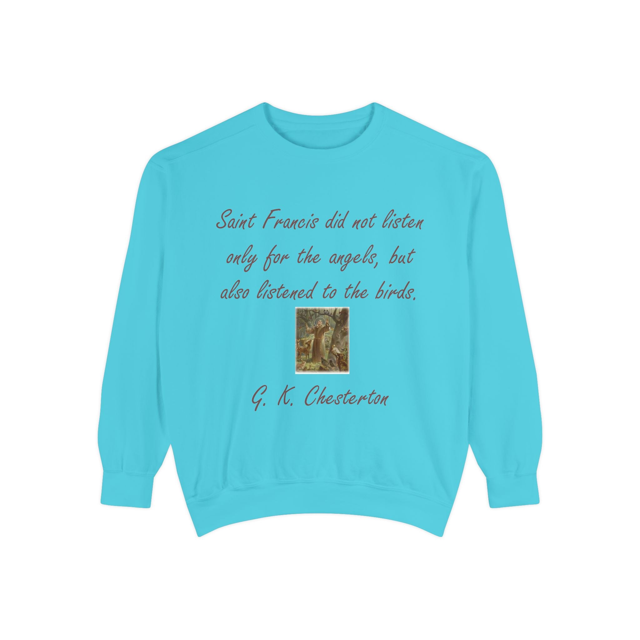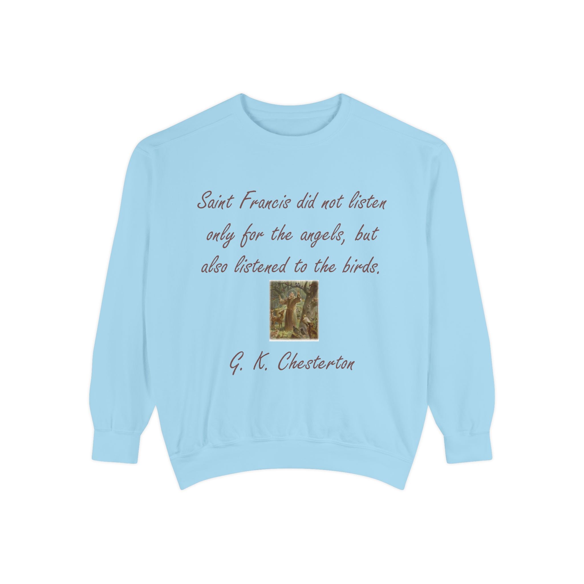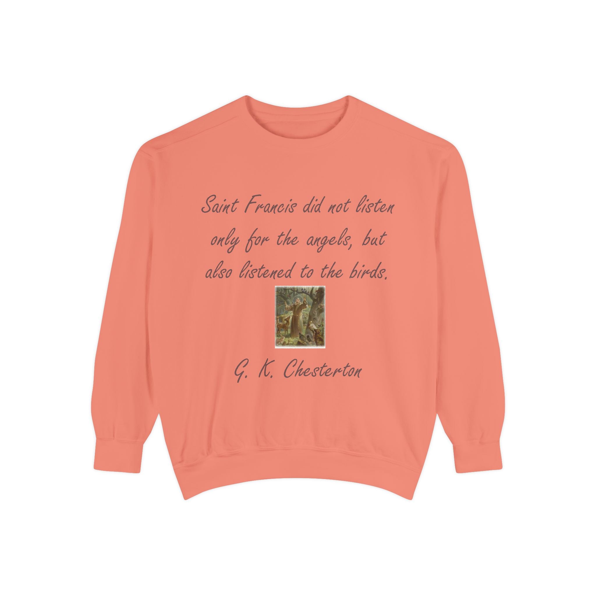 Stay cozy and inspired with this Unisex Garment-Dyed Sweatshirt, featuring a serene illustration of St. Francis of Assisi surrounded by animals, paired with G.K. Chesterton’s heartfelt quote: “Saint Francis did not listen only for the angels, but also listened to the birds.” This design captures the harmony between faith and the natural world, making it more than just a piece of clothing—it’s a meaningful expression of connection and wisdom.