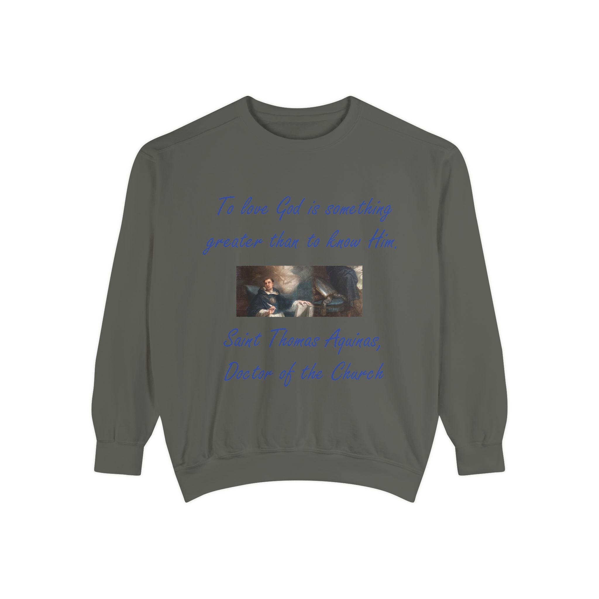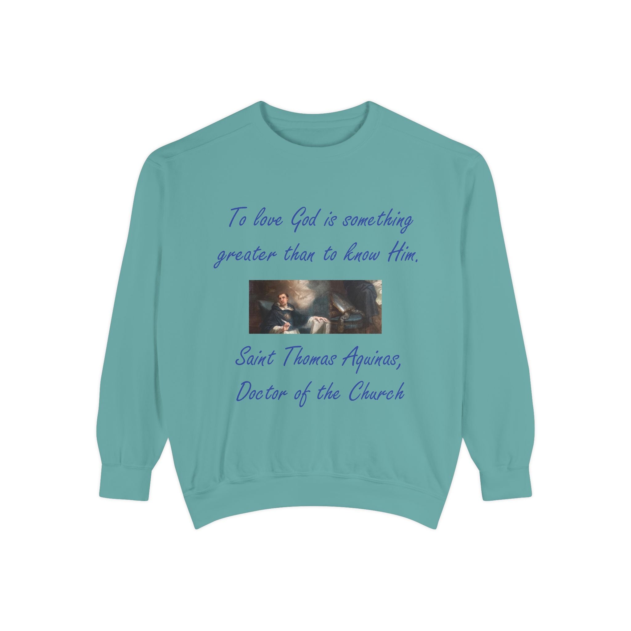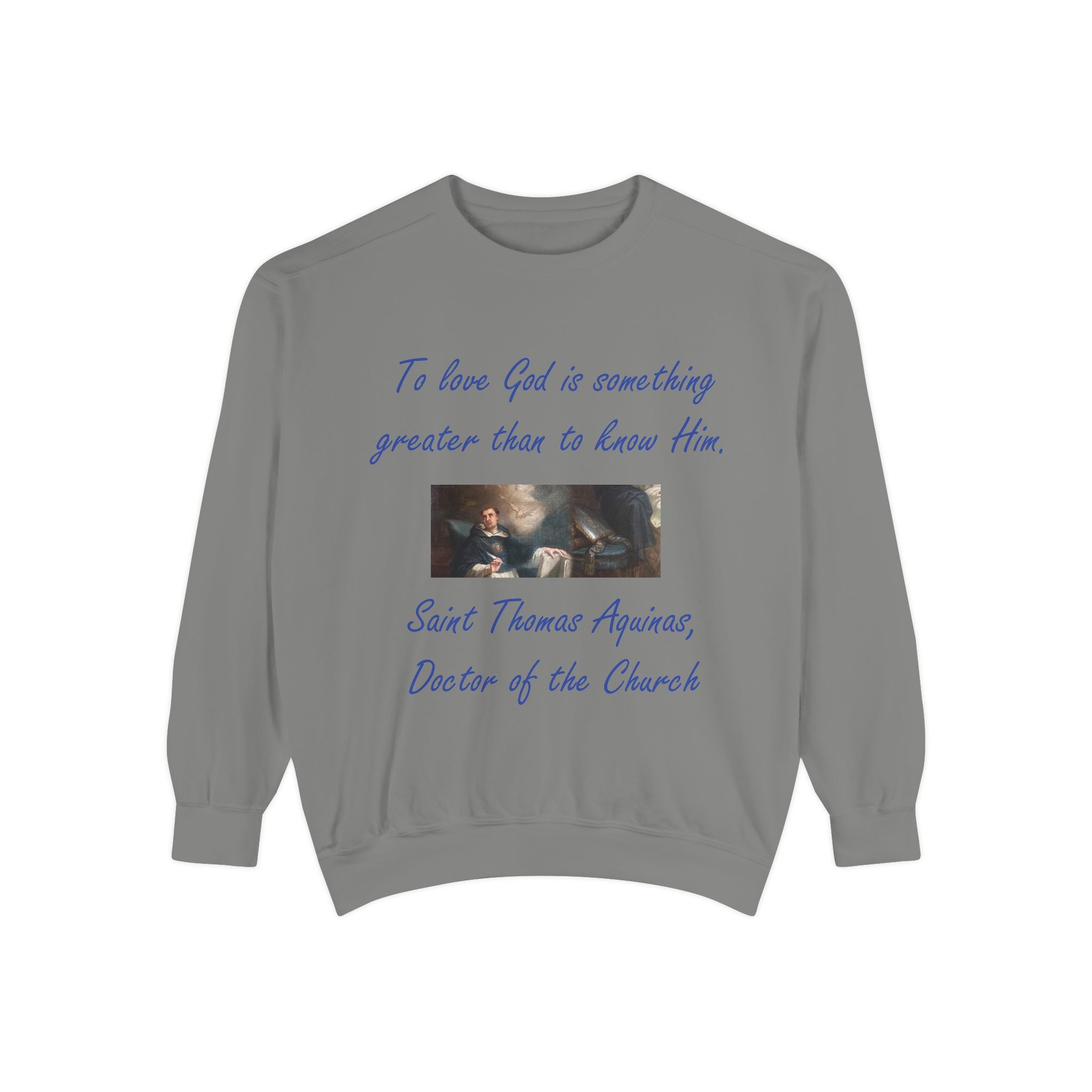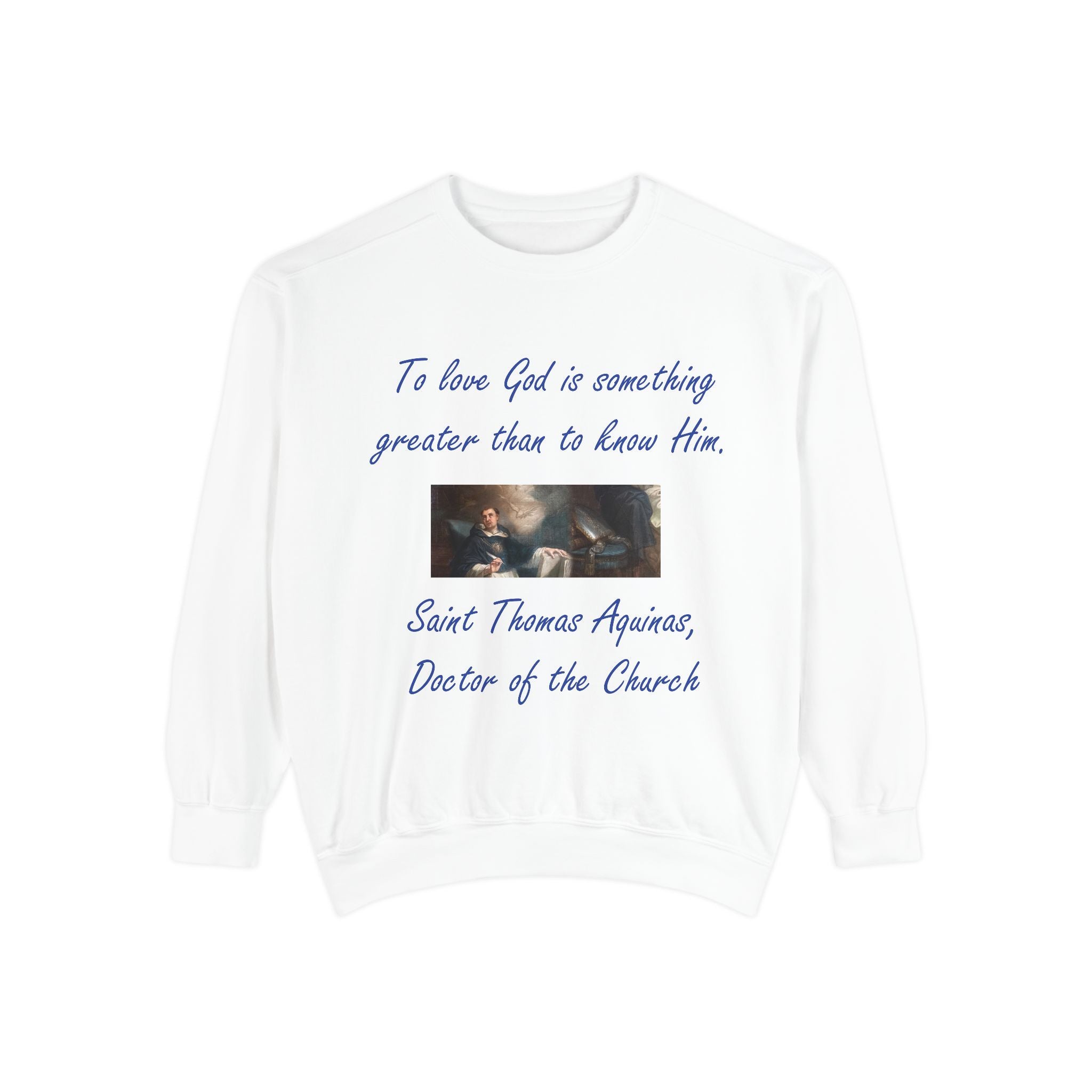 Wrap yourself in comfort and inspiration with this Unisex Sweatshirt, featuring the timeless wisdom of St. Thomas Aquinas: 'To love God is something greater than to know Him.' Crafted from a soft blend of 80% cotton and 20% polyester, this sweatshirt offers a luxurious feel and a relaxed yet chic aesthetic, perfect for cozy evenings at home or casual outings with friends.