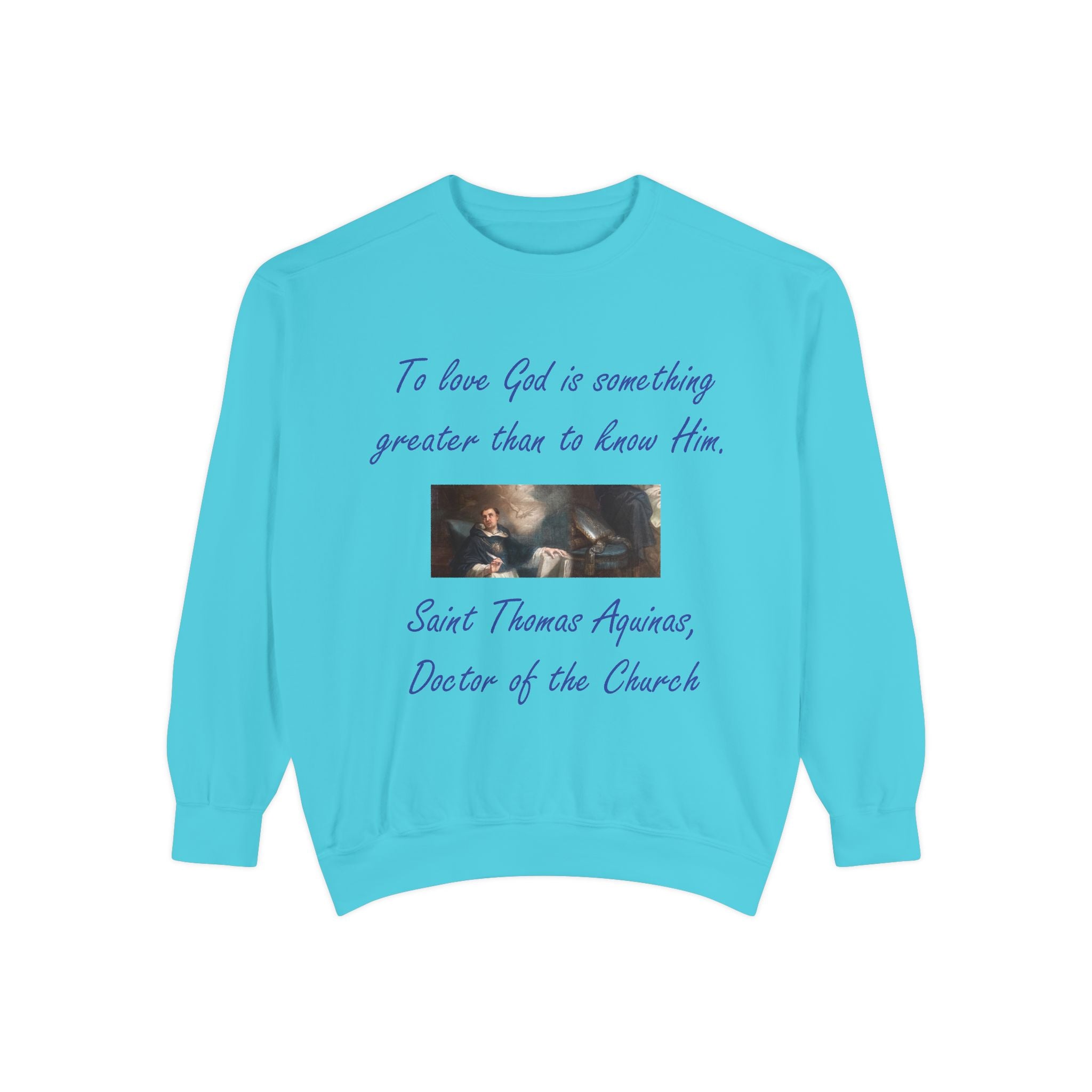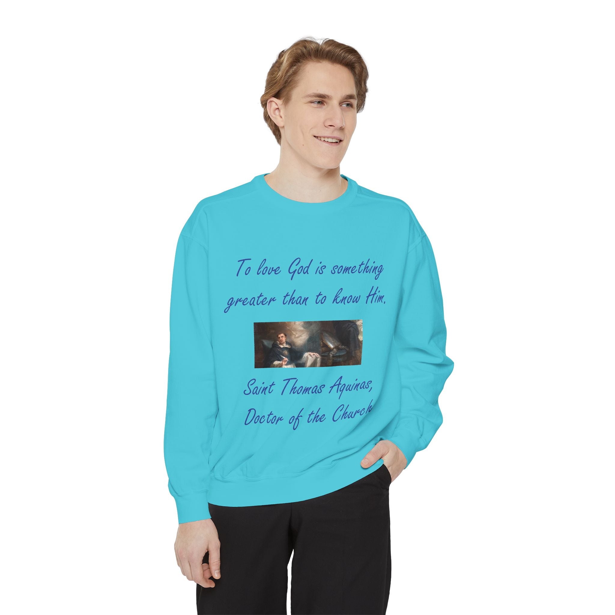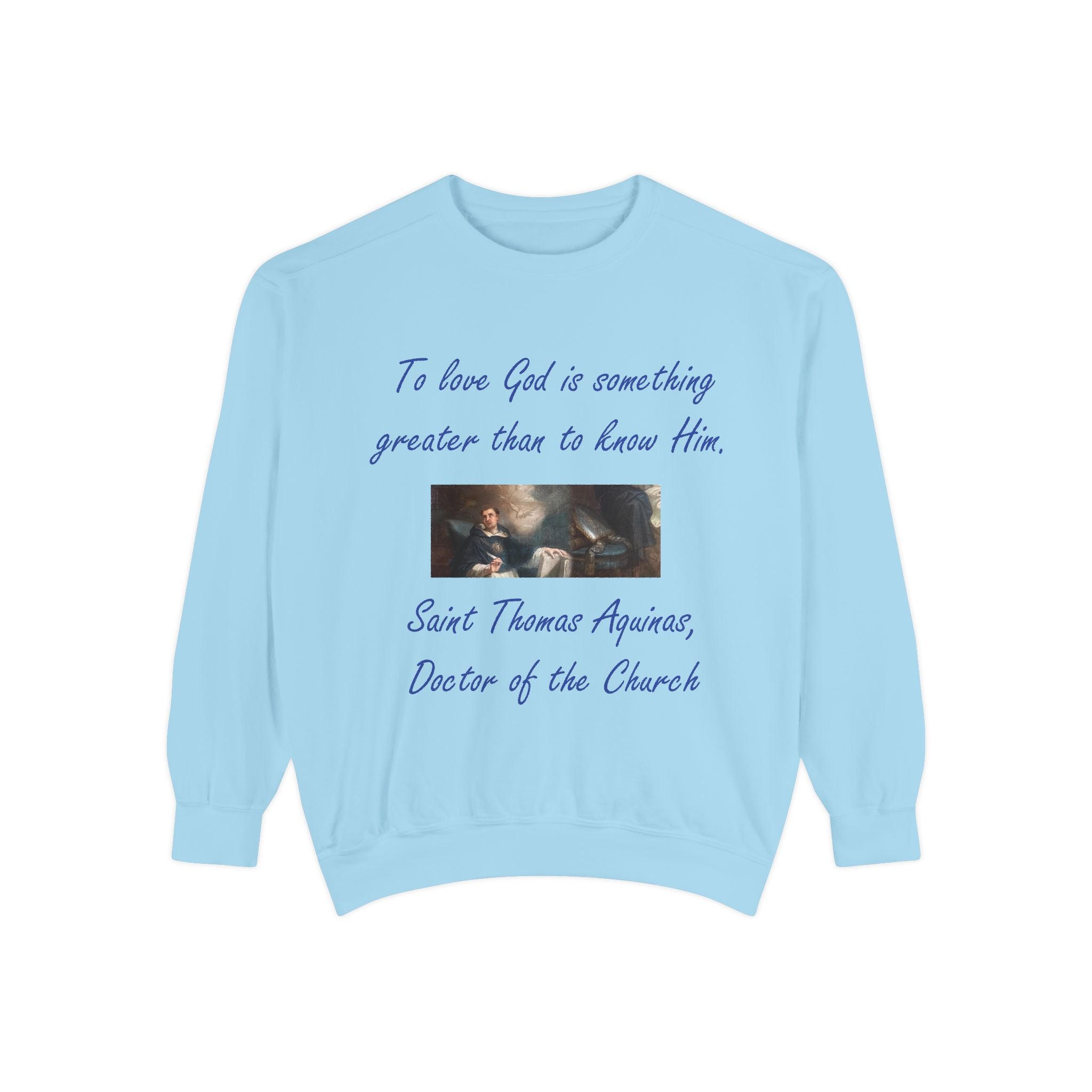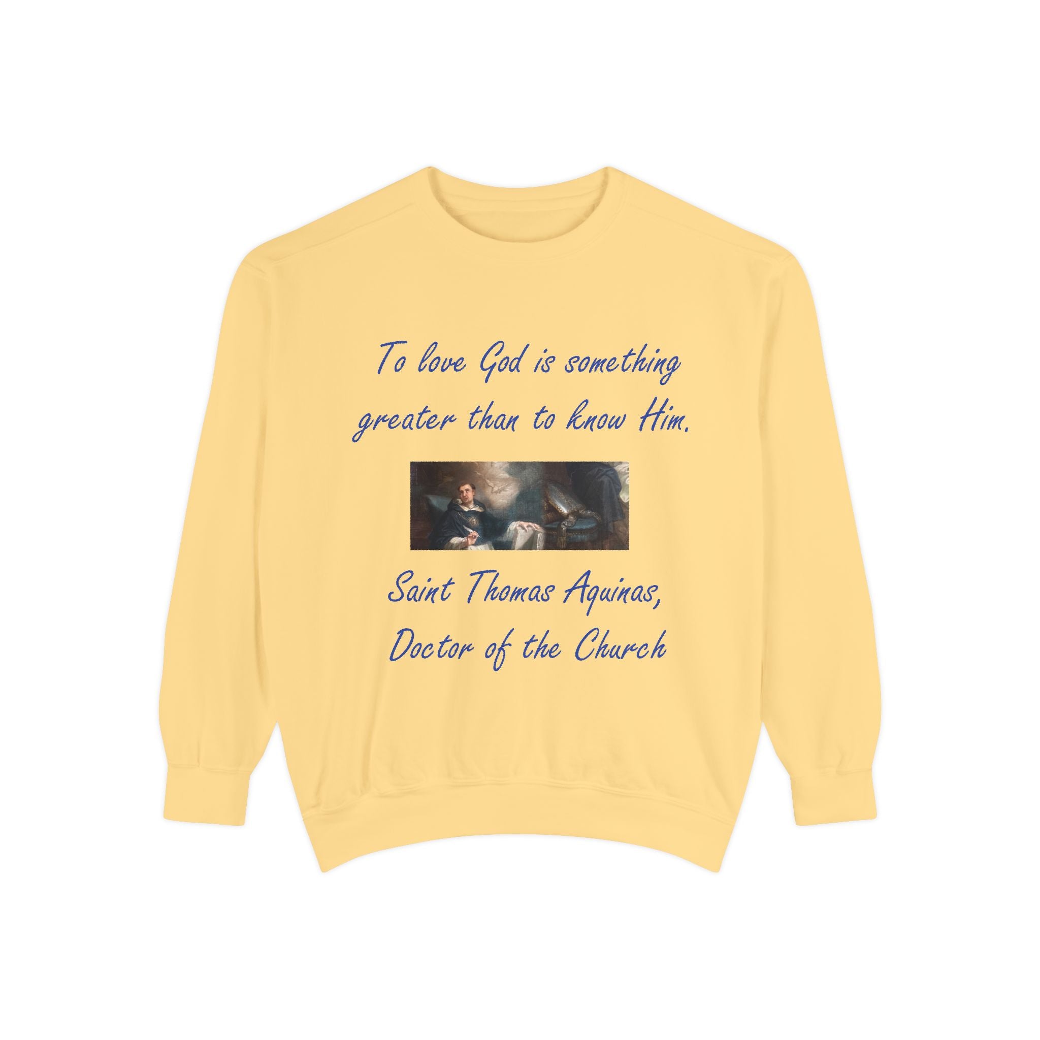 Wrap yourself in comfort and inspiration with this Unisex Sweatshirt, featuring the timeless wisdom of St. Thomas Aquinas: 'To love God is something greater than to know Him.' Crafted from a soft blend of 80% cotton and 20% polyester, this sweatshirt offers a luxurious feel and a relaxed yet chic aesthetic, perfect for cozy evenings at home or casual outings with friends.