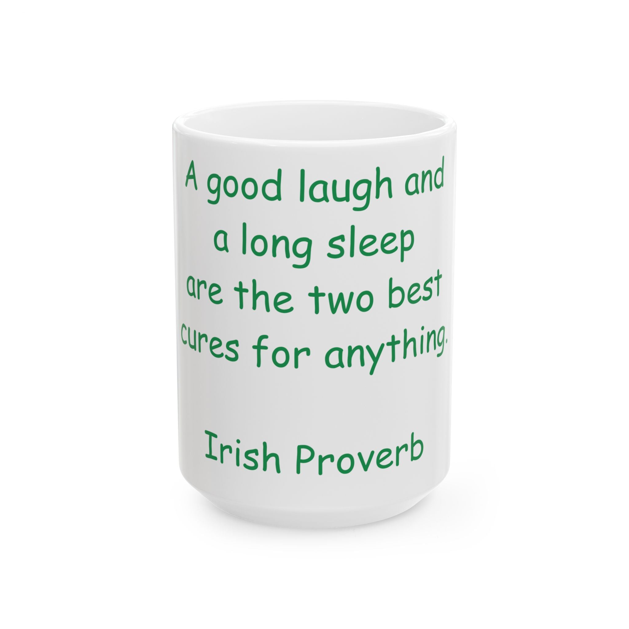 Embrace the wisdom of the ages with this Ceramic Mug, featuring the timeless Irish proverb: 'A good laugh and a long sleep are the two best cures for anything.' With its glossy finish and vibrant design, this mug brings warmth, humor, and a touch of elegance to your daily routine.