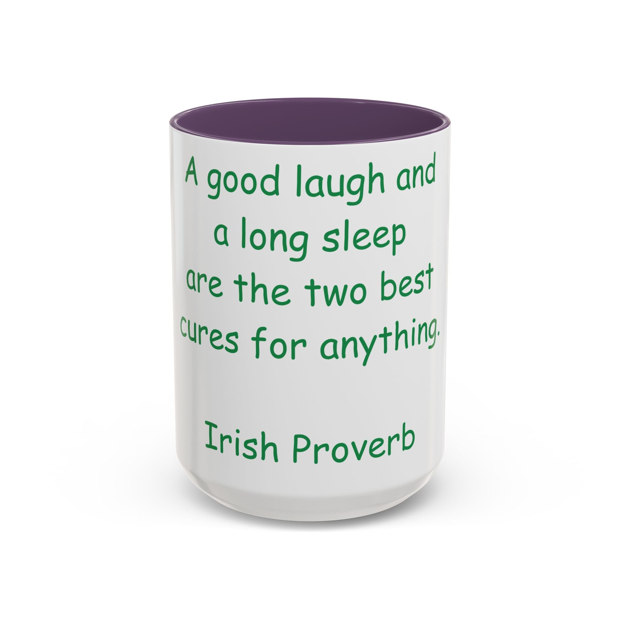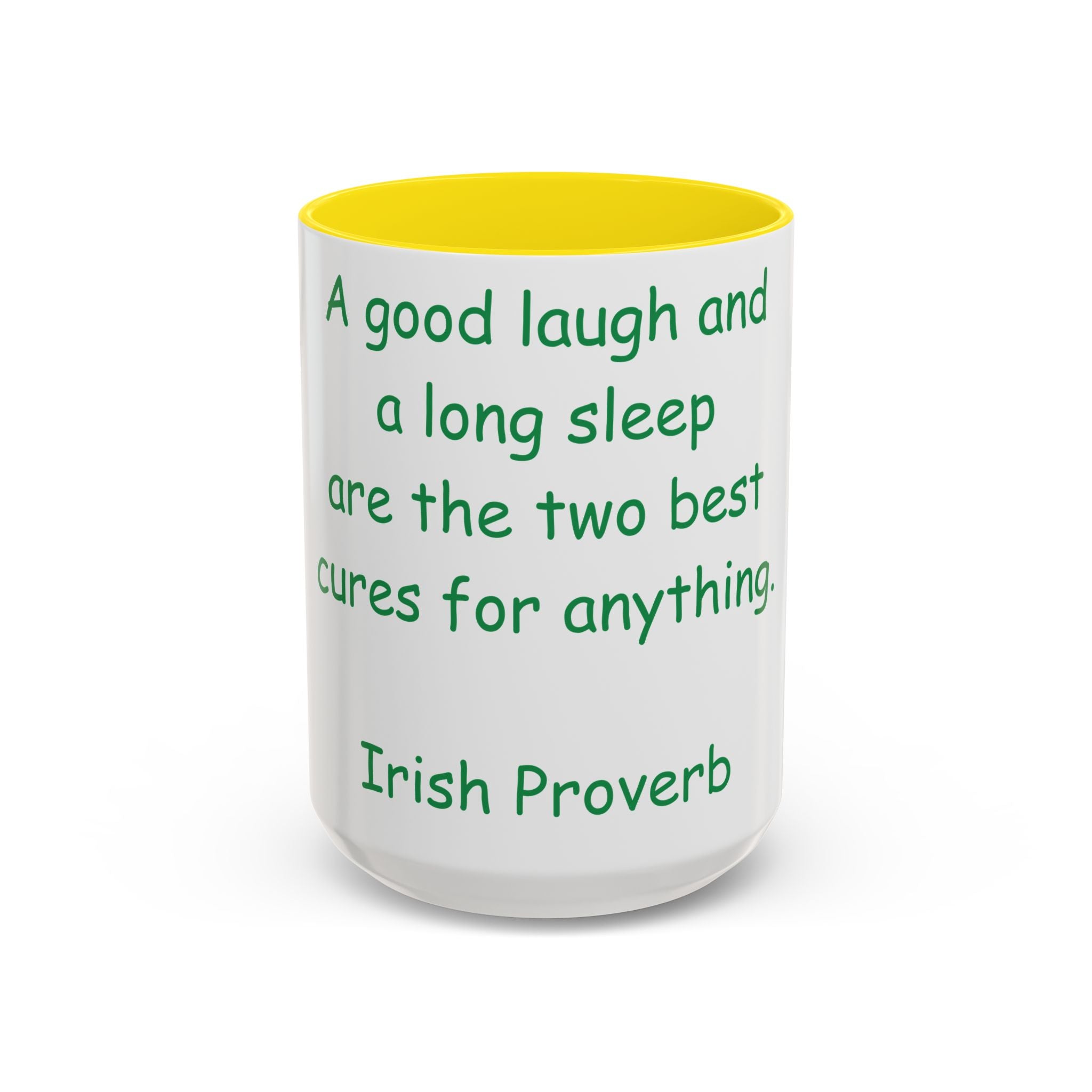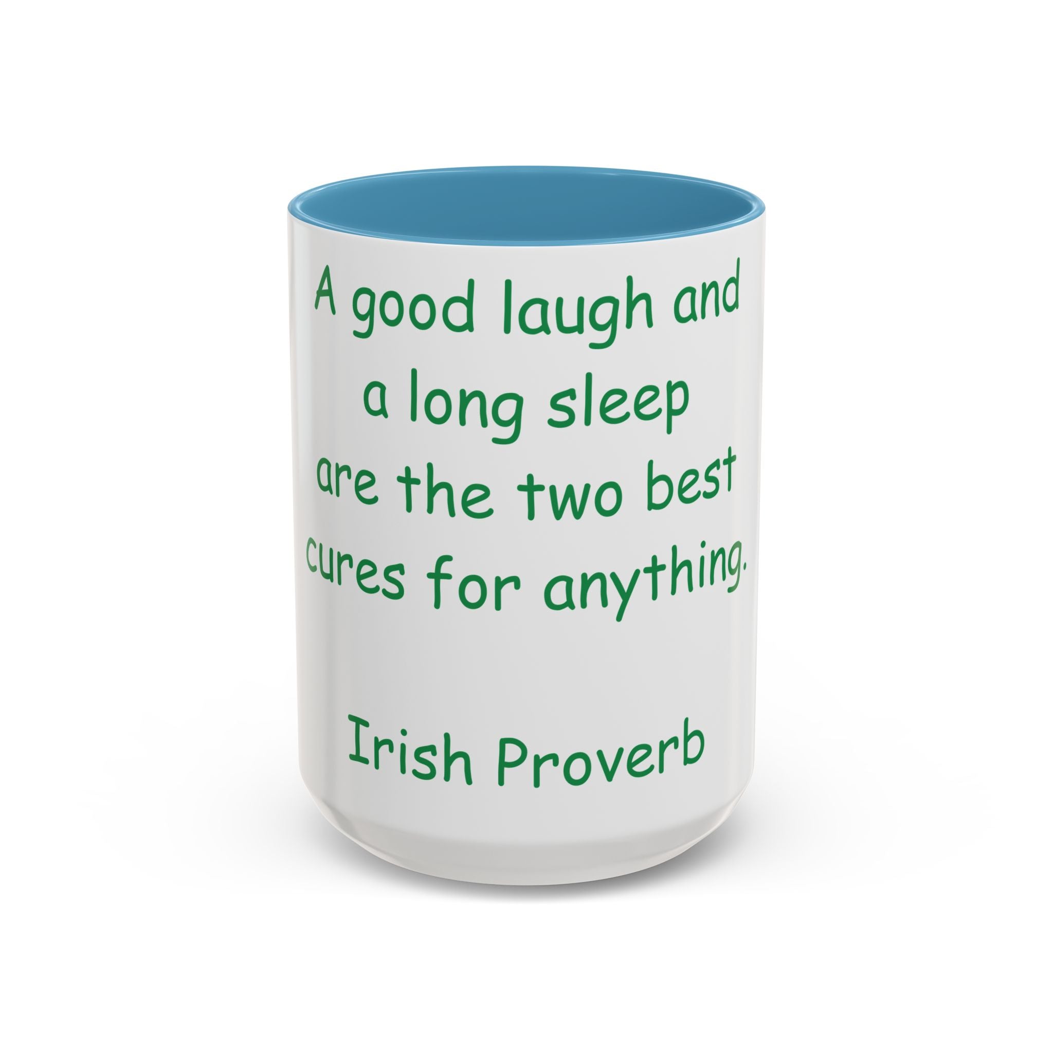 Begin your day with a touch of wisdom and charm. This vibrant Accent Coffee Mug features the timeless Irish proverb: 'A good laugh and a long sleep are the two best cures for anything.' Its glossy finish and bold interior colors make it an eye-catching addition to your kitchen or office, perfect for starting your mornings with warmth and inspiration.