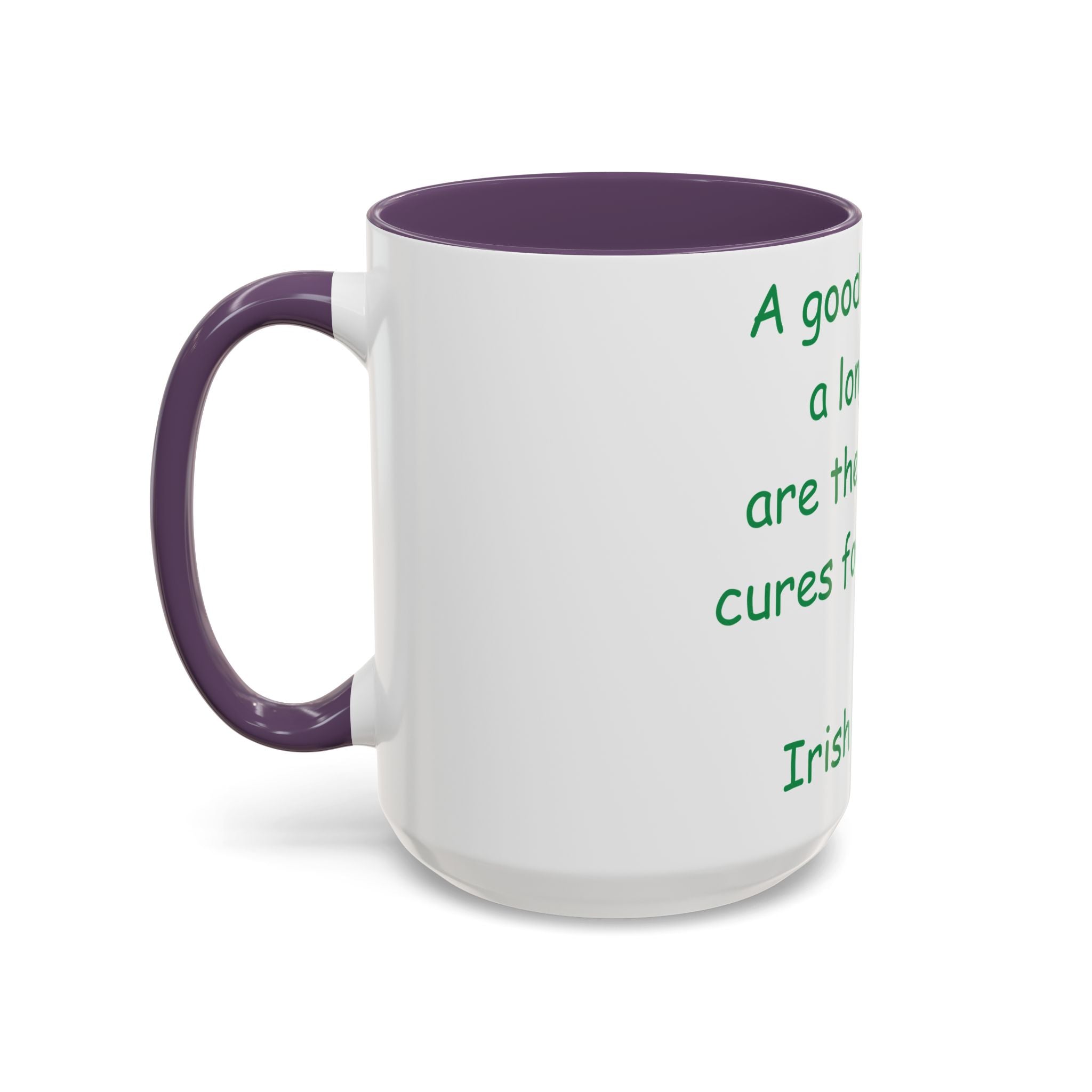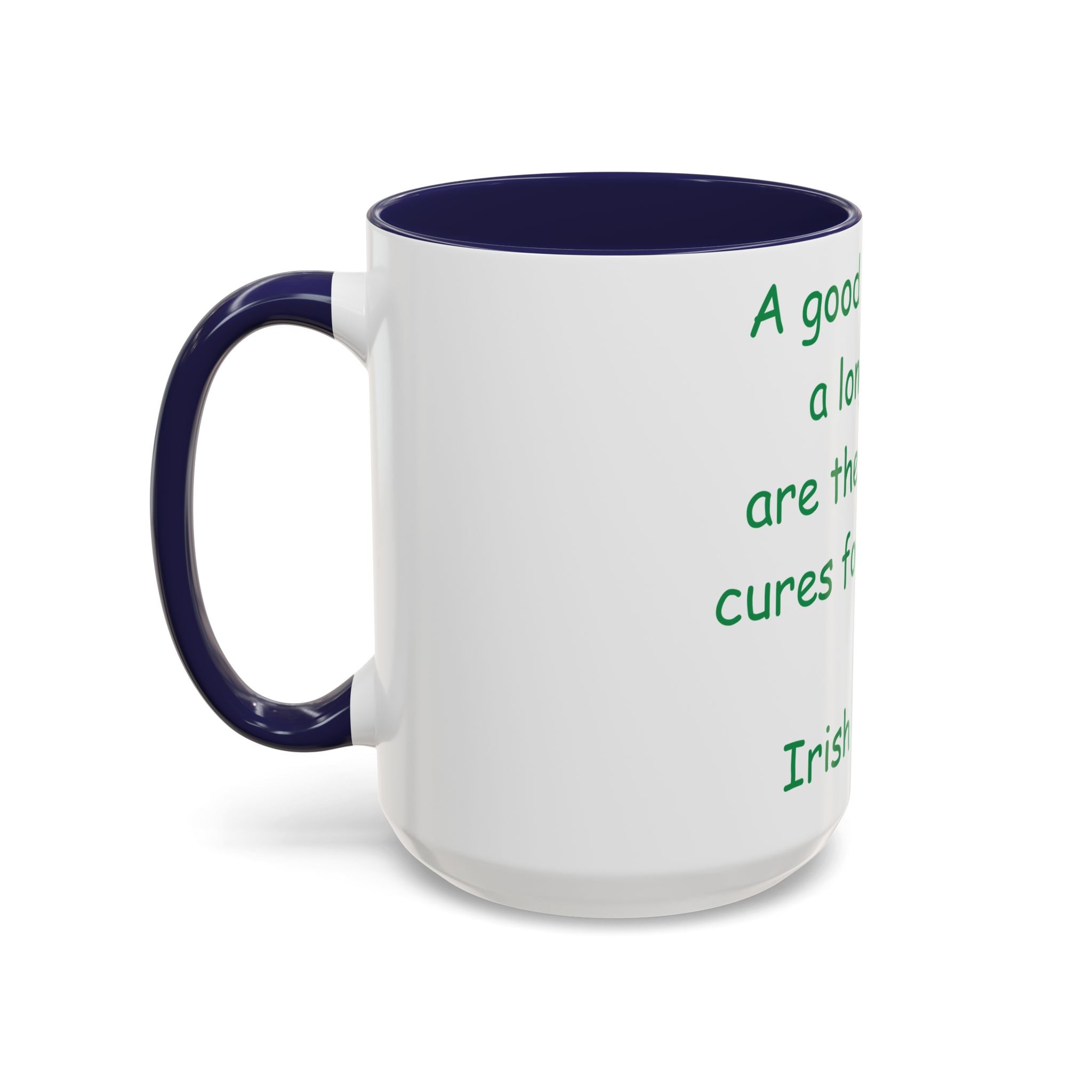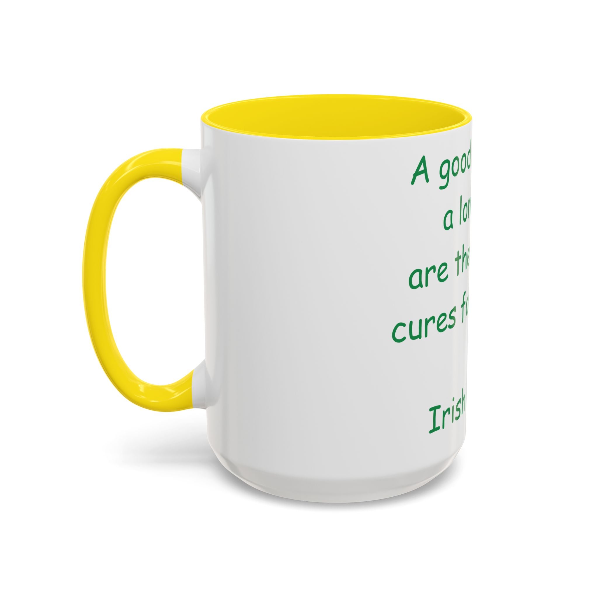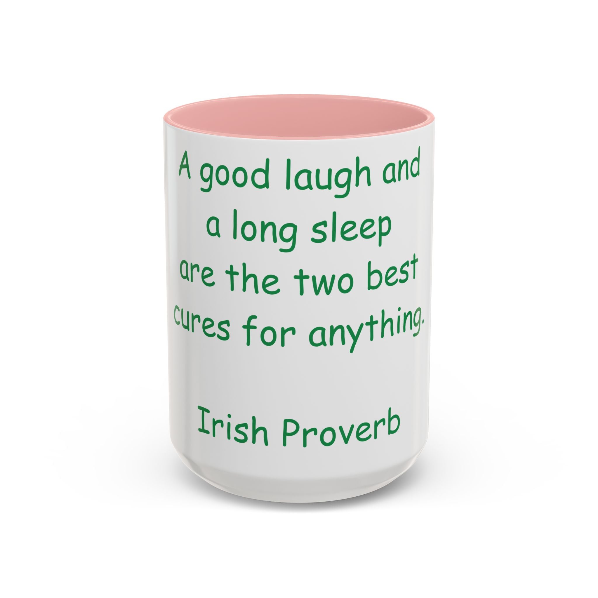 Begin your day with a touch of wisdom and charm. This vibrant Accent Coffee Mug features the timeless Irish proverb: 'A good laugh and a long sleep are the two best cures for anything.' Its glossy finish and bold interior colors make it an eye-catching addition to your kitchen or office, perfect for starting your mornings with warmth and inspiration.