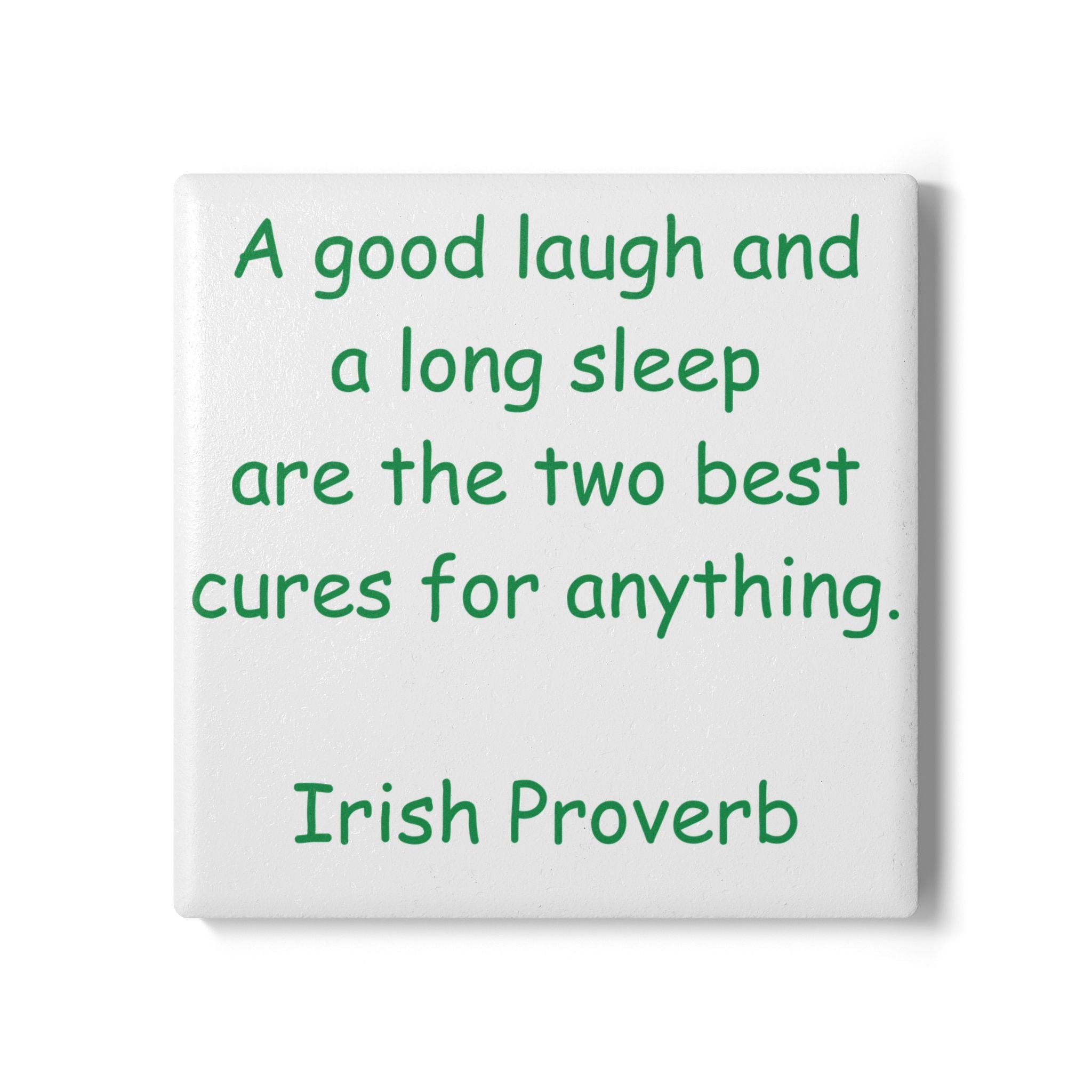 Enjoy your favorite drinks while embracing a little Irish charm! This ceramic coaster highlights the enduring wisdom of the Irish proverb: "A good laugh and a long sleep are the two best cures for anything." Thoughtfully crafted with a cork backing, it provides both protection and style, making it a meaningful gift or personal keepsake.
