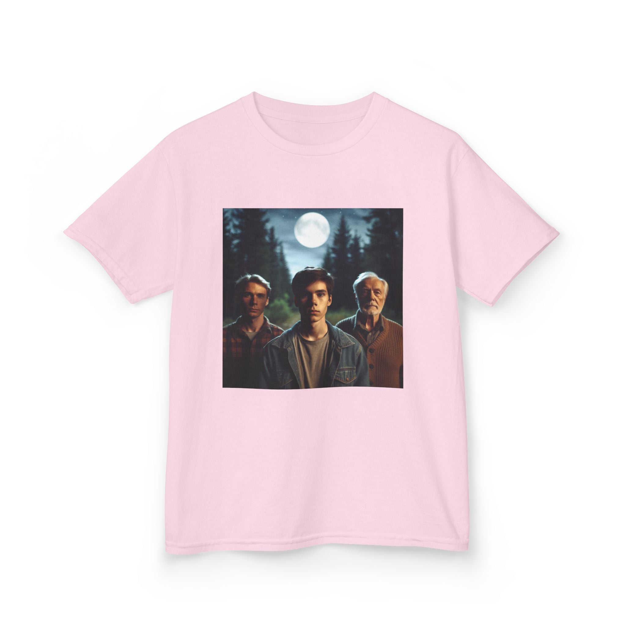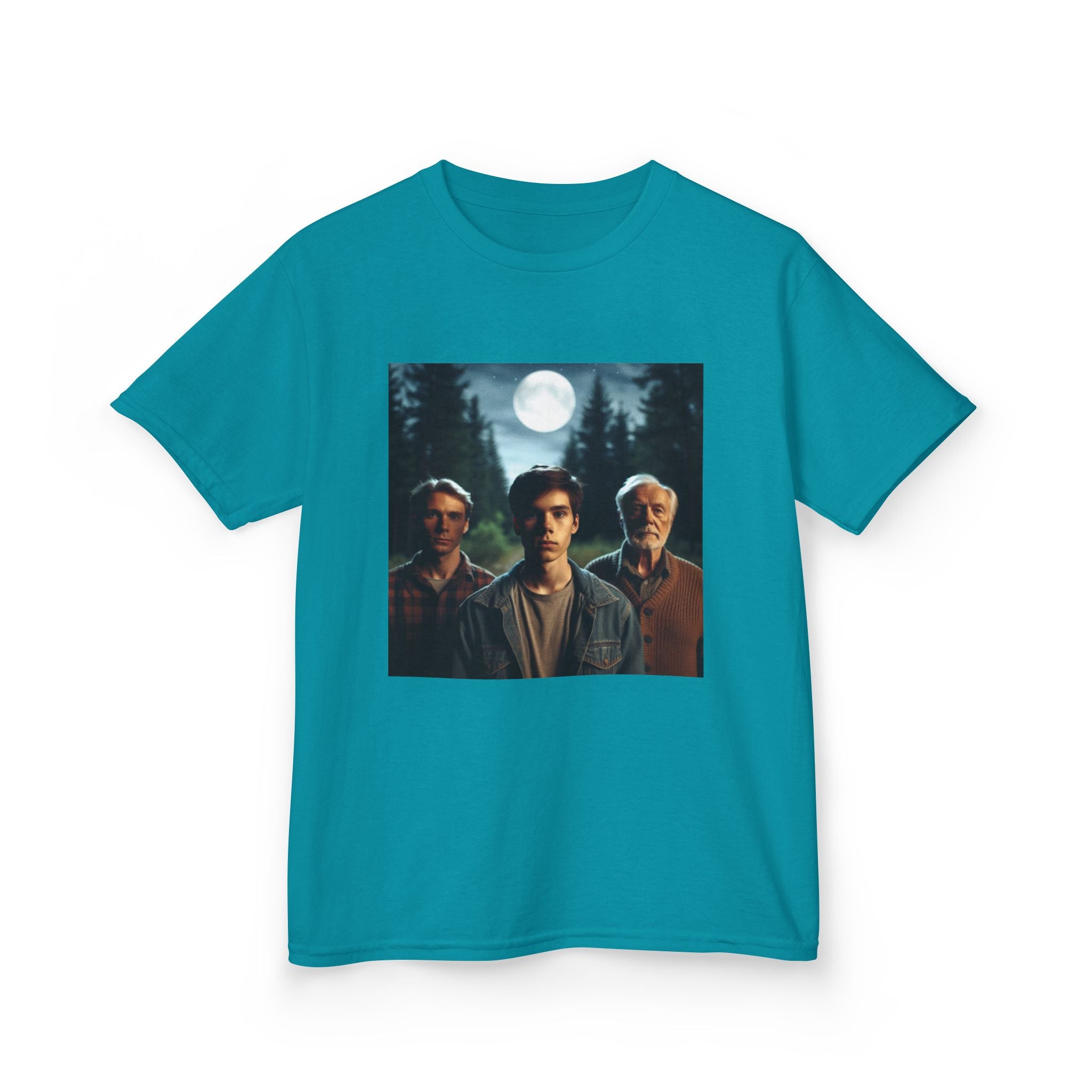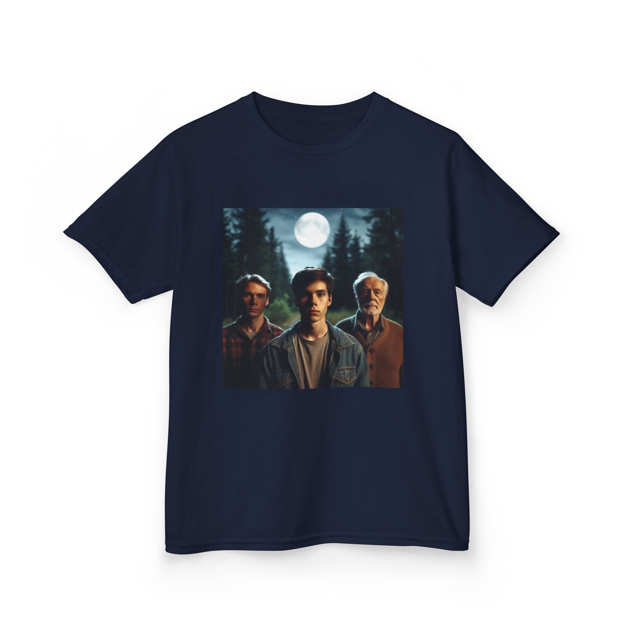 Spark imagination and celebrate connection with this Kids Heavy Cotton™ Tee, featuring an extraordinary AI-generated design inspired by the Wiccan God in his three aspects: the Youth, Father, and Sage. Set in a tranquil forest clearing beneath a luminous full moon, the artwork vividly portrays the timeless balance of youth, maturity, and wisdom. Moonlight gently illuminates the figures, emphasizing their bond with nature and the spiritual energies of the night, evoking harmony and reverence for the cycles of life.