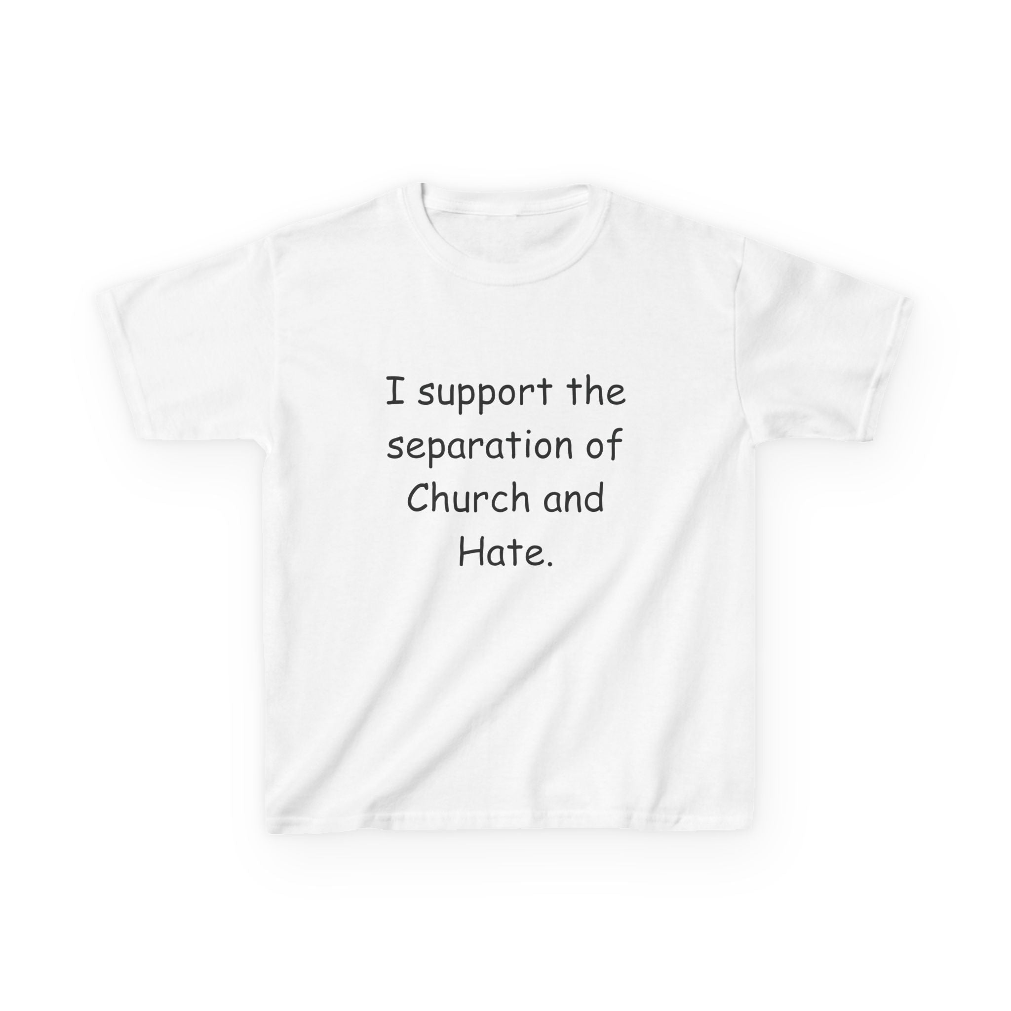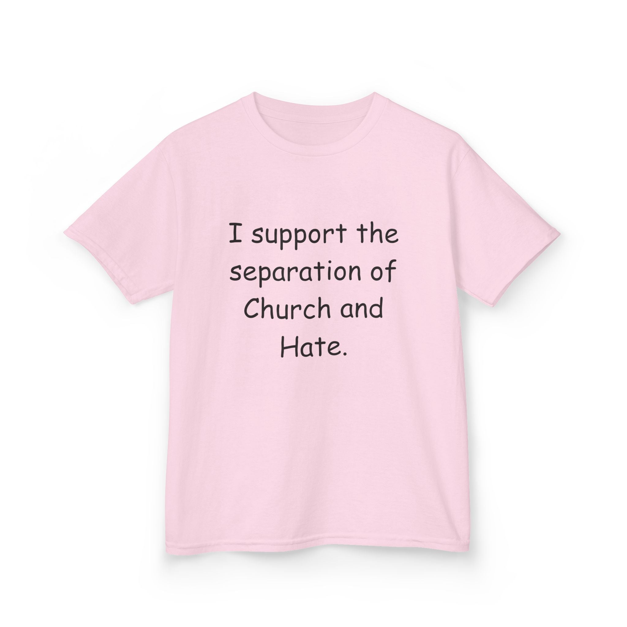 Empower young advocates with this kids' T-shirt featuring the bold statement: 'I support the separation of Church and Hate.' Crafted from 100% US cotton, this tee offers both comfort and style for everyday wear. Its soft fabric and classic crew neckline make it ideal for playdates, family gatherings, or simply relaxing at home. More than just clothing, this design promotes inclusivity, equality, and self-expression, encouraging children to wear their values proudly.