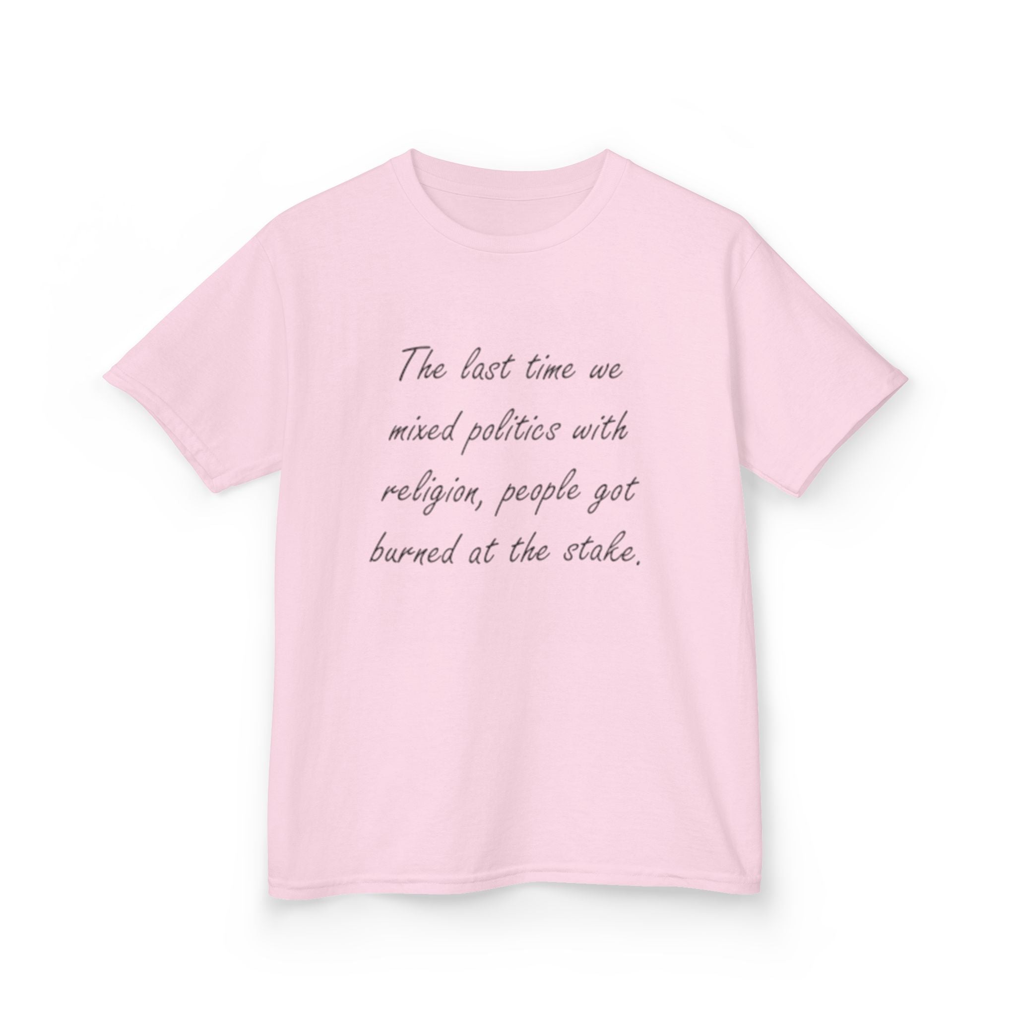 Empower young minds and spark thoughtful conversations with this Kids Heavy Cotton™ Tee, featuring a bold and reflective design: "The last time we mixed politics with religion, people got burned at the stake." This tee challenges historical injustices, offering a powerful reminder of the dangers of intertwining politics and religion while honoring those who suffered during the Burning Times.