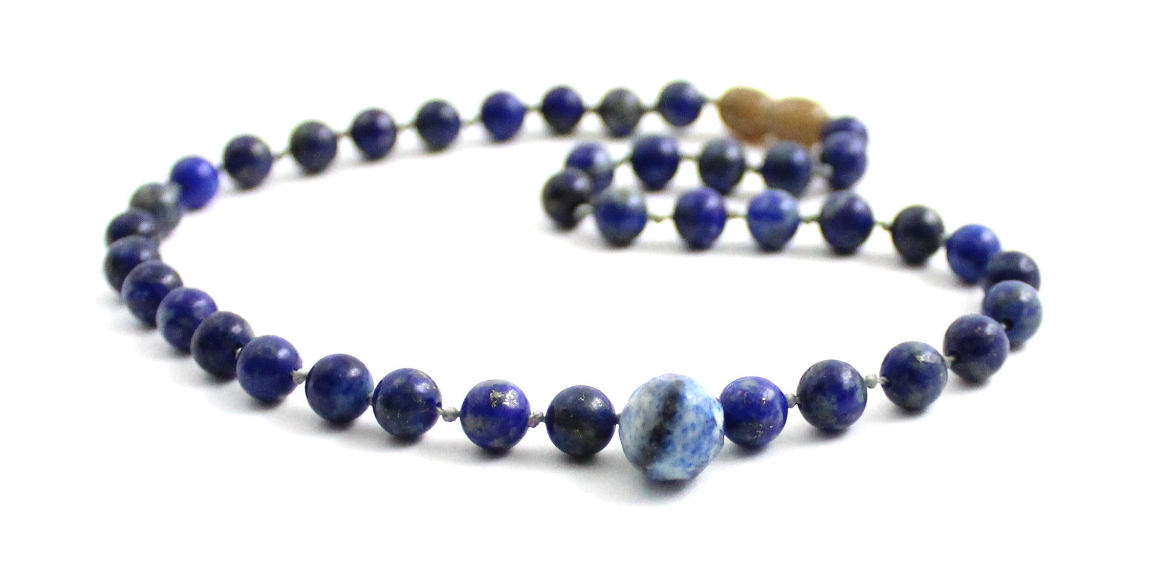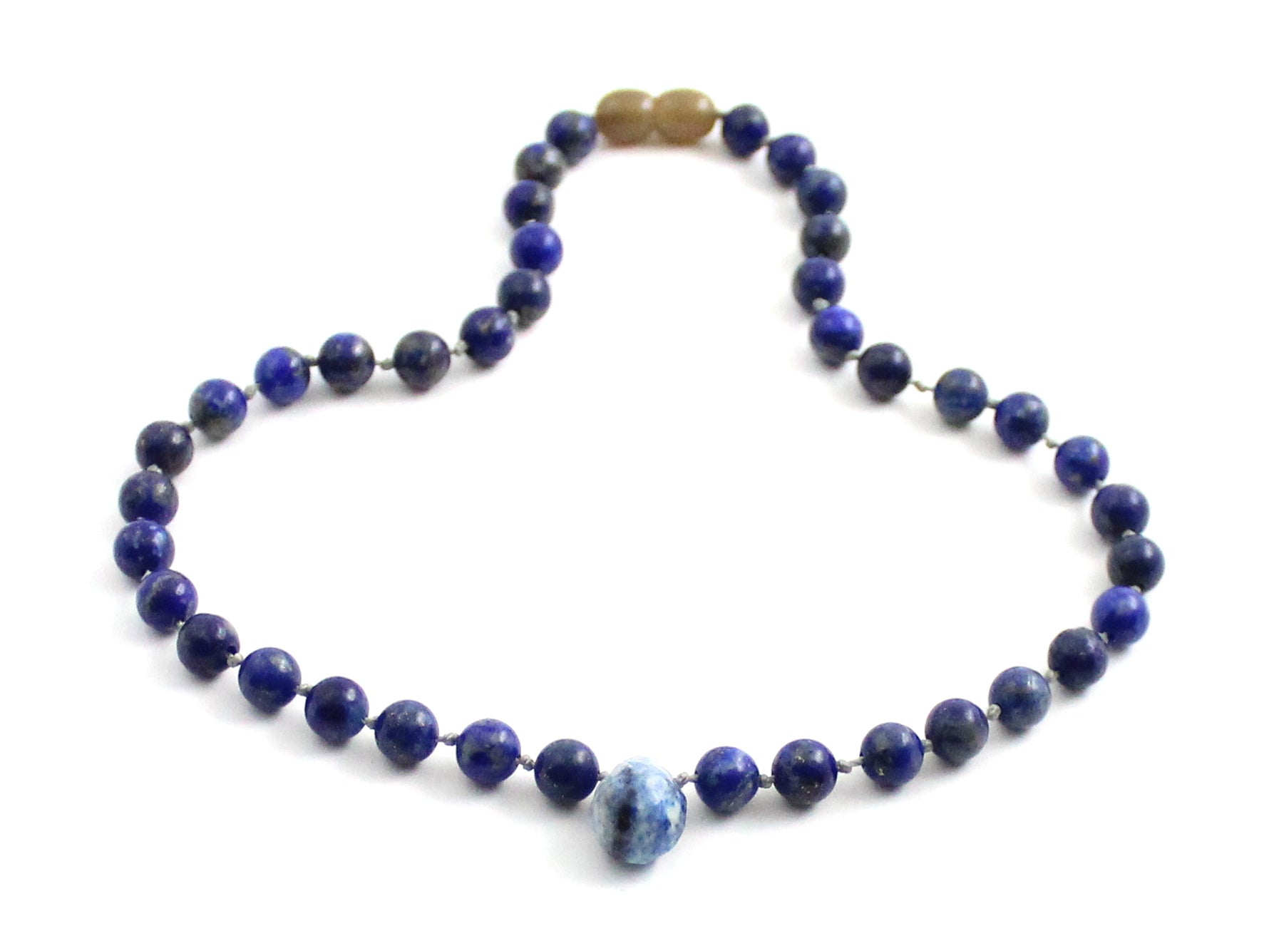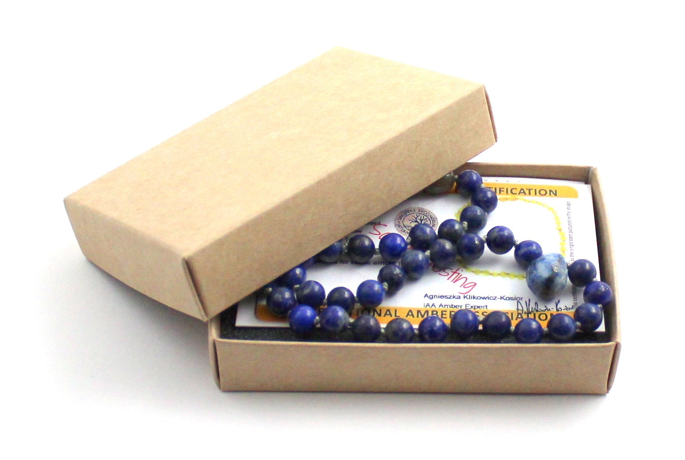 Lapis Lazuli Color: Dark Blue; Bead Diameter: ~6 mm; Pendant Diameter: ~13 X 10 mm; Gemstone Beads: Lapis Lazuli; Closure: Plastic Clasp (Screw); String: Gray (Polyester 100%);... Read more