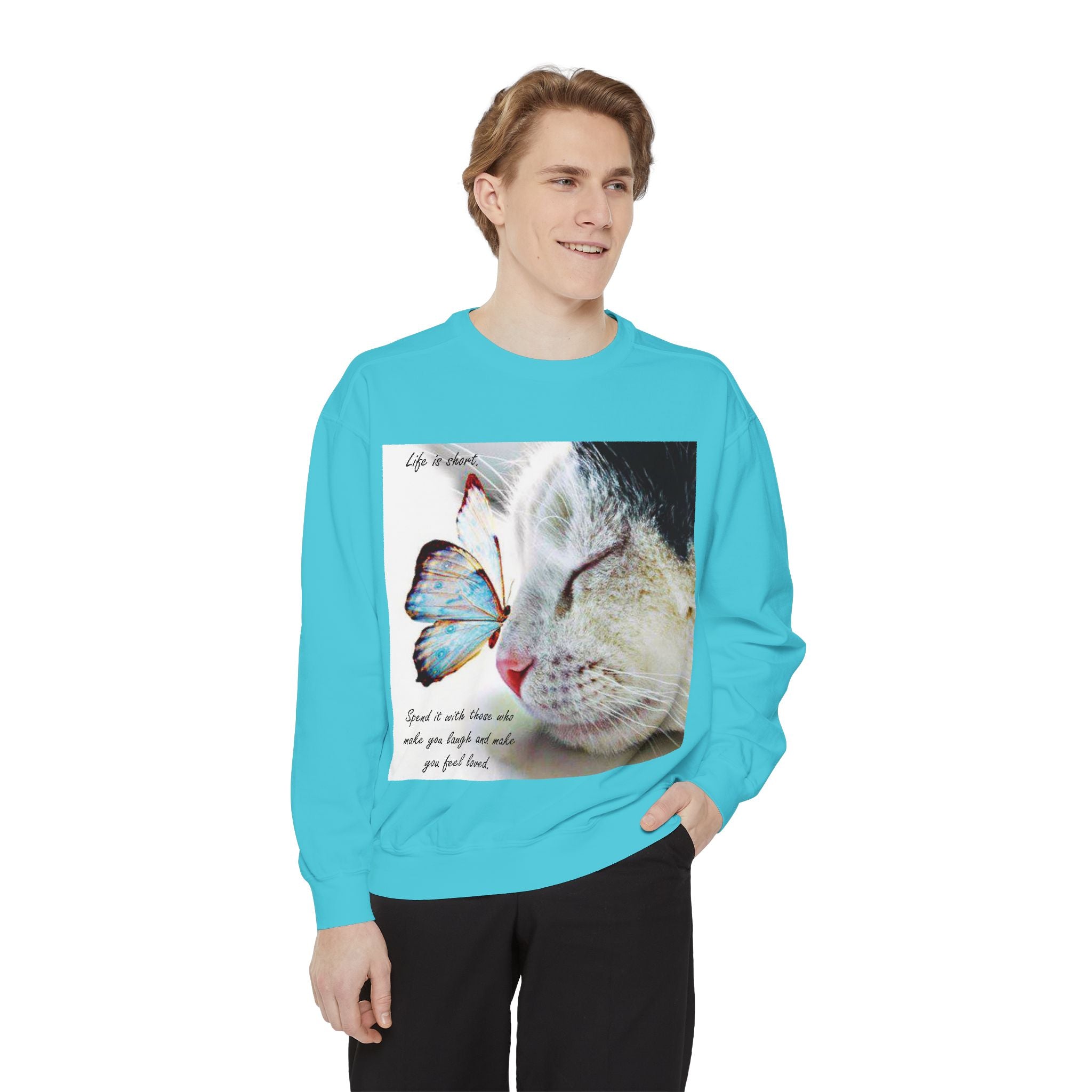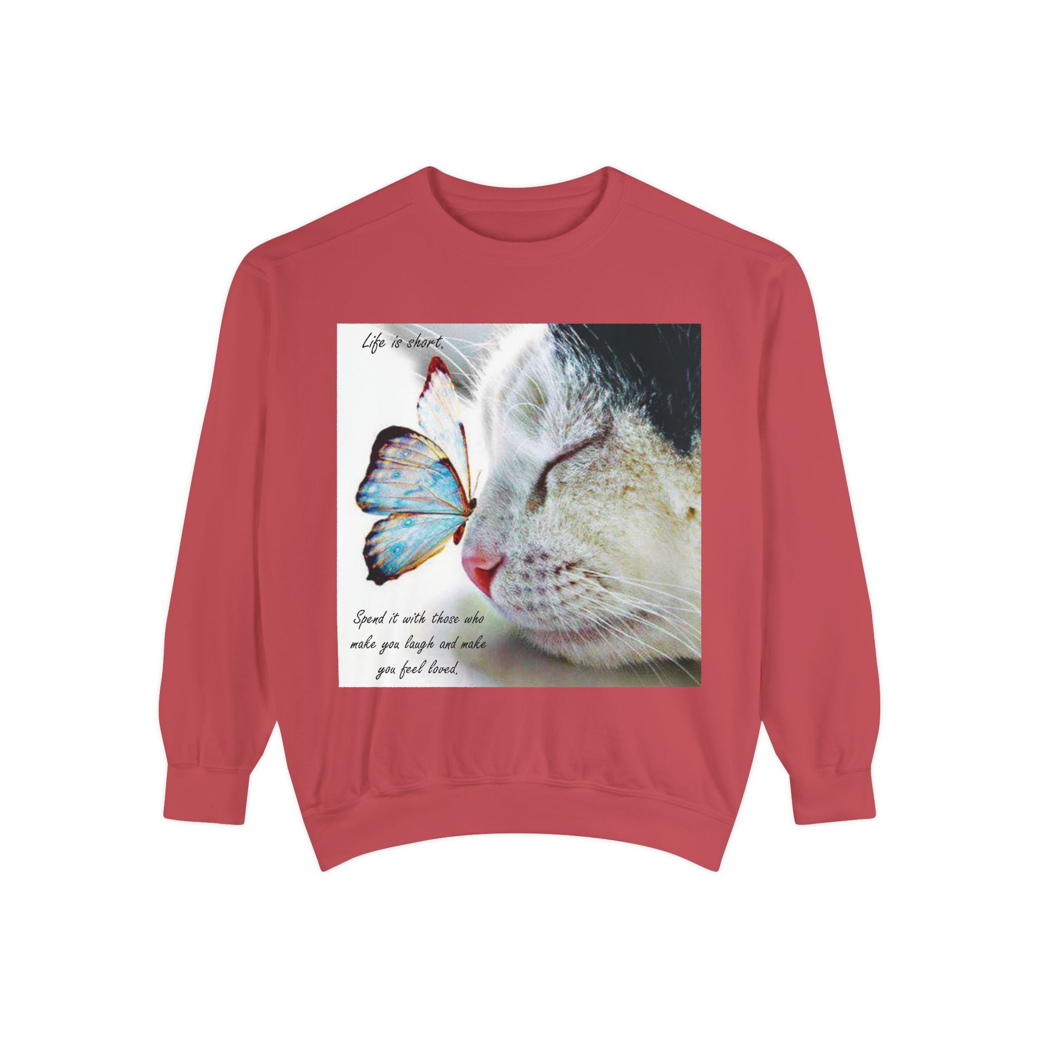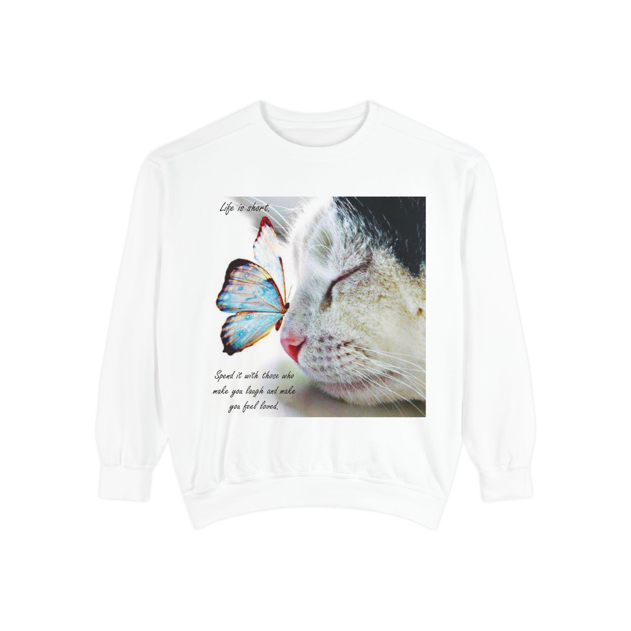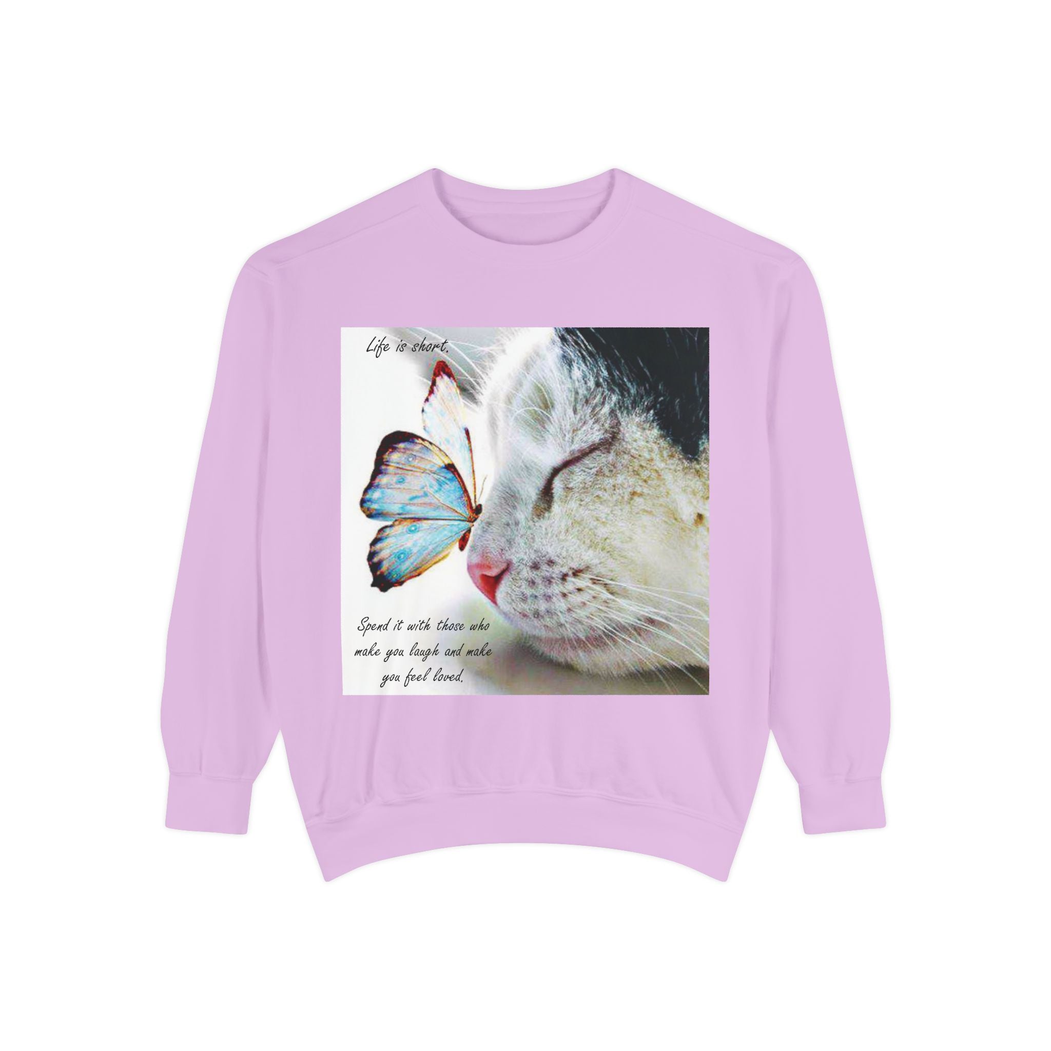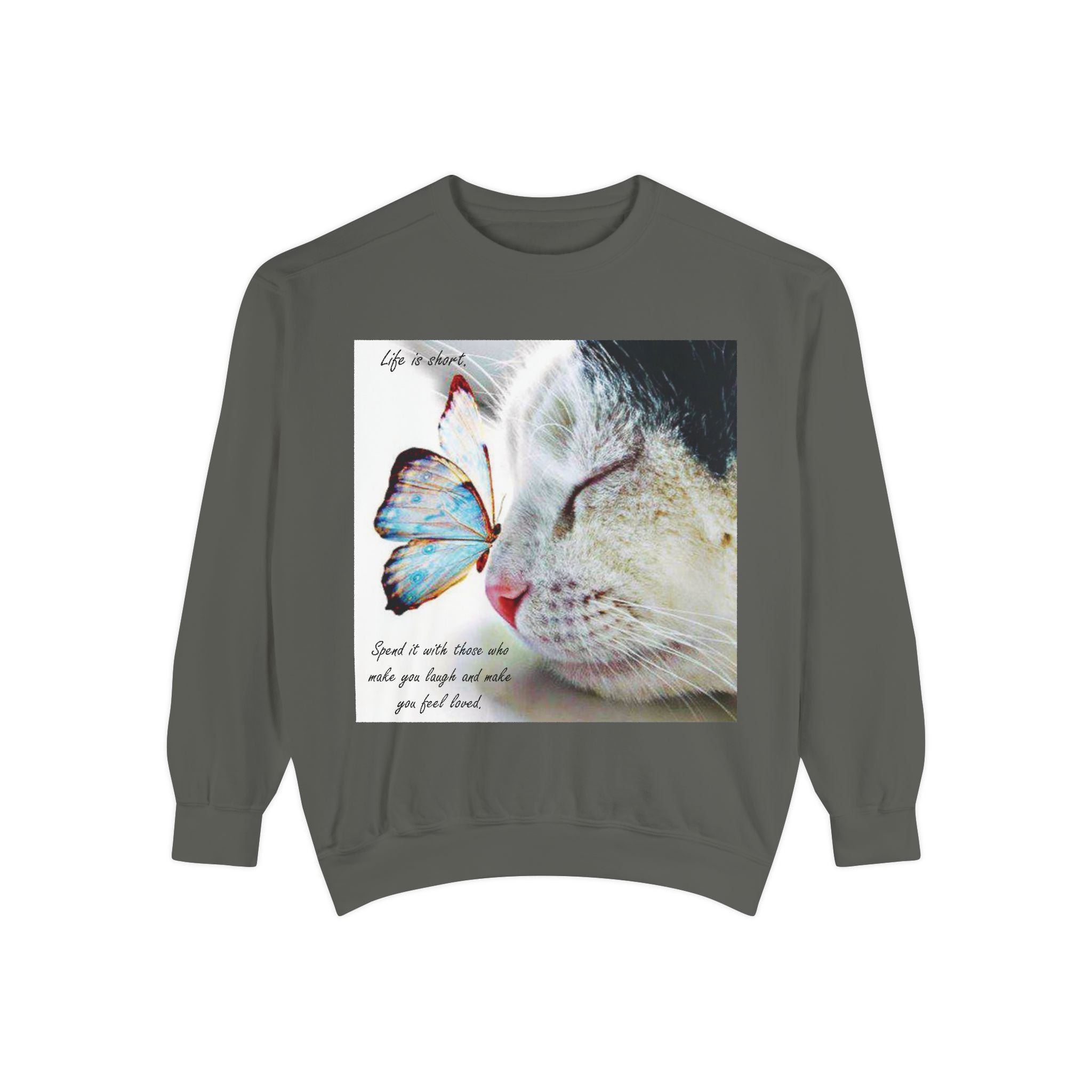 Introducing this cozy Unisex Garment-Dyed Sweatshirt, perfect for anyone seeking a blend of comfort and style. Its soft fabric and relaxed fit create an inviting atmosphere, making it ideal for lazy weekends, gatherings, or simply lounging at home. The beautiful design featuring a serene cat and butterfly invokes feelings of tranquility and warmth, a lovely touch for animal lovers and anyone looking to express their unique personality. This sweatshirt is perfect for casual outings, movie nights, or as a thoughtful gift for birthdays, holidays, and other celebrations. Suitable for men and women alike, it's a versatile addition to any wardrobe, celebrating both comfort and artistic expression.