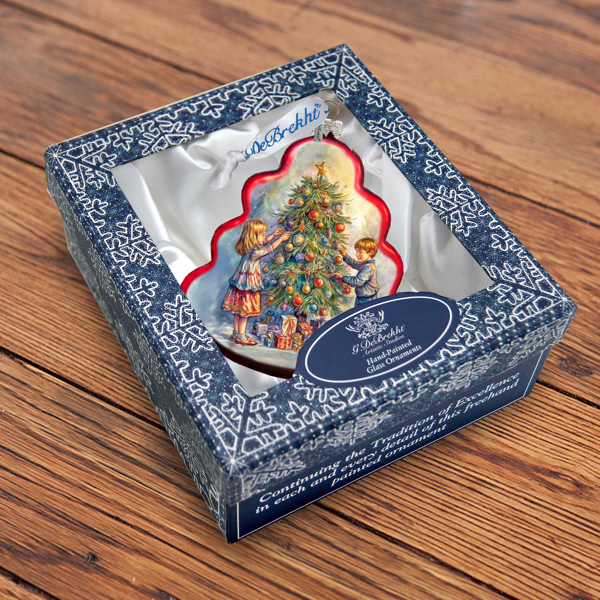 About Collection: This Holiday Splendor Glass Ornaments Collection has been inspired by old world-Eastern European families, who for almost 200 years had painted beautiful miniature lacquered paper-mâché boxes inlaid with mother of pearl. It took years of perfecting this technique to establish this new and innovative form of painting that we now proudly present in our exclusive G. DeBrekht Glass ornaments. As in the old days, they are made from 1.5 mm hand-blown Mercury Glass, silver powdered from the inside and then sandblasted from the outside. Combining colors and multi-layer painting techniques create a deep iridescent effect. We take pride in perfecting every piece by adding touches of gold, finishing them with a lovely satin ribbon, and presenting them in a luxurious satin-lined box. Hand-made in the USA, every piece is unique- and will be passed on to future generations to cherish.