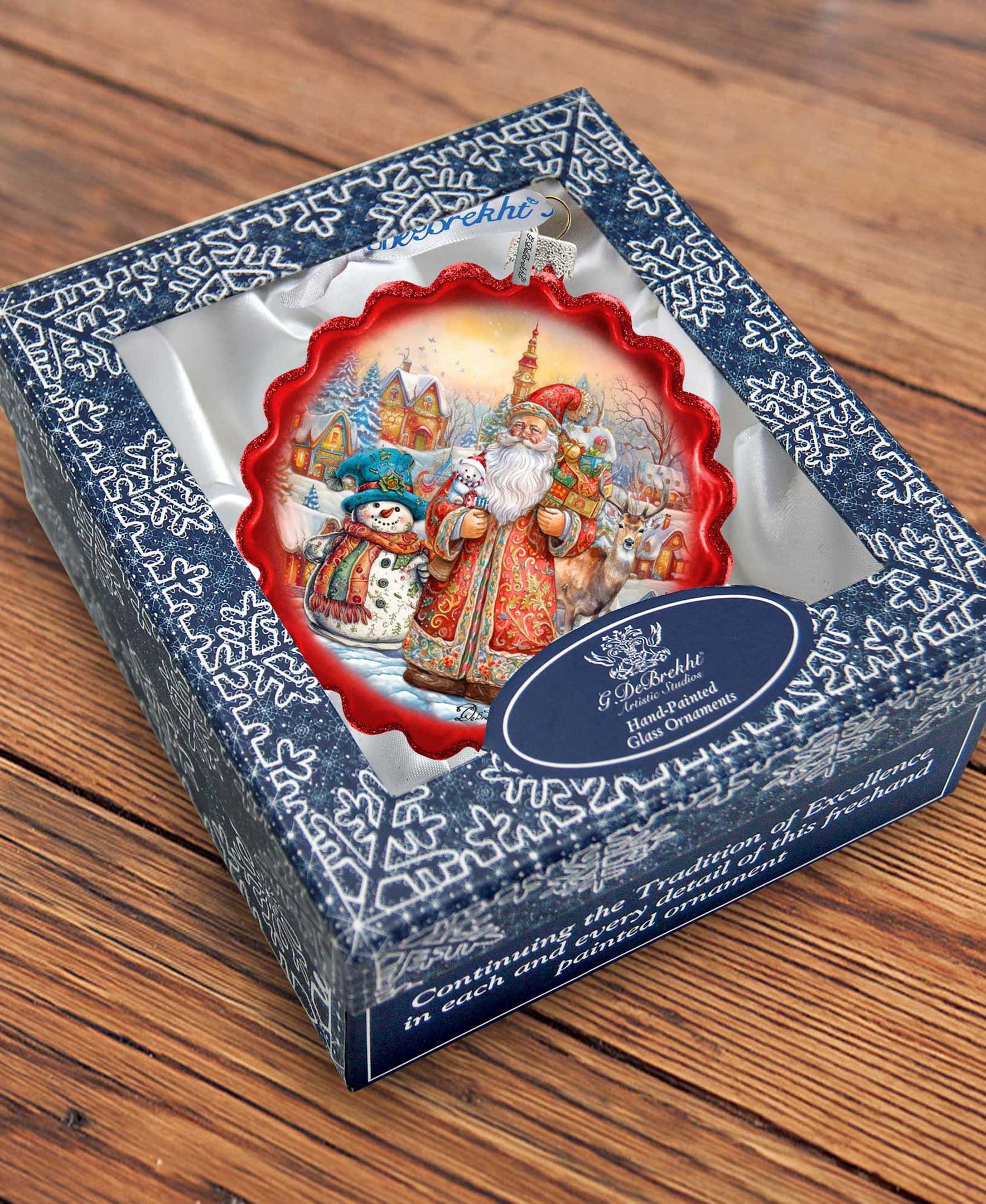 Welcome the holiday season with the Merry Christmas Wreath Glass Ornament from G. Debrekht. This beautiful Christmas Decor will light up your home with features including Santa and a Snowman. Perfect for indoor decorations, brighten up your home this season with this unique decoration.