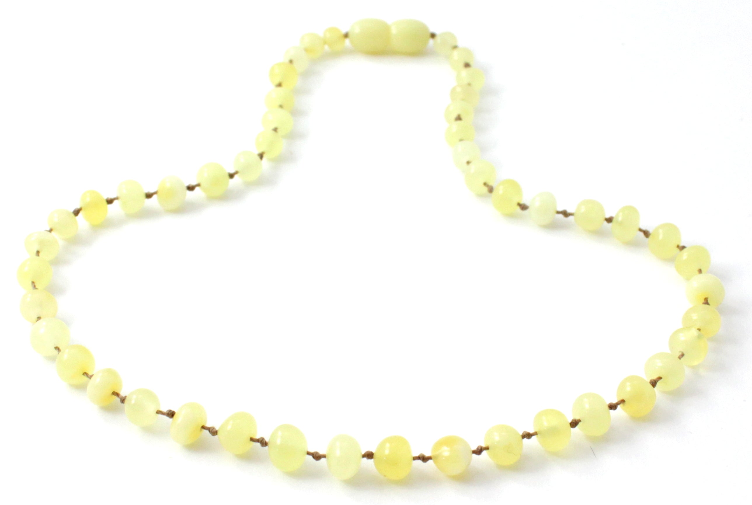 Amber Bead Surface: Polished; Amber Bead Shape: Oval (Baroque); Amber Color: Milky (Yellow); Closure: Plastic Clasp (Screw); Necklace Weight: ~5 g (32 cm); Bead Diameter: Between ~3-5... Read more