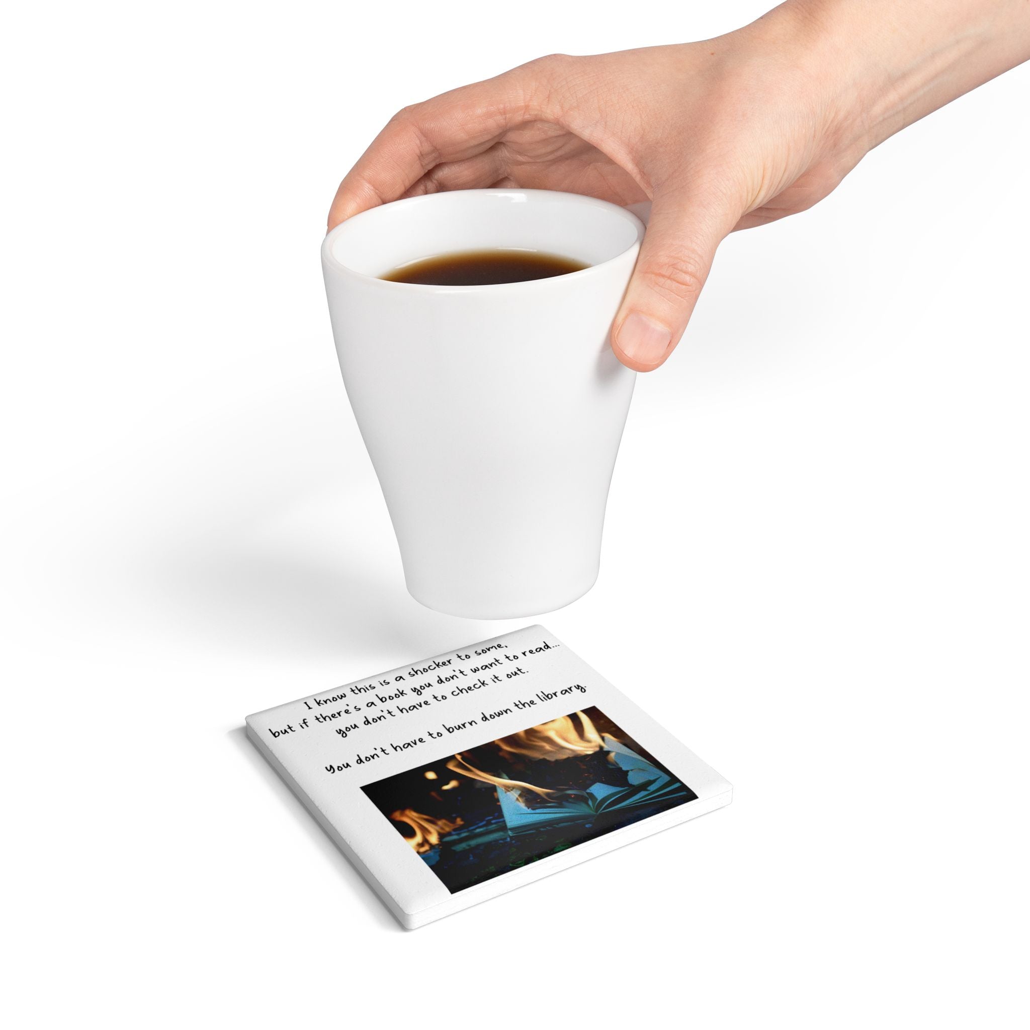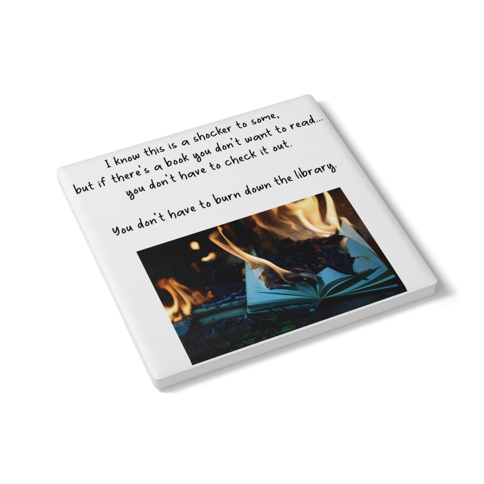 Make a bold statement about freedom of expression with this striking ceramic coaster, designed by Judith Ann Dykeman (JAD). Featuring the impactful quote, 'I know this is a shocker to some, but if there's a book you don't want to read...you don't have to check it out. You don't have to burn down the library,' this design pairs thought-provoking commentary with a vivid illustration of a pile of burning books. It serves as a powerful reminder of the importance of preserving intellectual freedom.