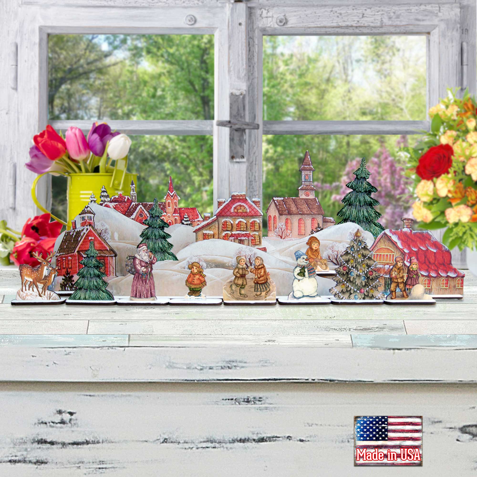 About Collection: “Holiday Village Sets” - bring the holiday spirit inside your home. This multi-piece set will brighten your home and make the perfect holiday present for a friend or family member. Here at G.DeBrekht, we always strive to create excellent decorations for your home. Many skilled artists have spent countless hours designing this beautiful Village Set. The precise cuts and the beautiful artwork will enhance the look of your home and add that extra touch to make this holiday season even more special. This set is hand-crafted in Its entirety here in the USA. Each display includes decorations and stands that are easy to assemble. Set it above your mantel, or use it as a centerpiece on your table.
