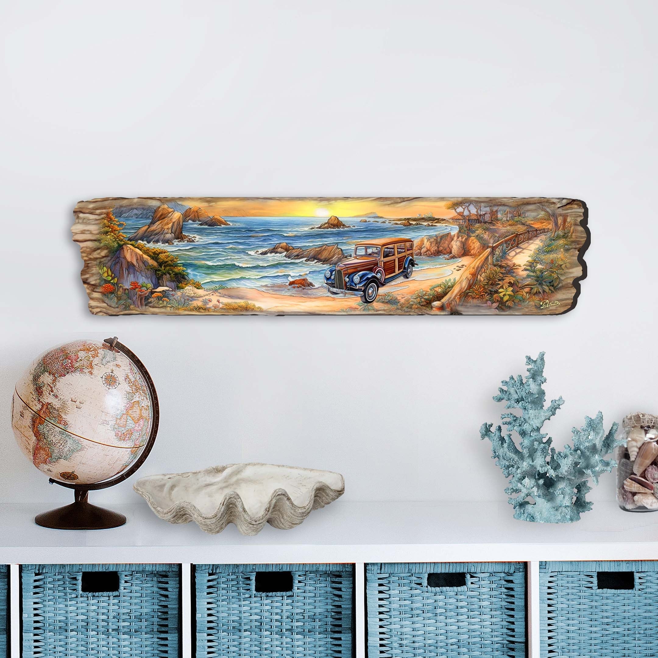 Add a touch of nostalgia to your coastal decor with this stunning wall art featuring a retro car on a serene beach at sunrise. Expertly crafted by G. DeBrekht, this piece captures the beauty of the seaside and brings a sense of calm and tranquility to any space. A must-have for beach lovers and vintage car enthusiasts alike.