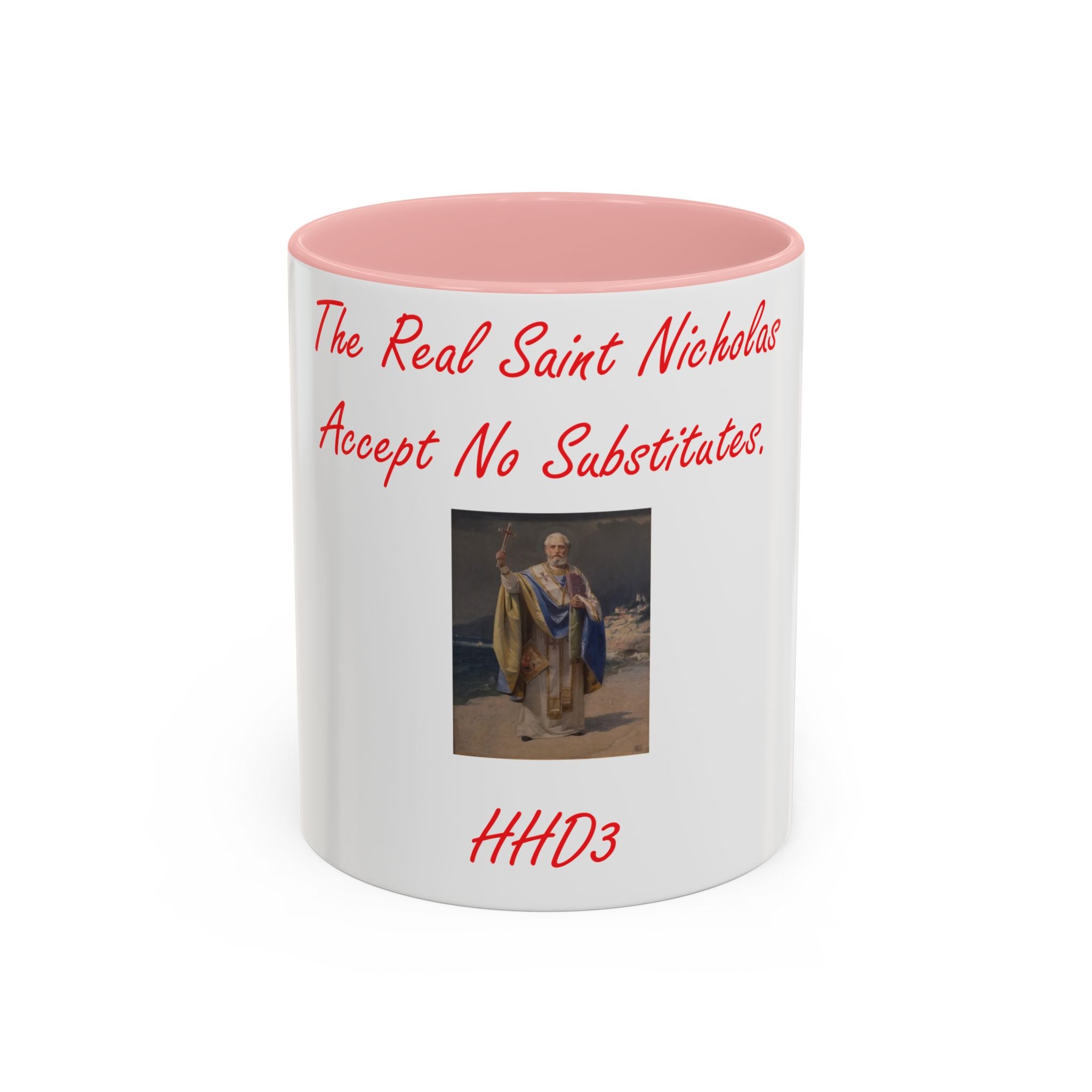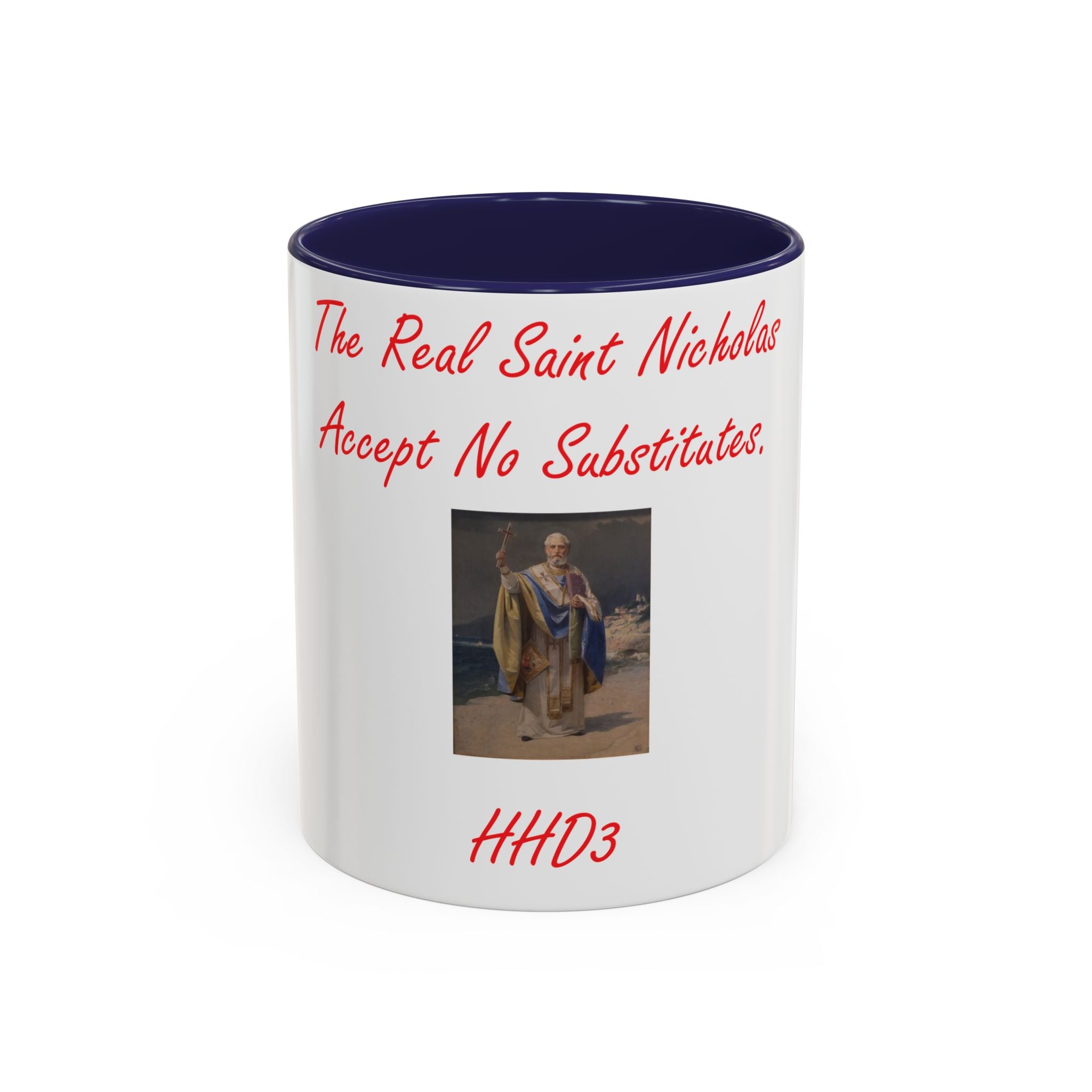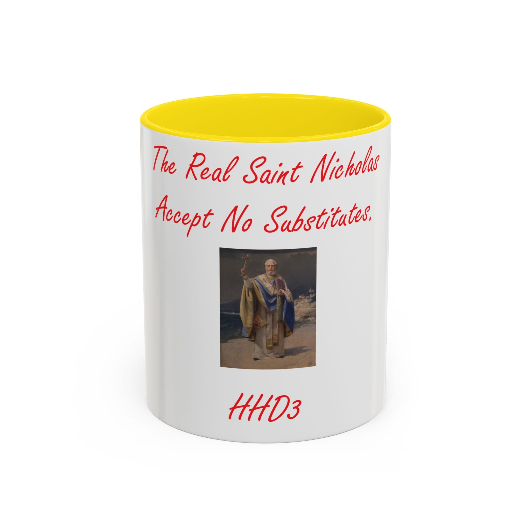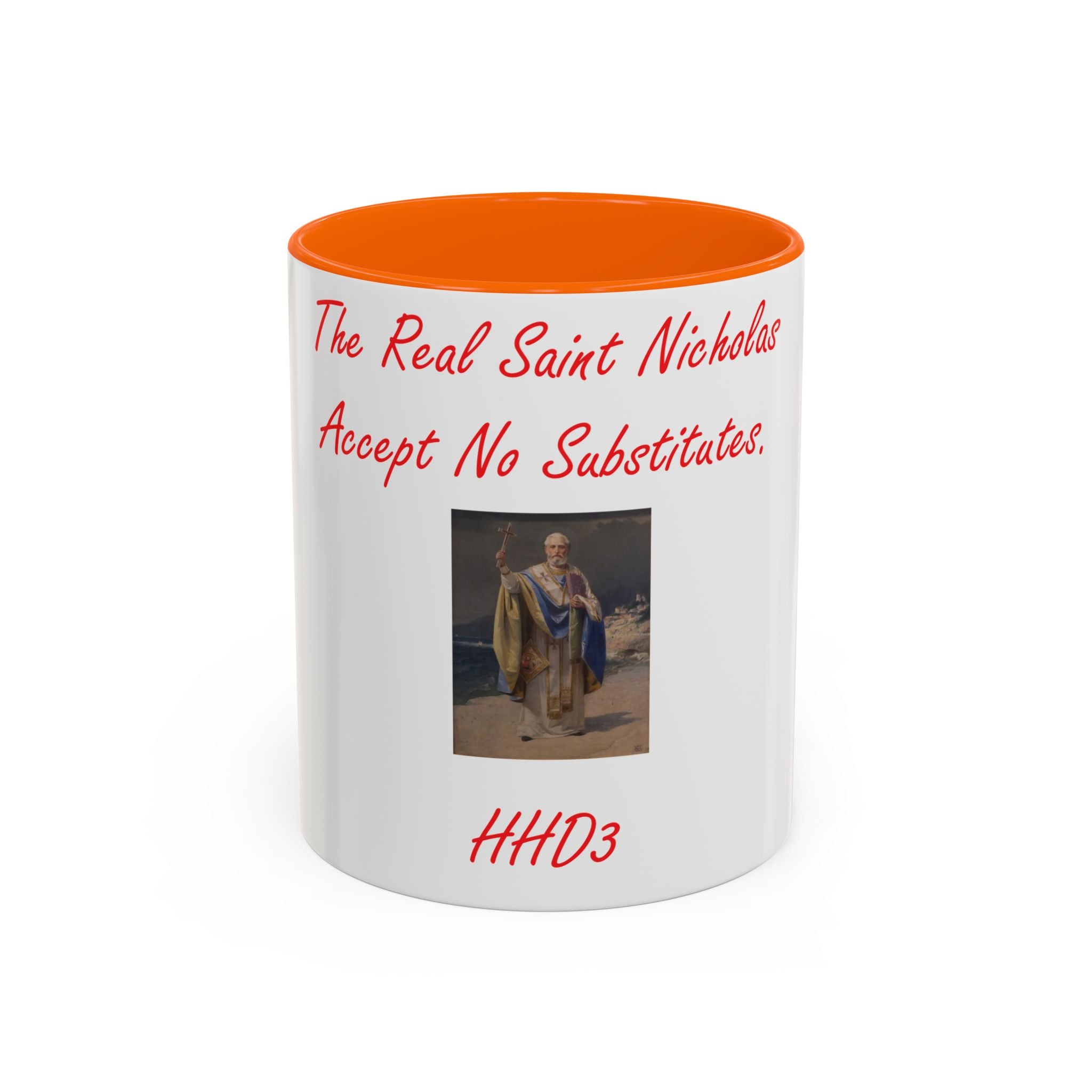 Sip in Style with the Spirit of St. Nicholas Celebrate tradition with every sip using this Accent Coffee Mug, featuring an original design by Herbie Dykeman (HHD3). Adorned with a captivating image of St. Nicholas and the lighthearted phrase, “The real St. Nicholas, Accept no substitutes,” this mug brings charm and history to your daily routine. Known as the inspiration behind Santa Claus and the patron saint of children, St. Nicholas adds a touch of heritage to your coffee, tea, or hot cocoa experience. Crafted from sturdy white ceramic with a vibrant glossy finish, this mug is not only visually appealing but also practical—it’s dishwasher and microwave safe for everyday convenience. Whether gifting for the holidays, enjoying cozy moments at home, or brightening your workspace, this mug combines artistry and function in one delightful package.