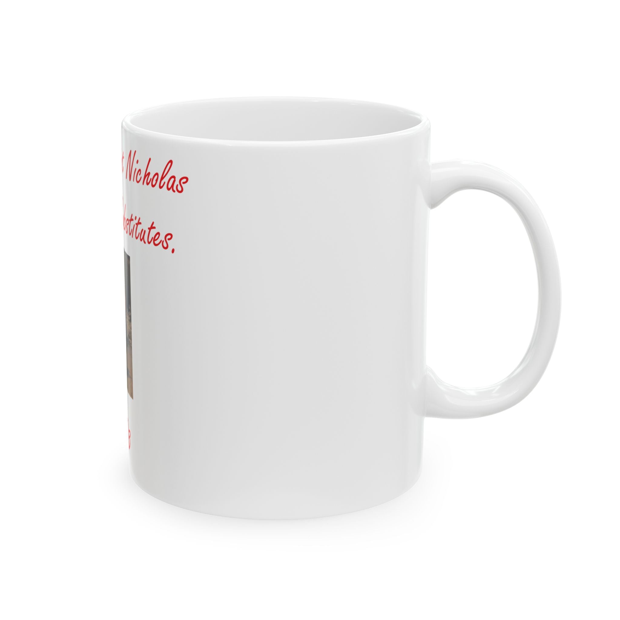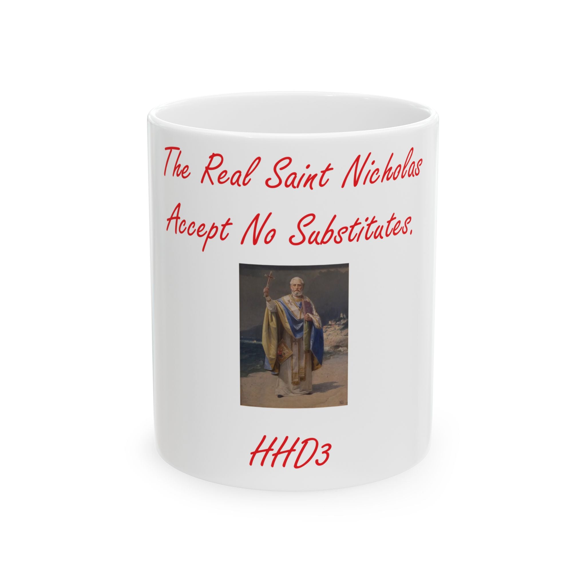 Celebrate the Spirit of St. Nicholas This ceramic mug features an original design by Herbie Dykeman (HHD3), blending charm and tradition. The artwork showcases an image of St. Nicholas, paired with the playful phrase, “The real St. Nicholas, Accept no substitutes.” Widely celebrated as the historical inspiration behind Santa Claus and revered as the patron saint of children, St. Nicholas brings a sense of history and whimsy to your morning coffee or tea. With its glossy finish and vibrant colors, this mug is both a functional vessel and a conversation starter. Perfect for festive occasions or everyday use, it makes a meaningful gift for anyone who appreciates unique designs and timeless stories. Whether you’re sipping cocoa on a winter evening or gifting a loved one during the holidays, this mug is a celebration of artistry and tradition.