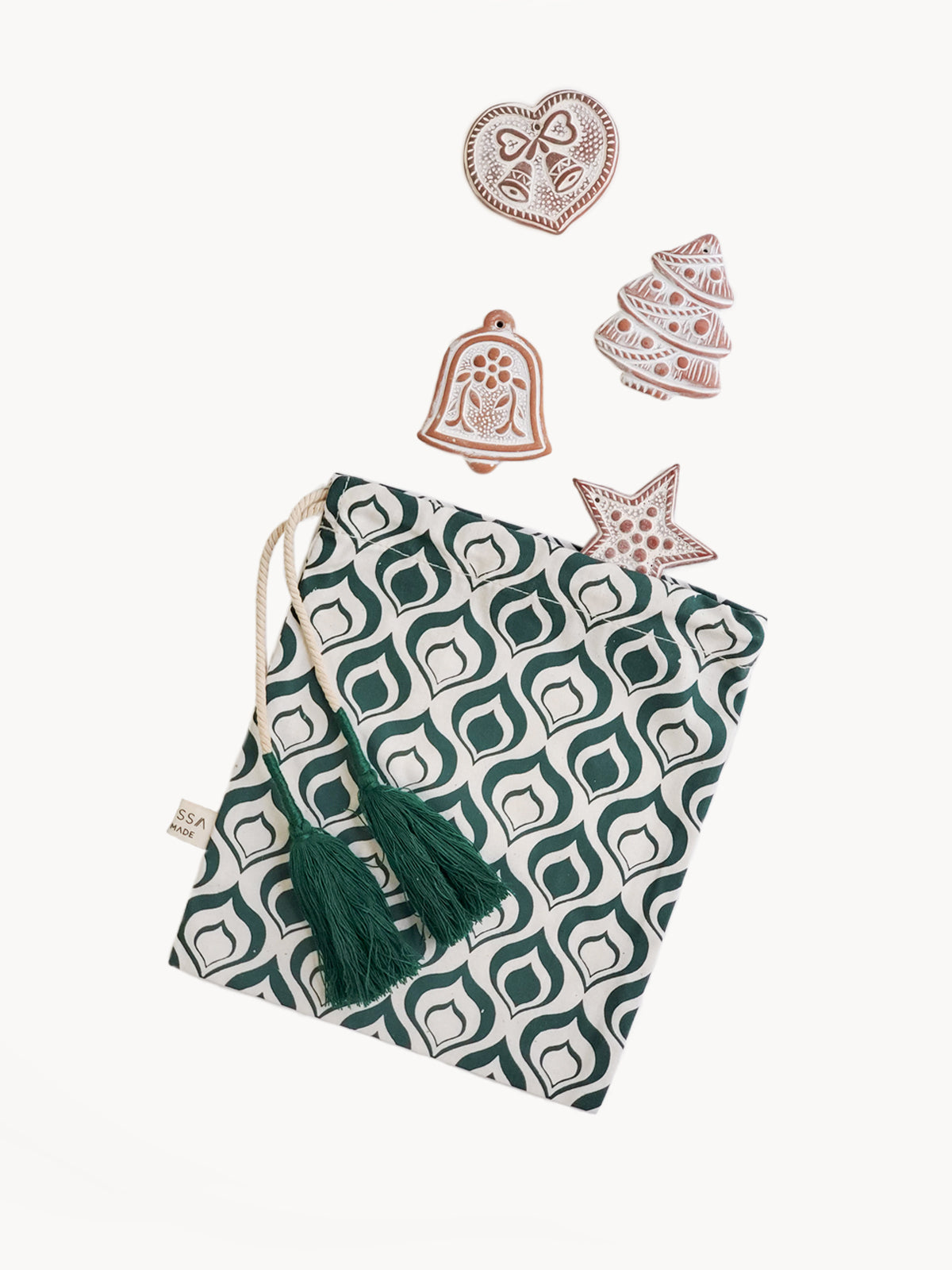 Each set of sugar savers includes a "Hand Screen Printed Drawstring Pouch" handmade by Bangladesh Women Artisan, which is beautiful for gifting & storing the sugar saver & ornaments.