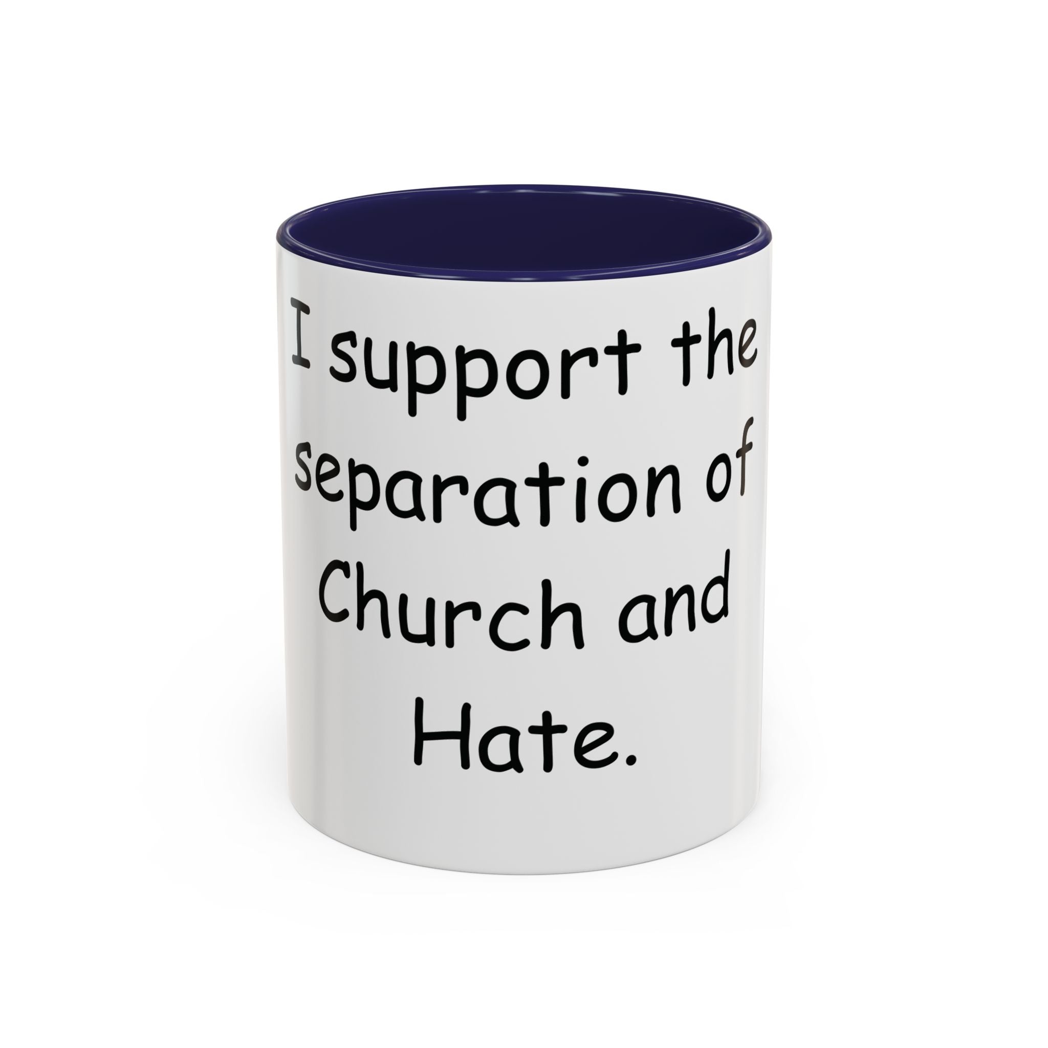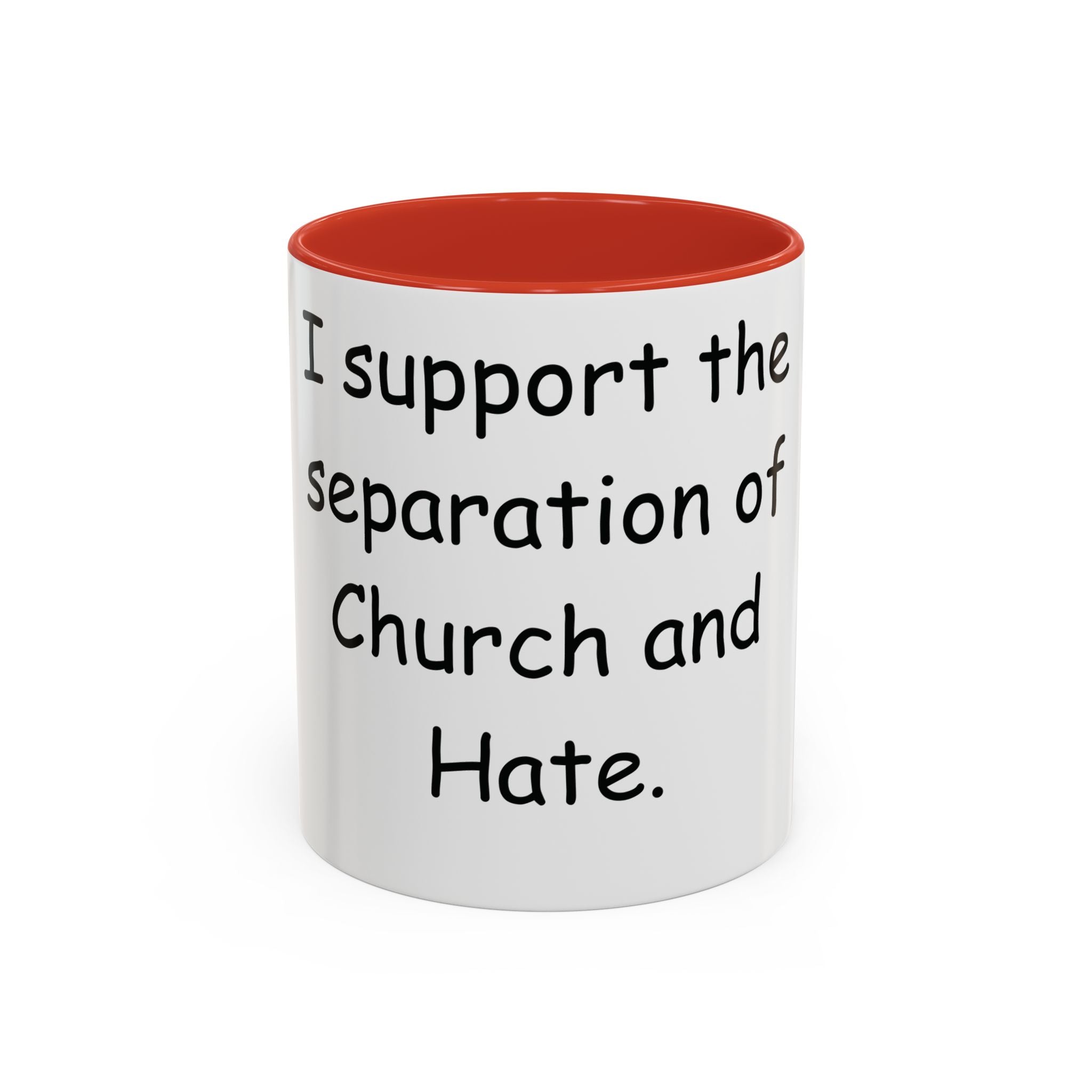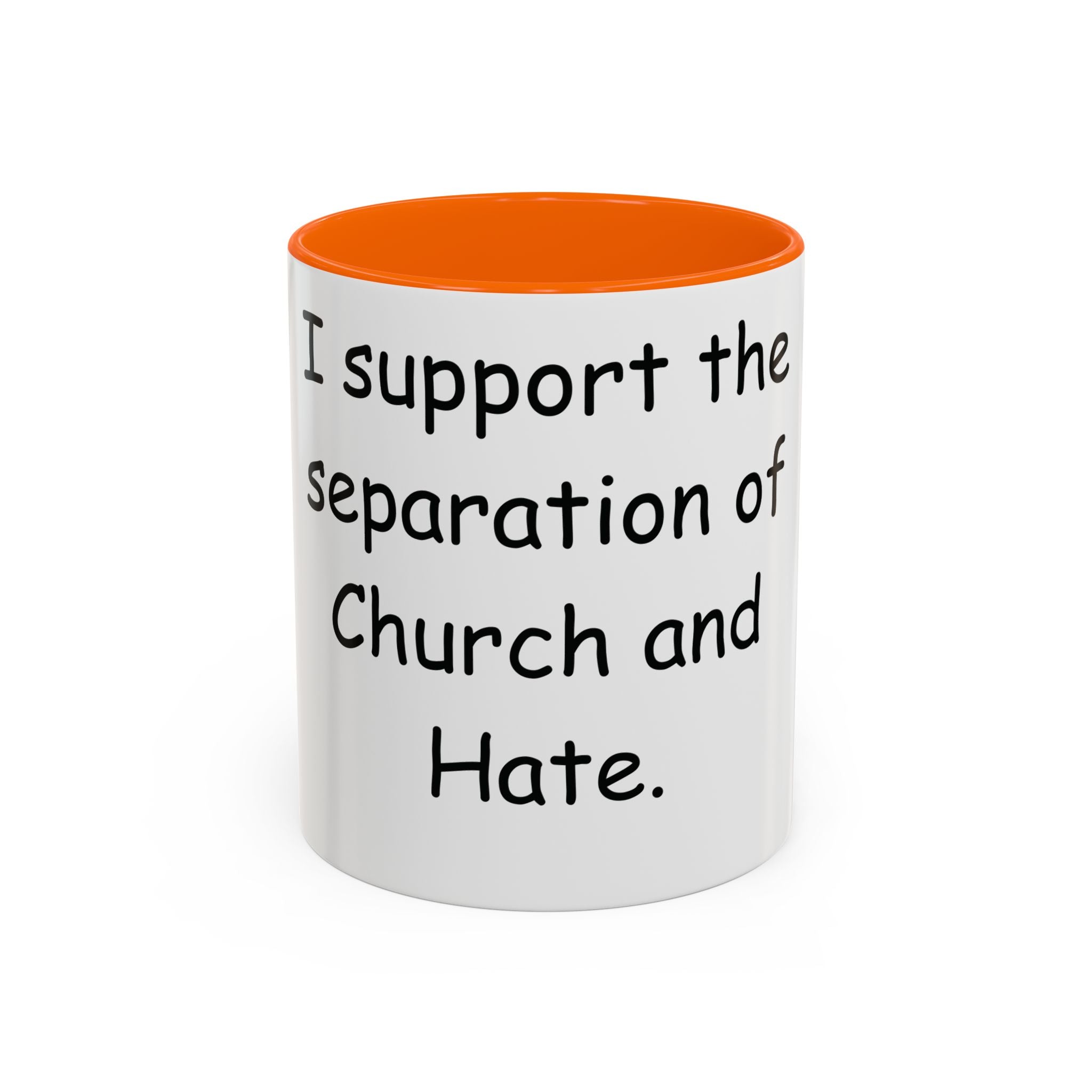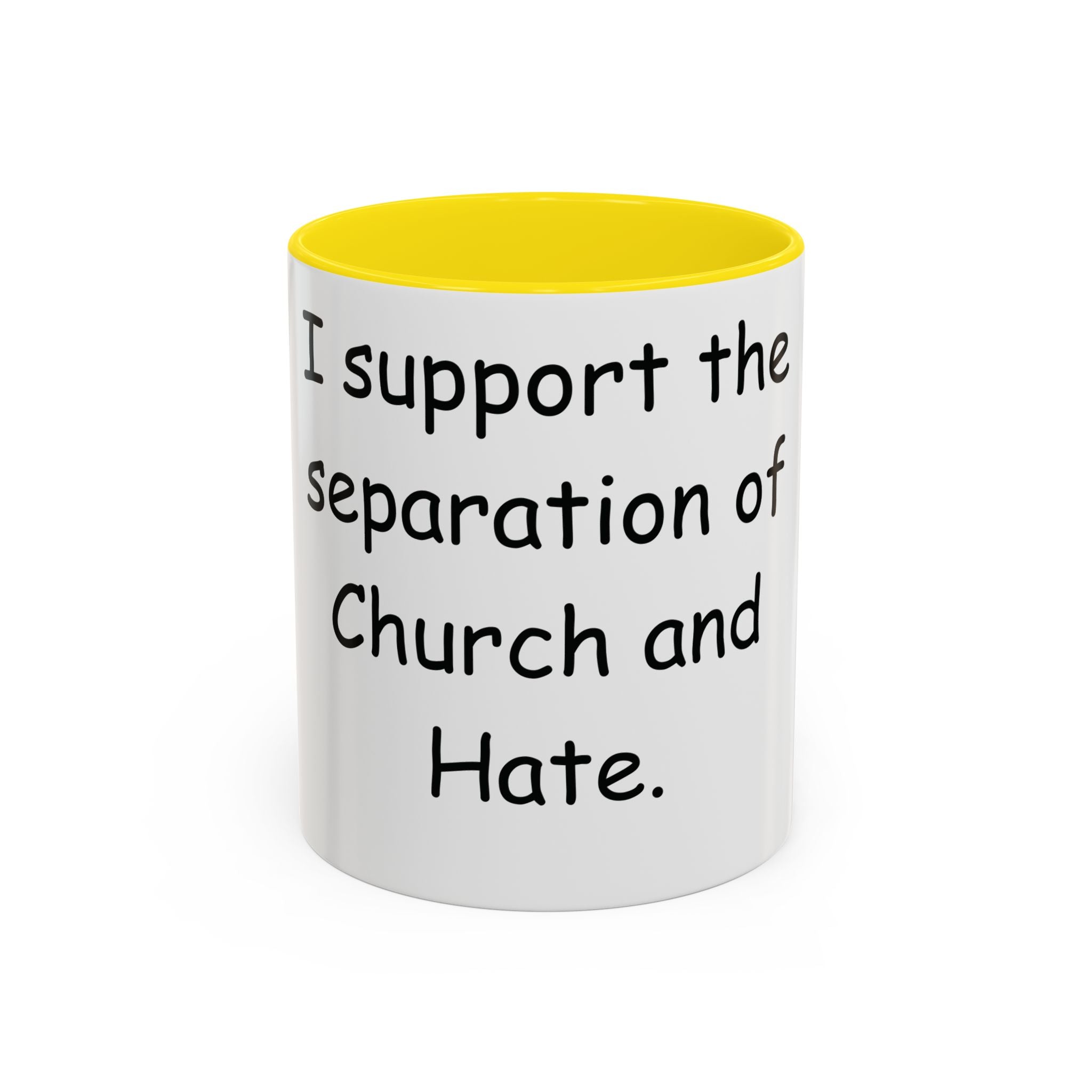 Start your day with purpose and style. This vibrant Accent Coffee Mug showcases the bold statement: 'I support the separation of Church and Hate,' making it more than just a mug—it’s a declaration of values. The colorful interior and handle create a striking contrast against the glossy white ceramic exterior, adding energy and personality to your coffee or tea routine.