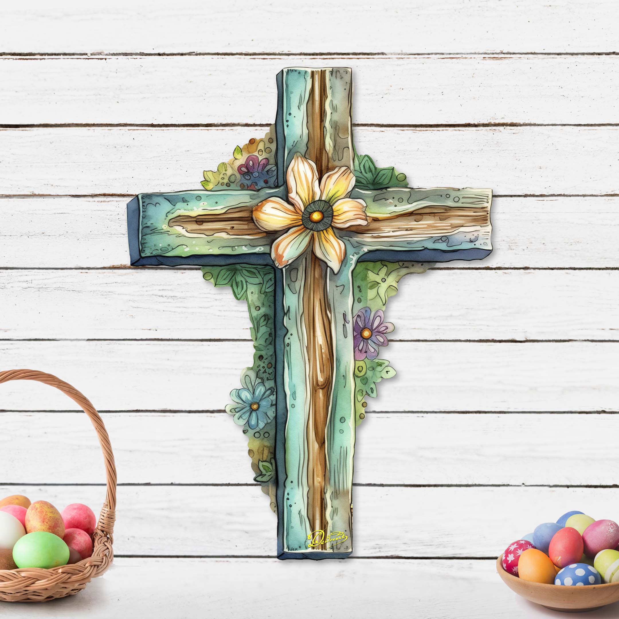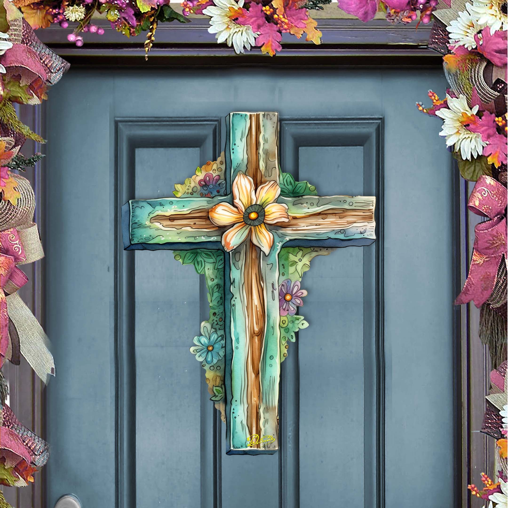 This elegant Teal Cross Holiday Door Decor by G. Debrekht will add a touch of spring to your home. The beautifully designed teal cross is adorned with a charming flower, making it the perfect decoration for Easter or any special occasion. Made with high-quality materials, this door Decor is sure to impress.