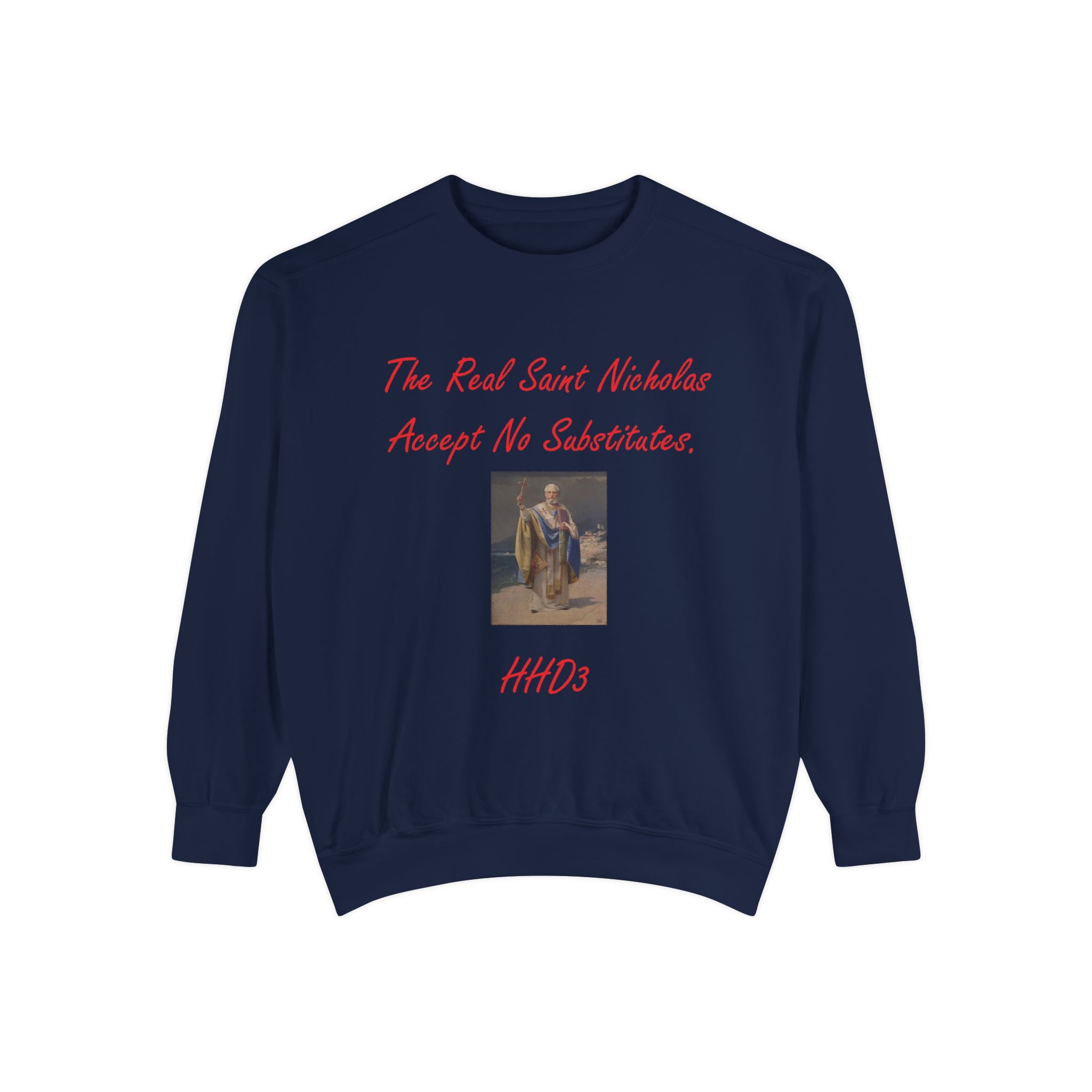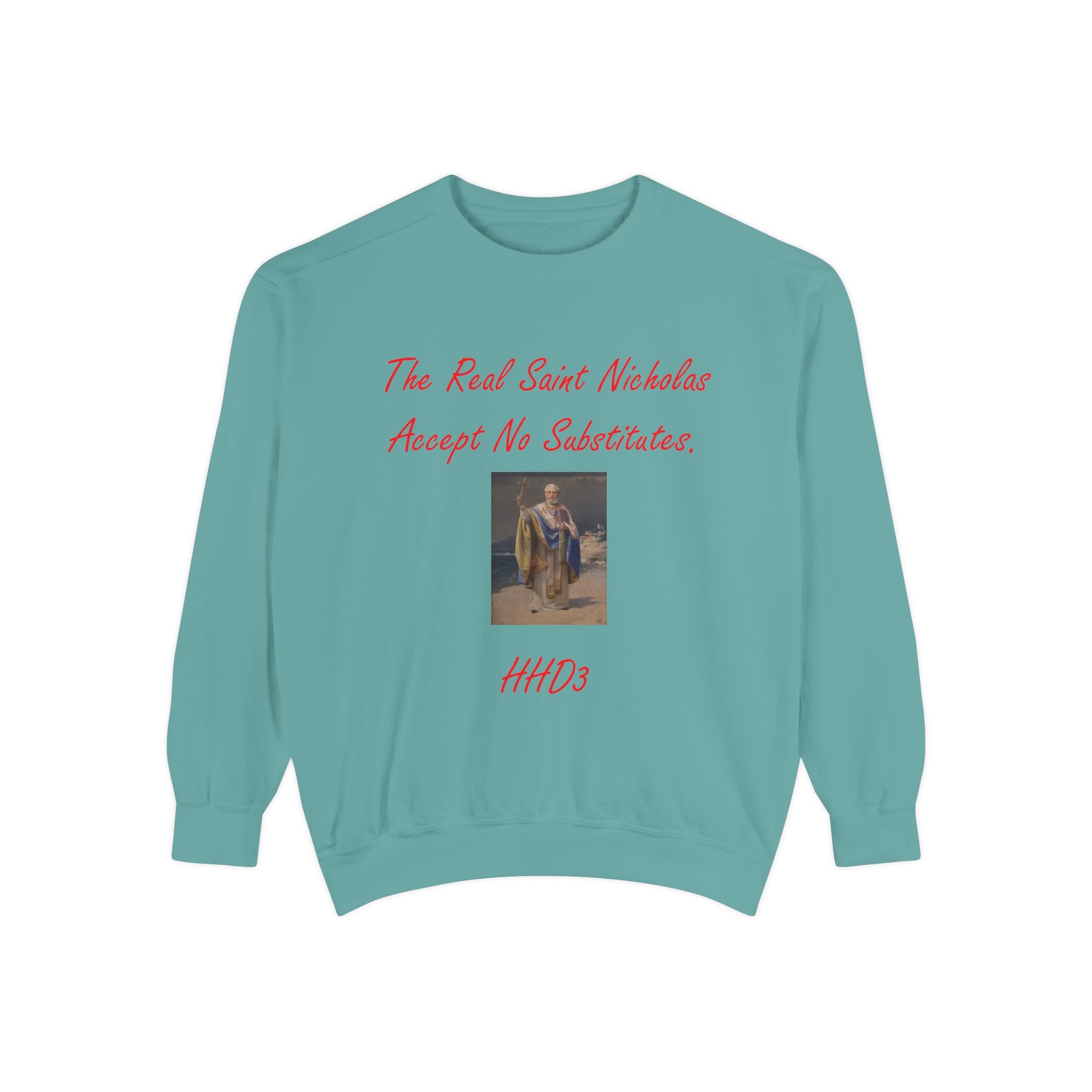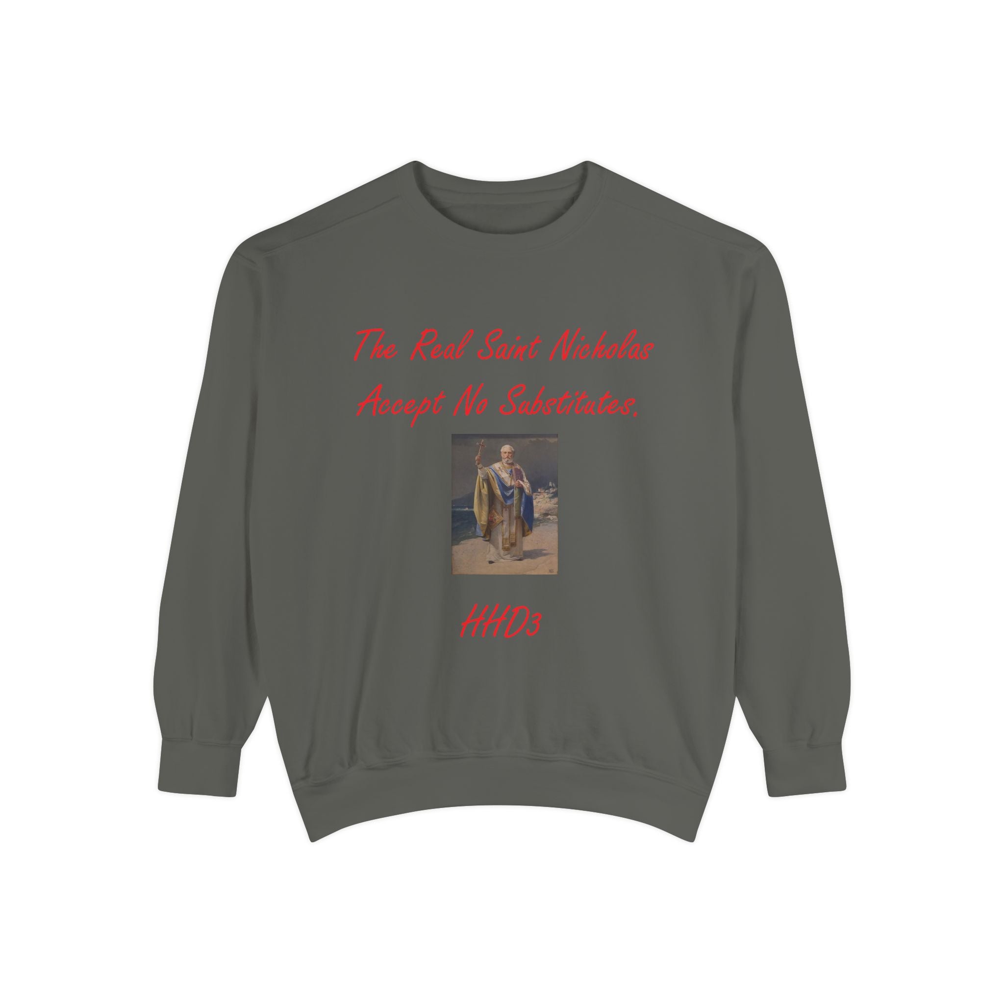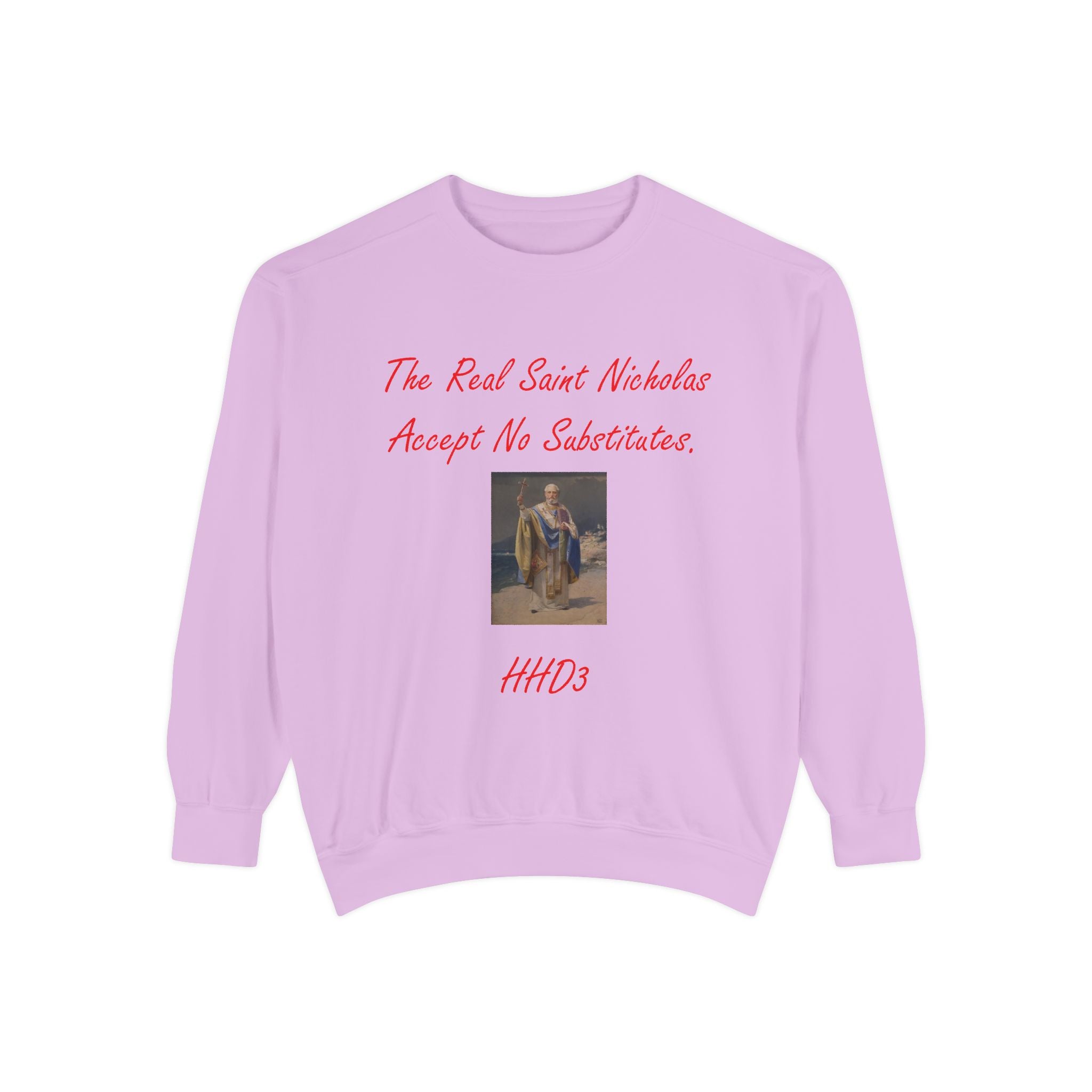 Wrap Yourself in the Legacy of St. Nicholas Celebrate tradition and comfort with this garment-dyed unisex sweatshirt featuring an original design by Herbie Dykeman (HHD3). The artwork showcases an image of St. Nicholas alongside the playful phrase, “The real St. Nicholas, Accept no substitutes.” Revered as the inspiration behind Santa Claus and the patron saint of children, St. Nicholas brings a sense of charm and history to your wardrobe. This sweatshirt combines its soft, luxurious fabric blend with Herbie’s unique artistry, creating a perfect piece for lounging at home, casual outings, or festive occasions. Whether gifting to loved ones or treating yourself, it’s a meaningful way to blend comfort, style, and storytelling in one cozy package.
