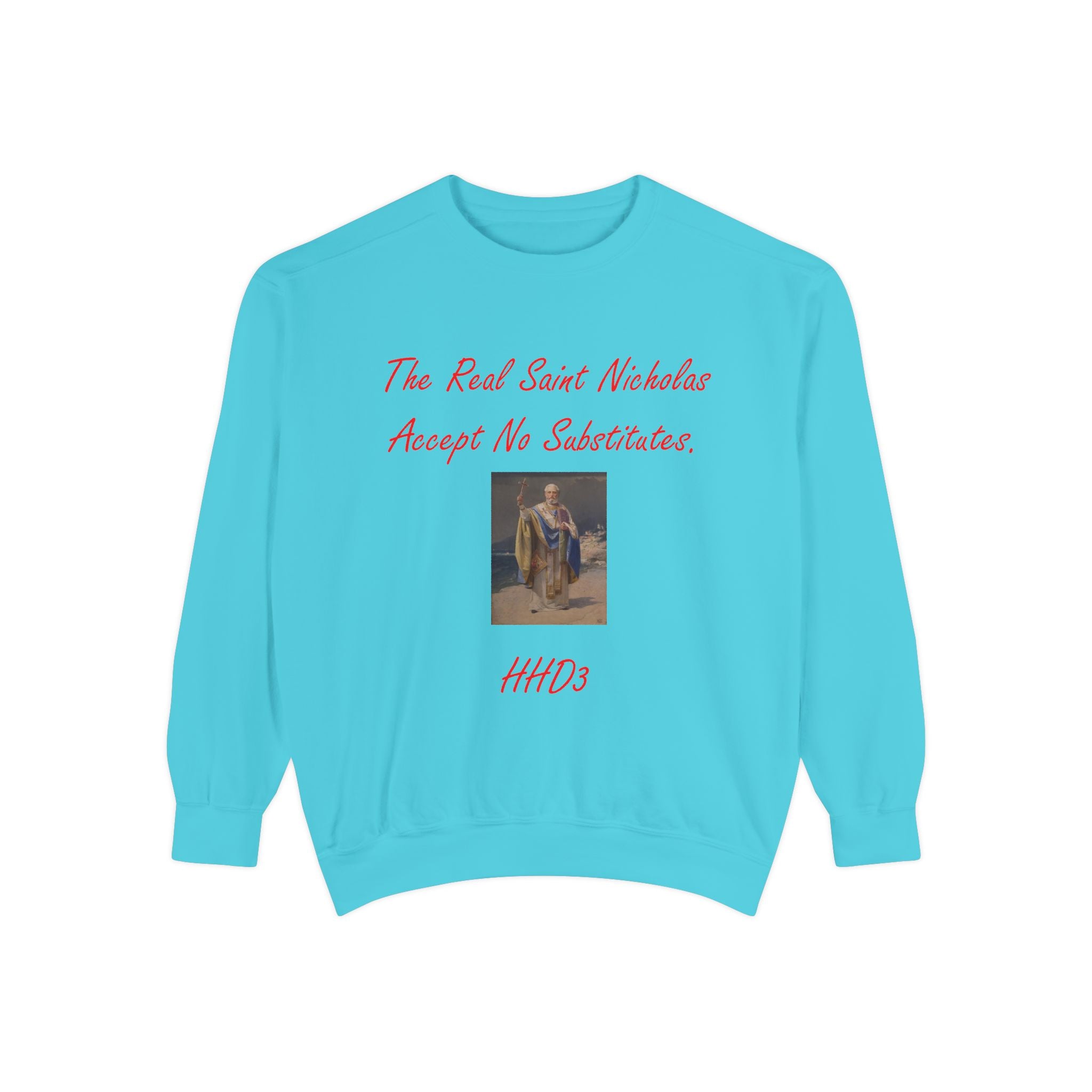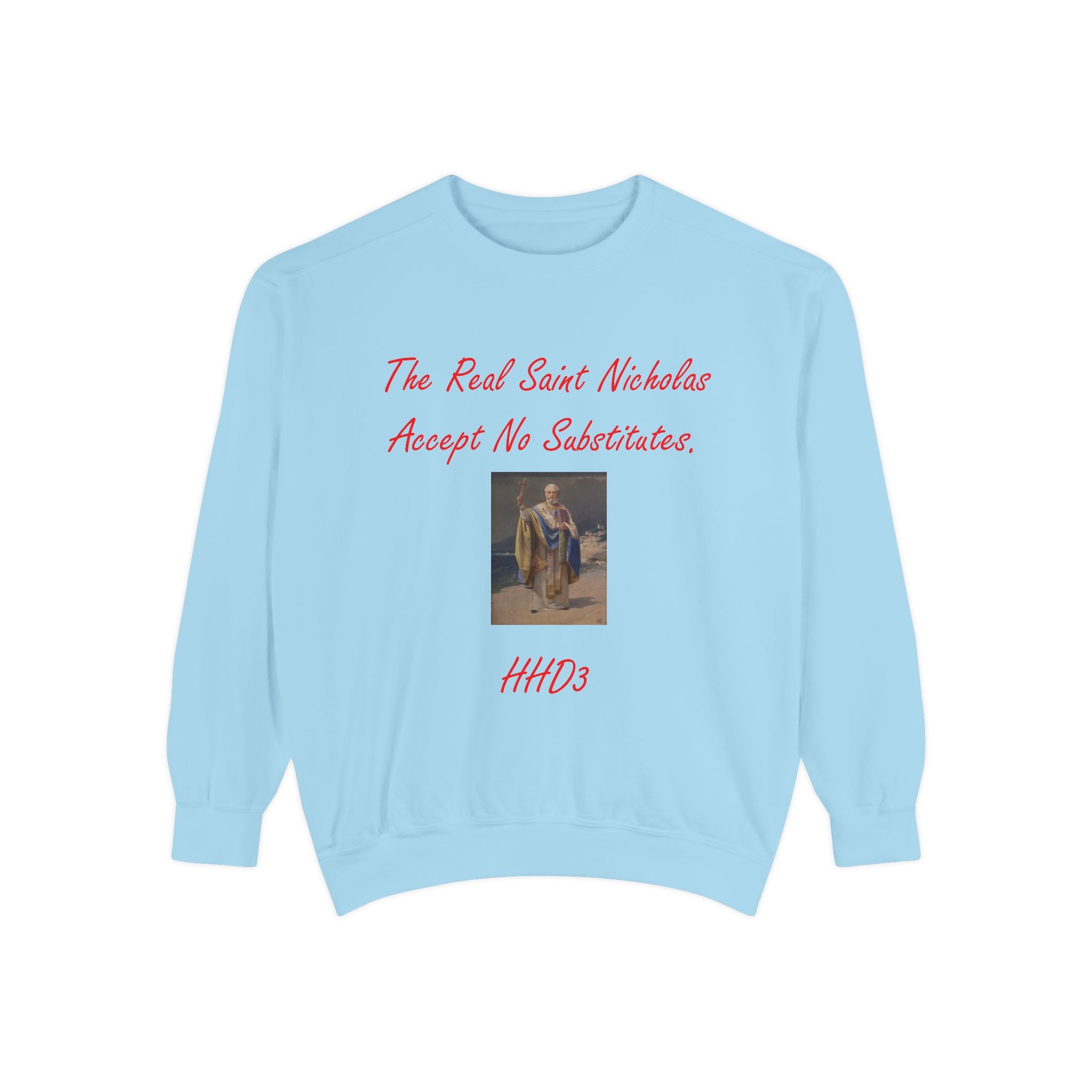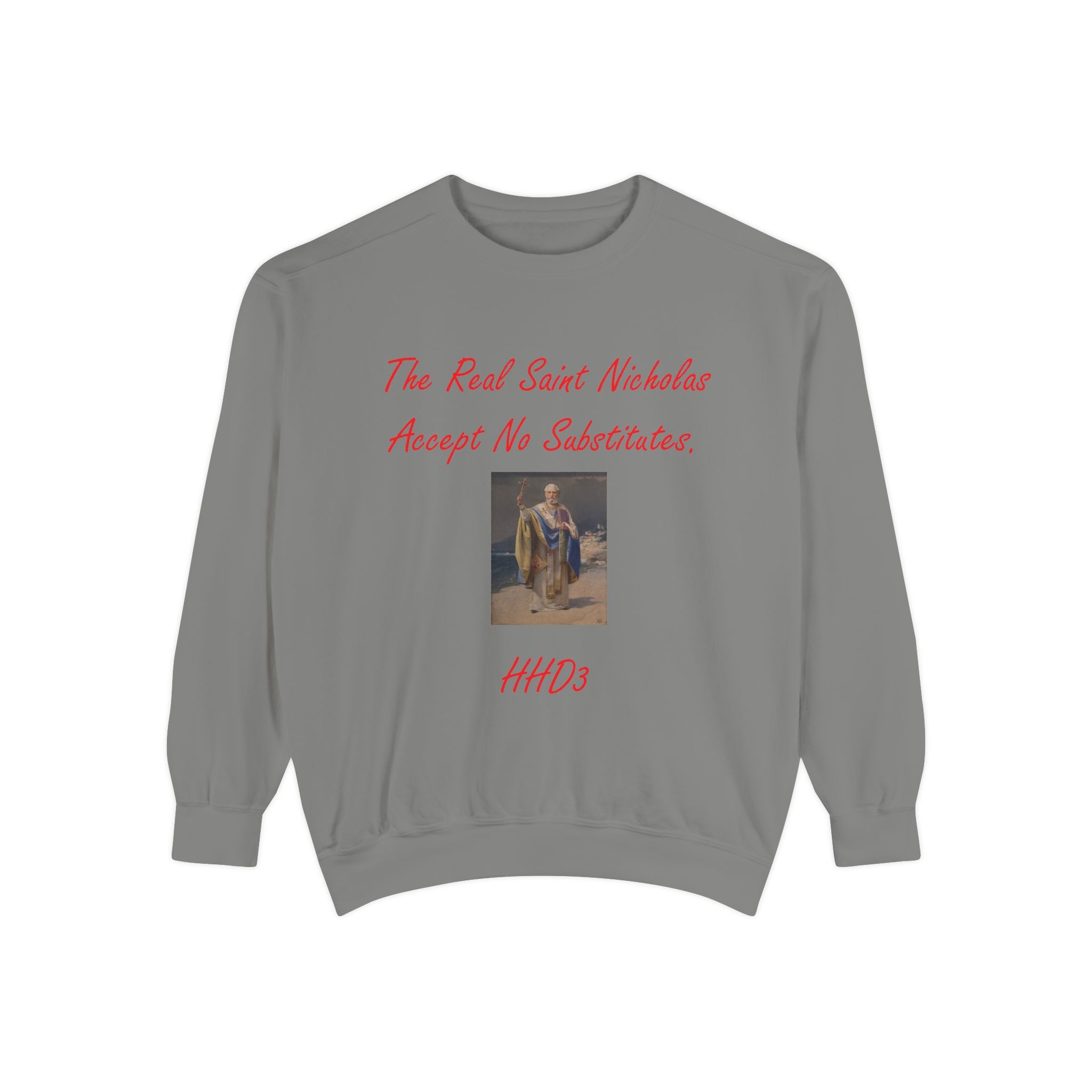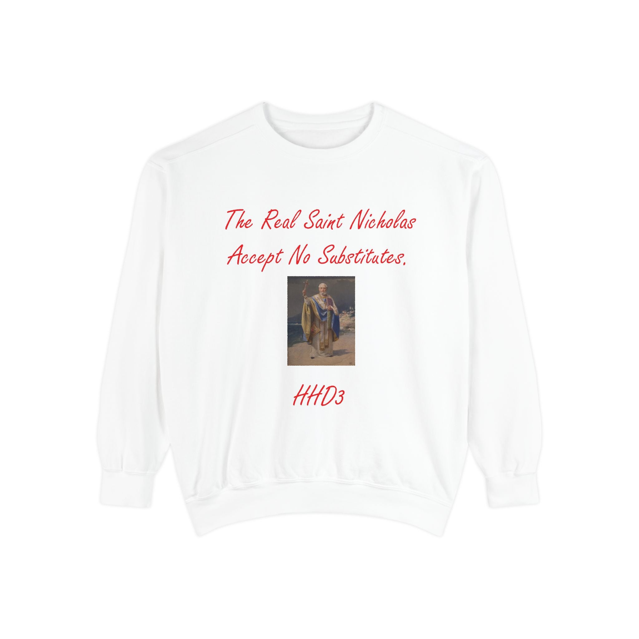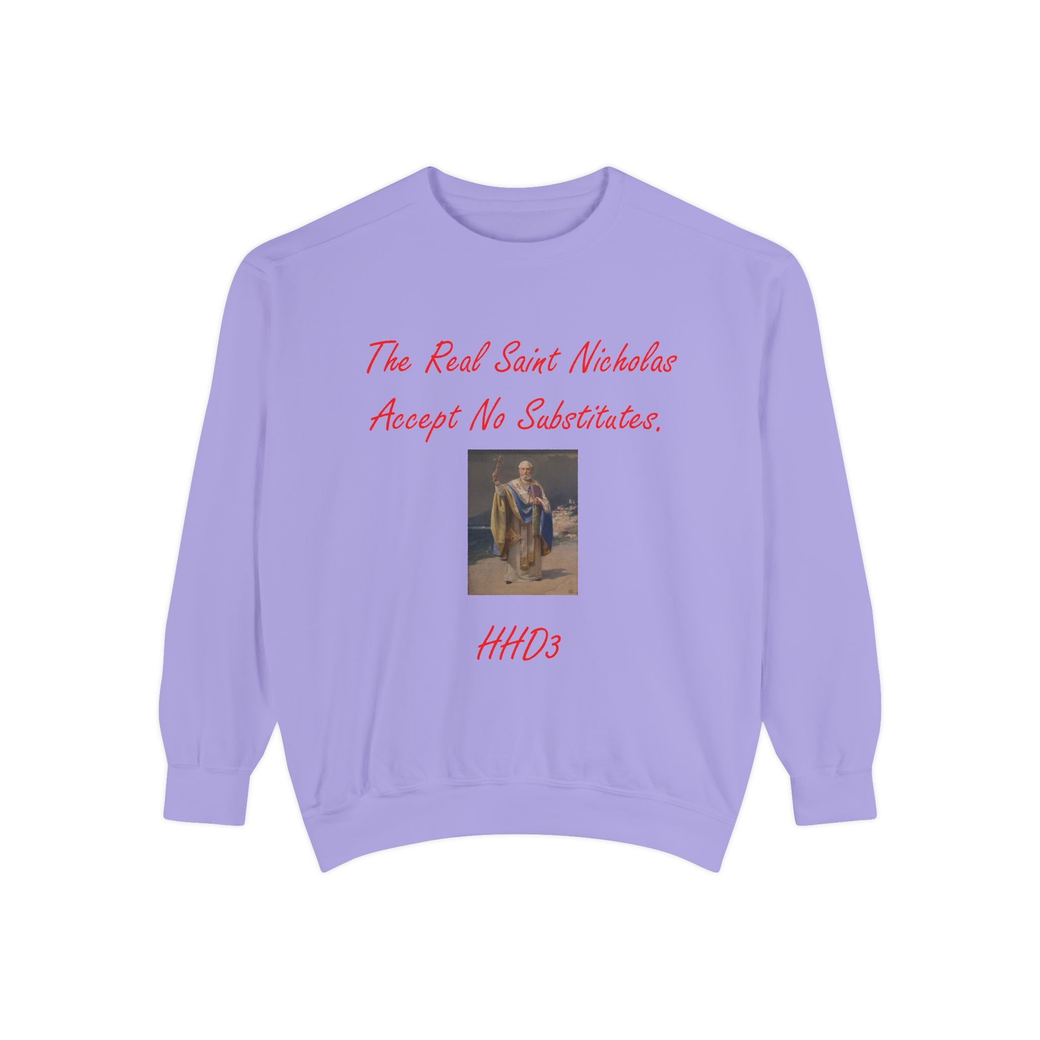 Wrap Yourself in the Legacy of St. Nicholas Celebrate tradition and comfort with this garment-dyed unisex sweatshirt featuring an original design by Herbie Dykeman (HHD3). The artwork showcases an image of St. Nicholas alongside the playful phrase, “The real St. Nicholas, Accept no substitutes.” Revered as the inspiration behind Santa Claus and the patron saint of children, St. Nicholas brings a sense of charm and history to your wardrobe. This sweatshirt combines its soft, luxurious fabric blend with Herbie’s unique artistry, creating a perfect piece for lounging at home, casual outings, or festive occasions. Whether gifting to loved ones or treating yourself, it’s a meaningful way to blend comfort, style, and storytelling in one cozy package.