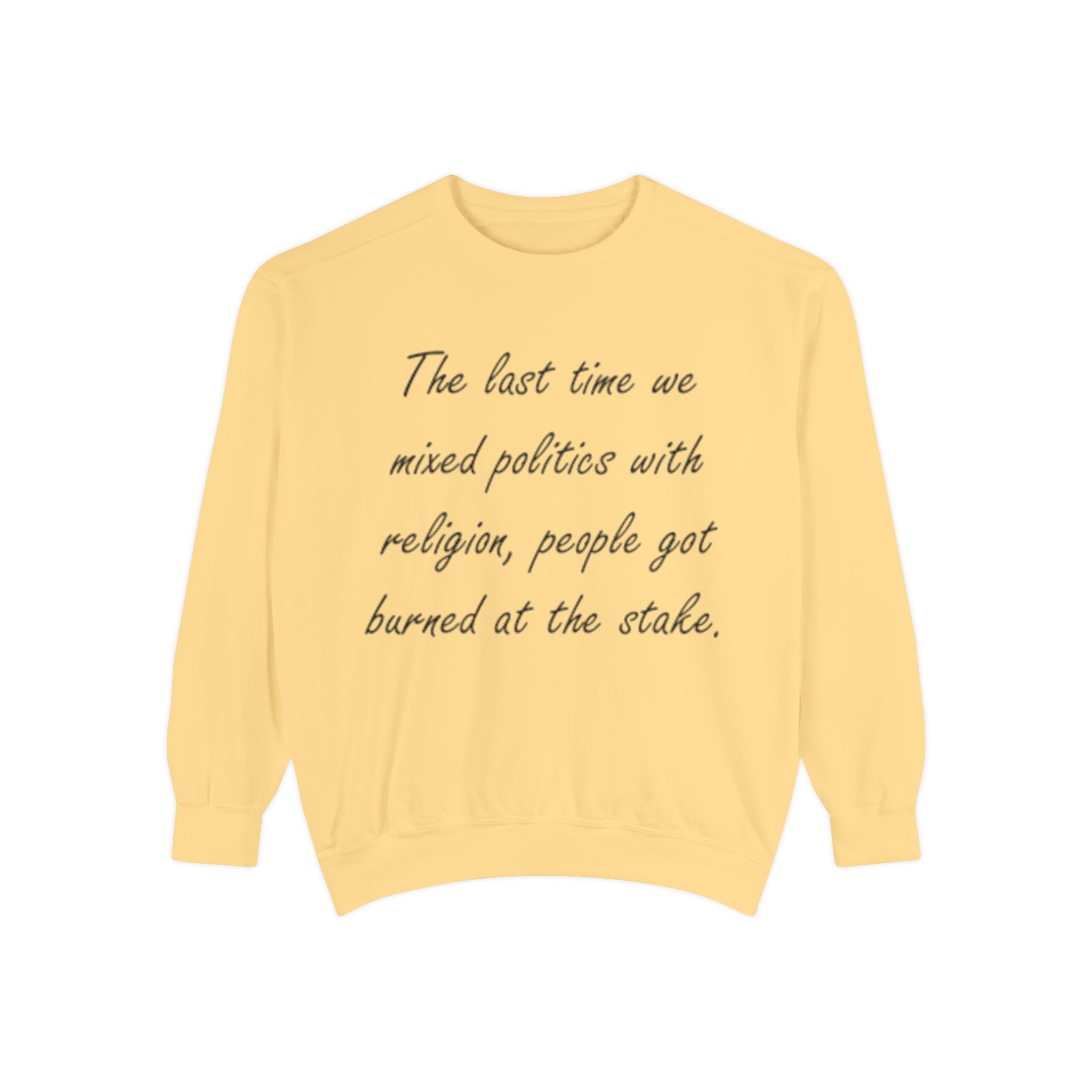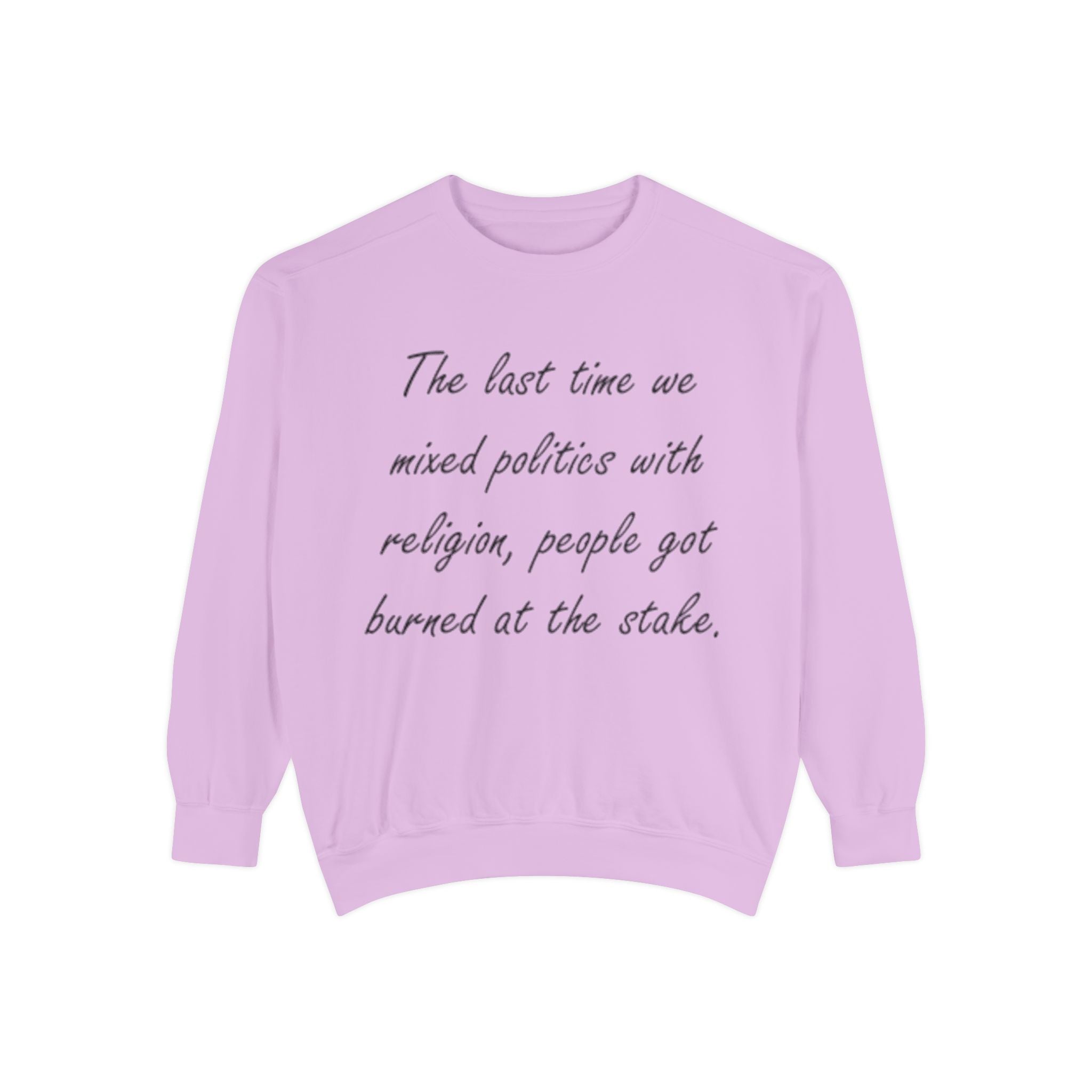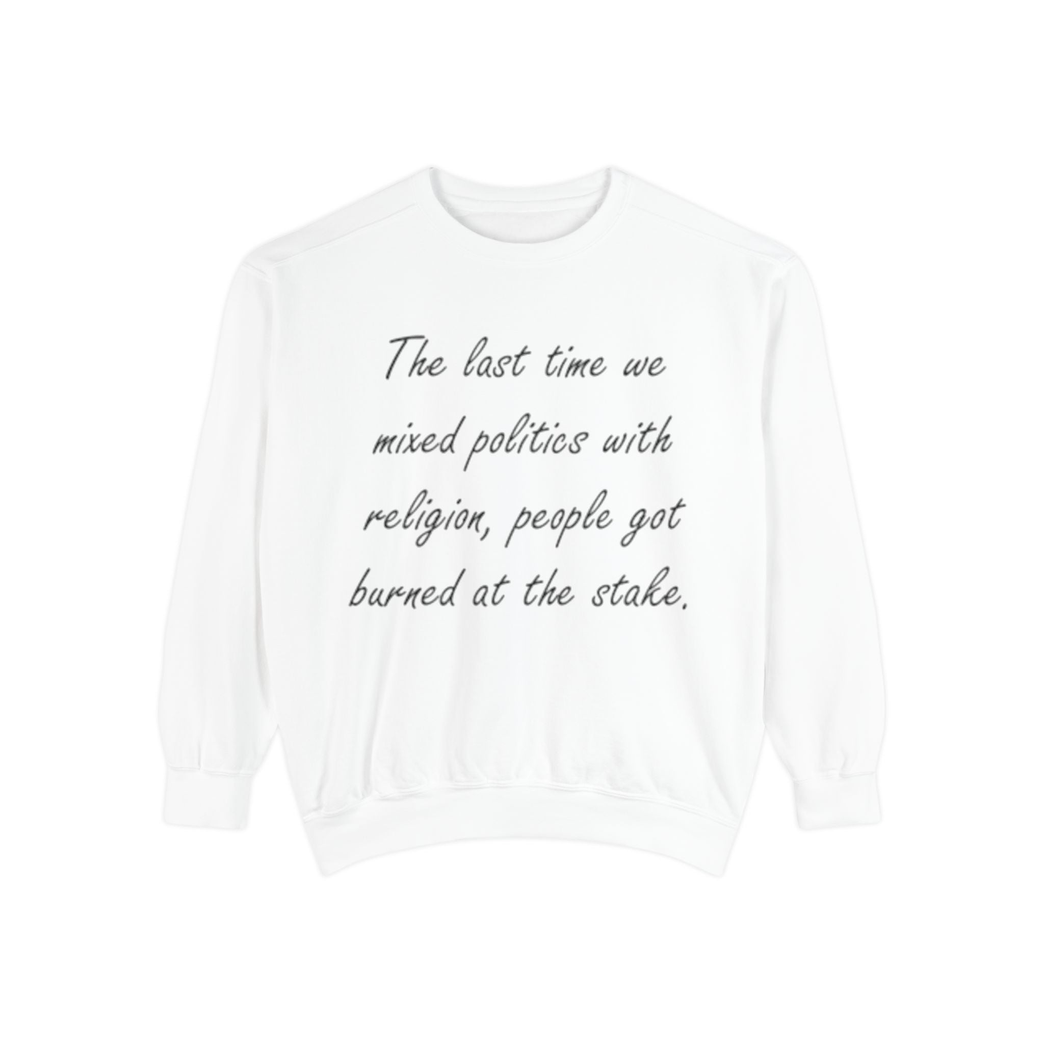 Stay cozy and make a statement with this unisex garment-dyed sweatshirt, featuring a bold design that reads: "The last time we mixed politics with religion, people got burned at the stake." This powerful piece reflects on historical injustices, urging awareness of the dangers of intertwining politics and religion while honoring those who suffered during the Burning Times.