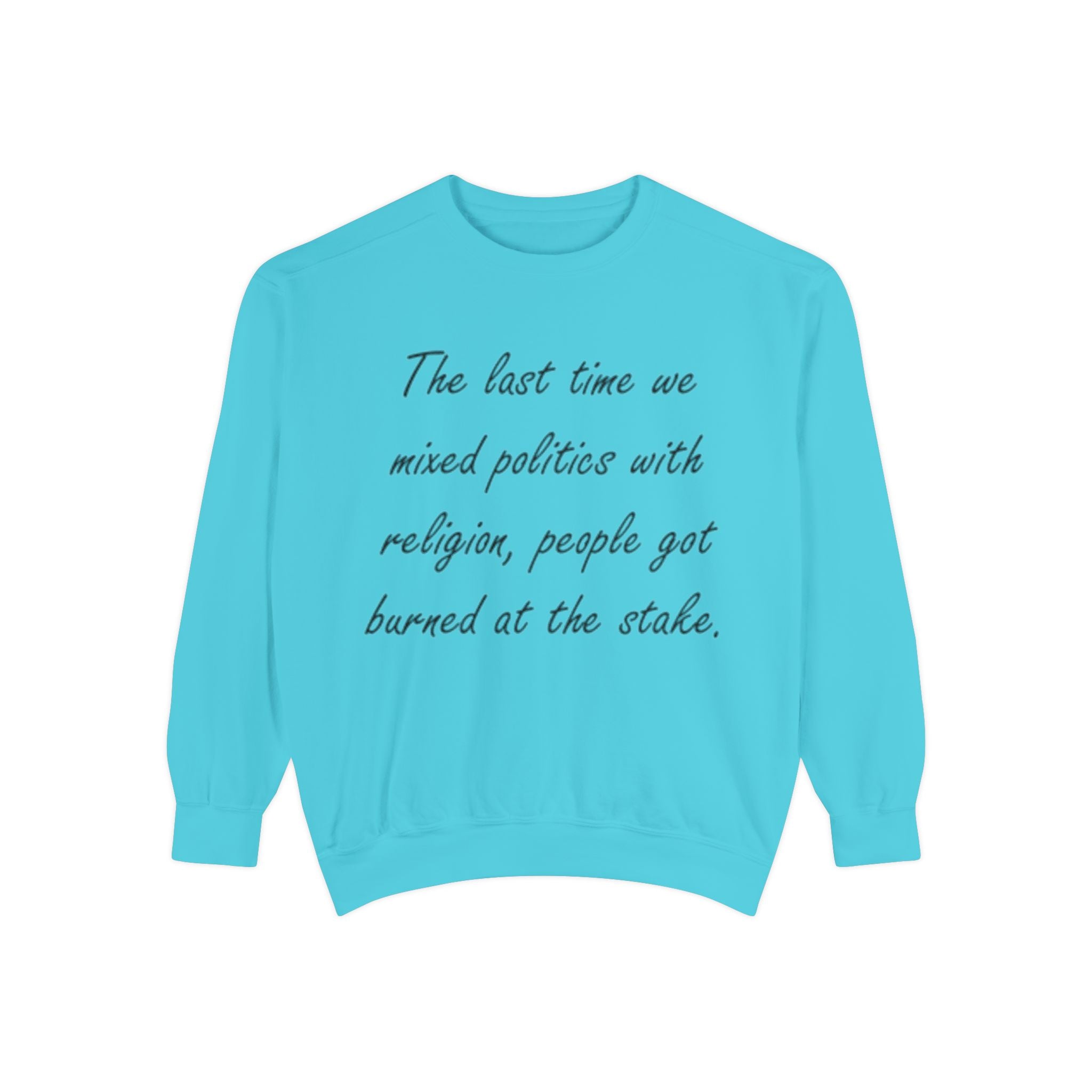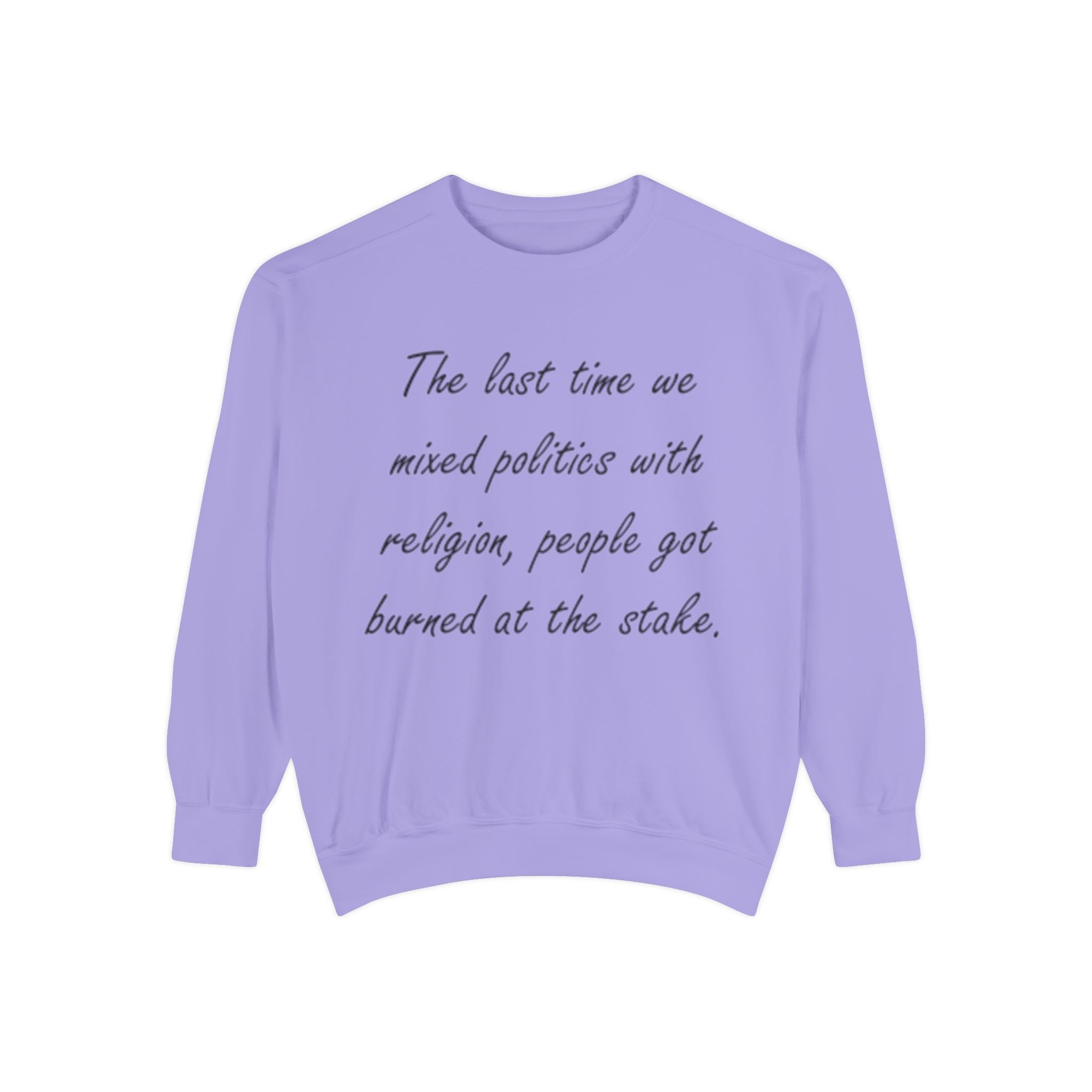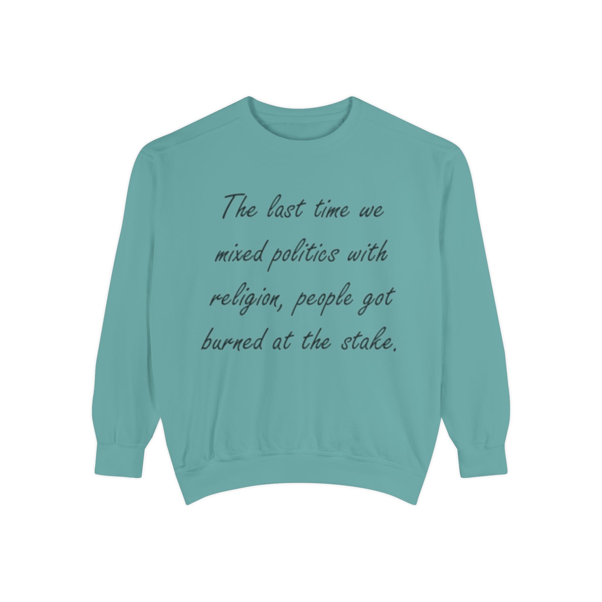 Stay cozy and make a statement with this unisex garment-dyed sweatshirt, featuring a bold design that reads: "The last time we mixed politics with religion, people got burned at the stake." This powerful piece reflects on historical injustices, urging awareness of the dangers of intertwining politics and religion while honoring those who suffered during the Burning Times.