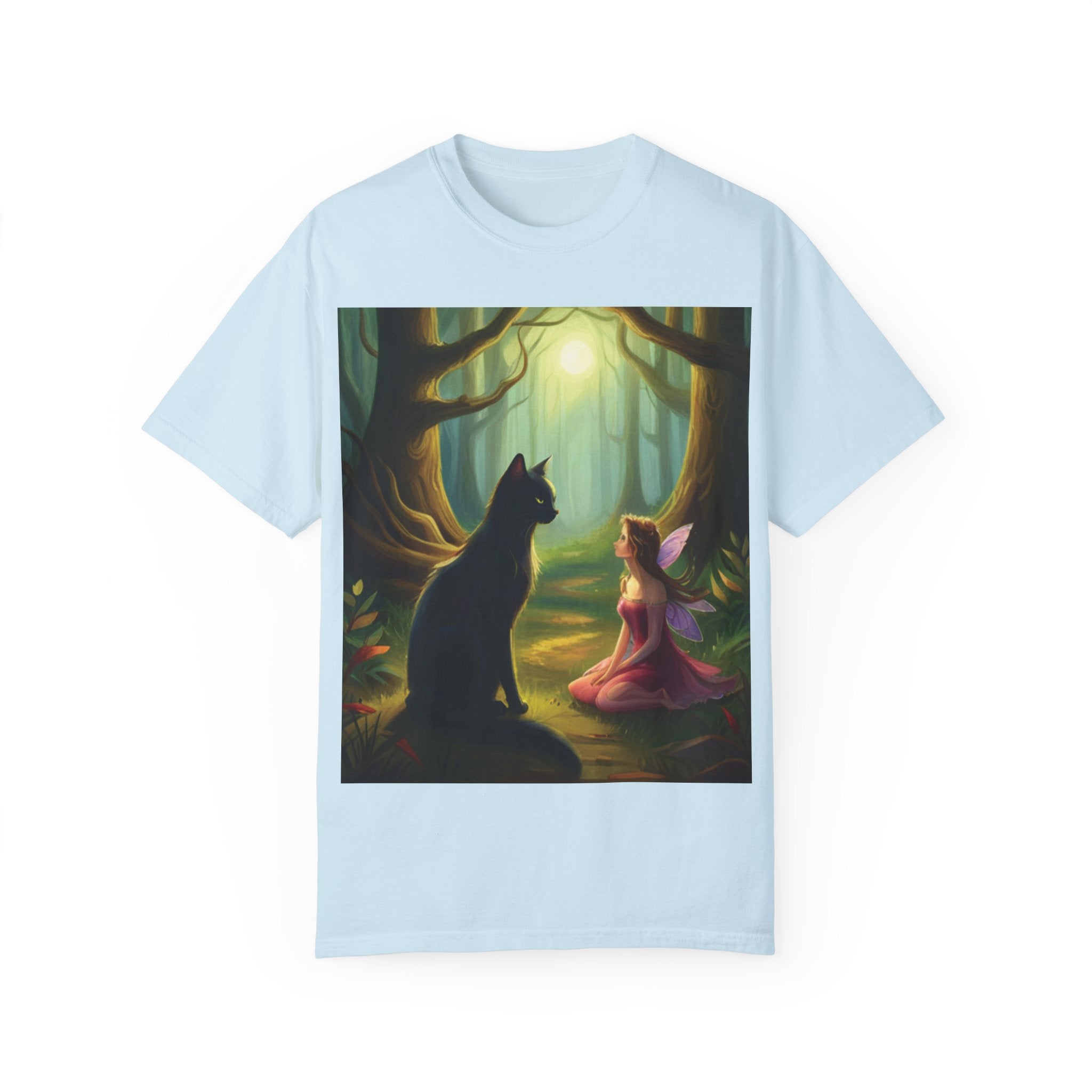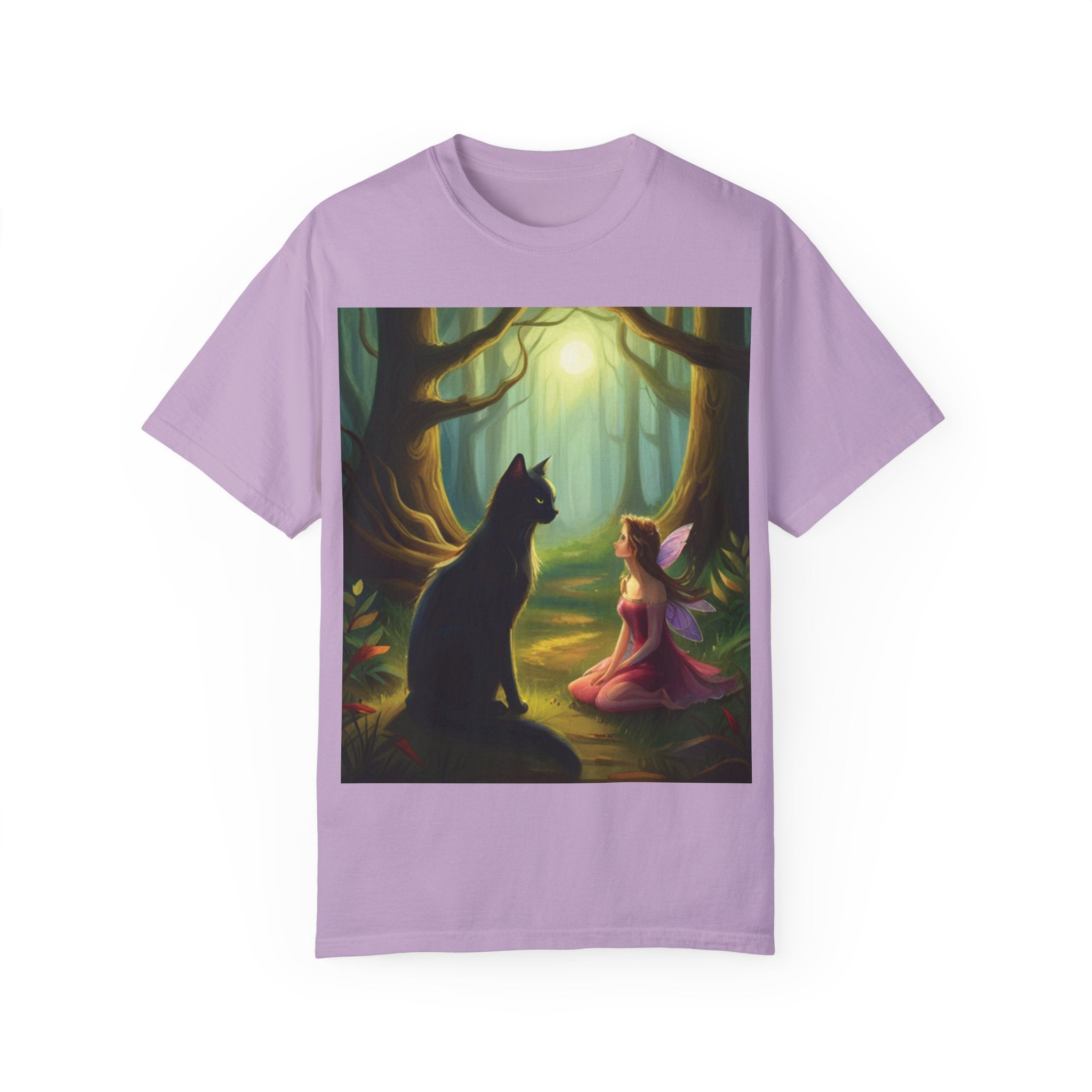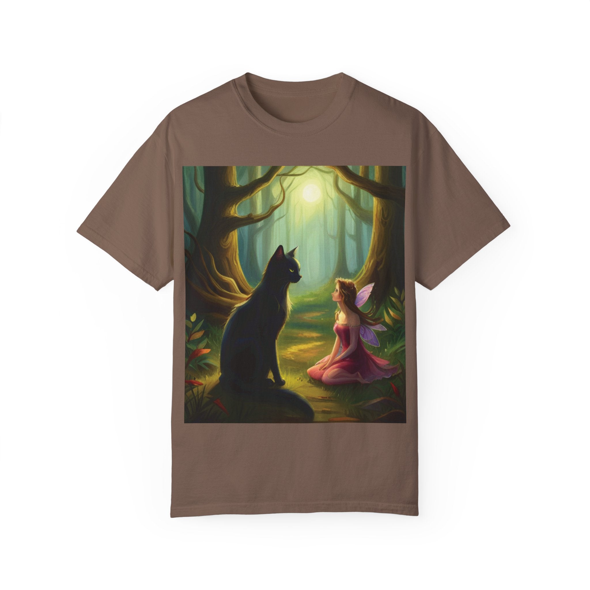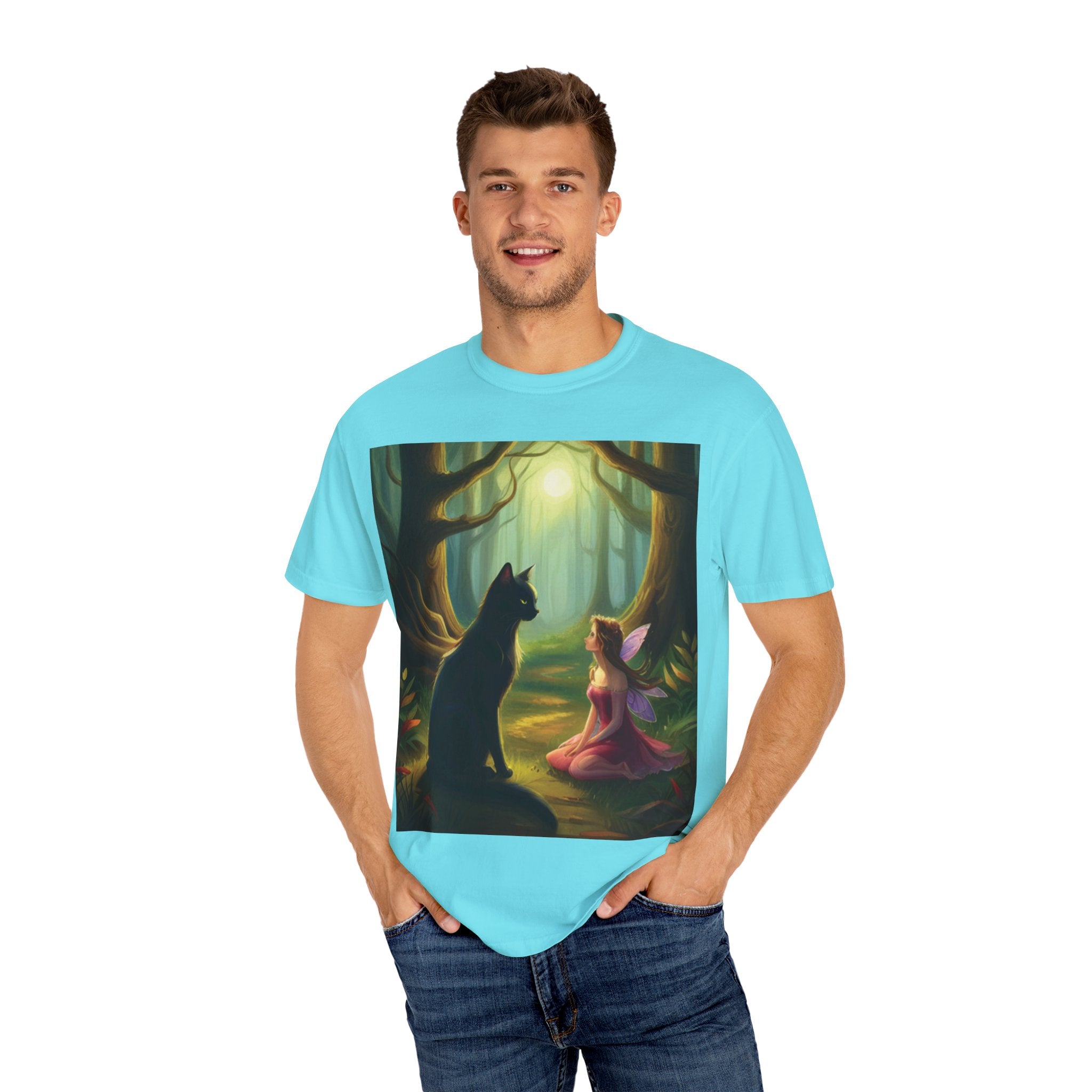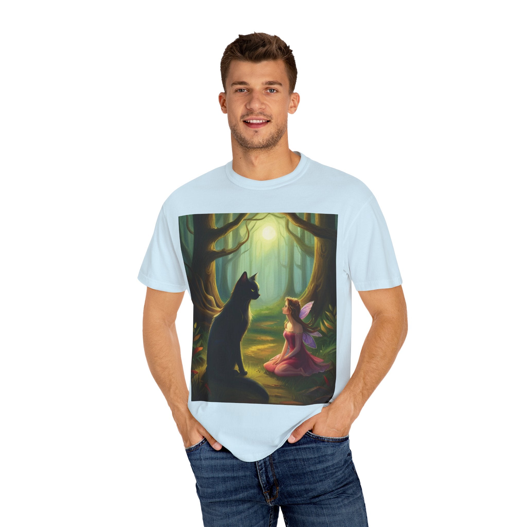 Step into a world of magic and whimsy with this delightful unisex garment-dyed T-shirt. Featuring enchanting artwork of a fairy sharing a moment with a mysterious black cat, this T-shirt radiates a sense of wonder and adventure. Perfect for those who embrace their unique style and love fantasy, it's ideal for casual outings, special gatherings, or cozy nights in. Whether you're celebrating a birthday, participating in a themed event, or simply expressing your personality, this versatile T-shirt is a delightful addition to any wardrobe. Great for adults and pairs beautifully with your favorite jeans or shorts, making it suitable for every season!