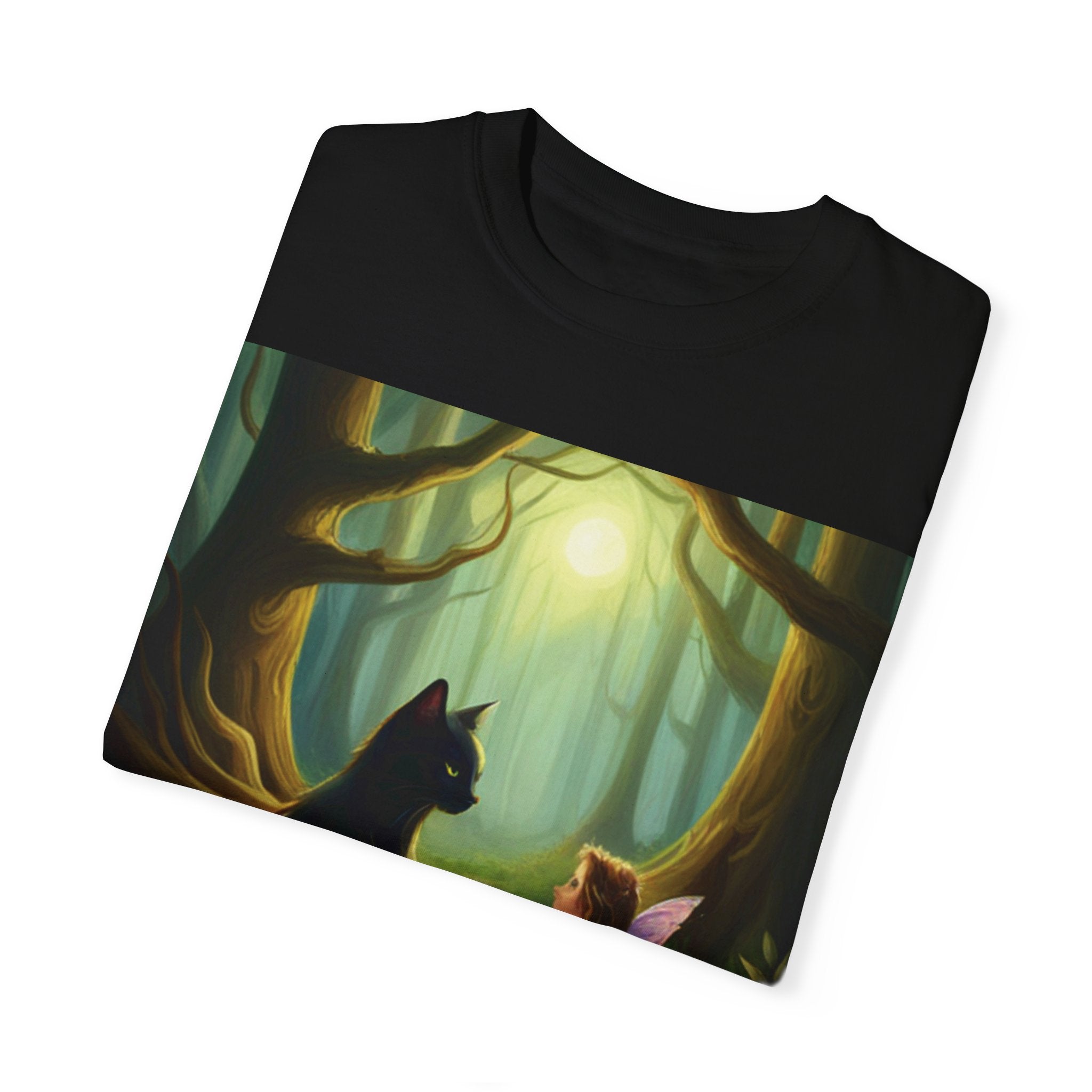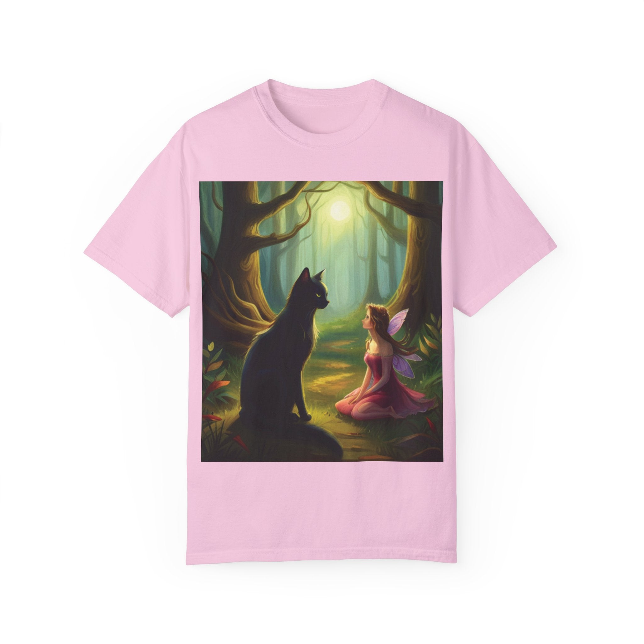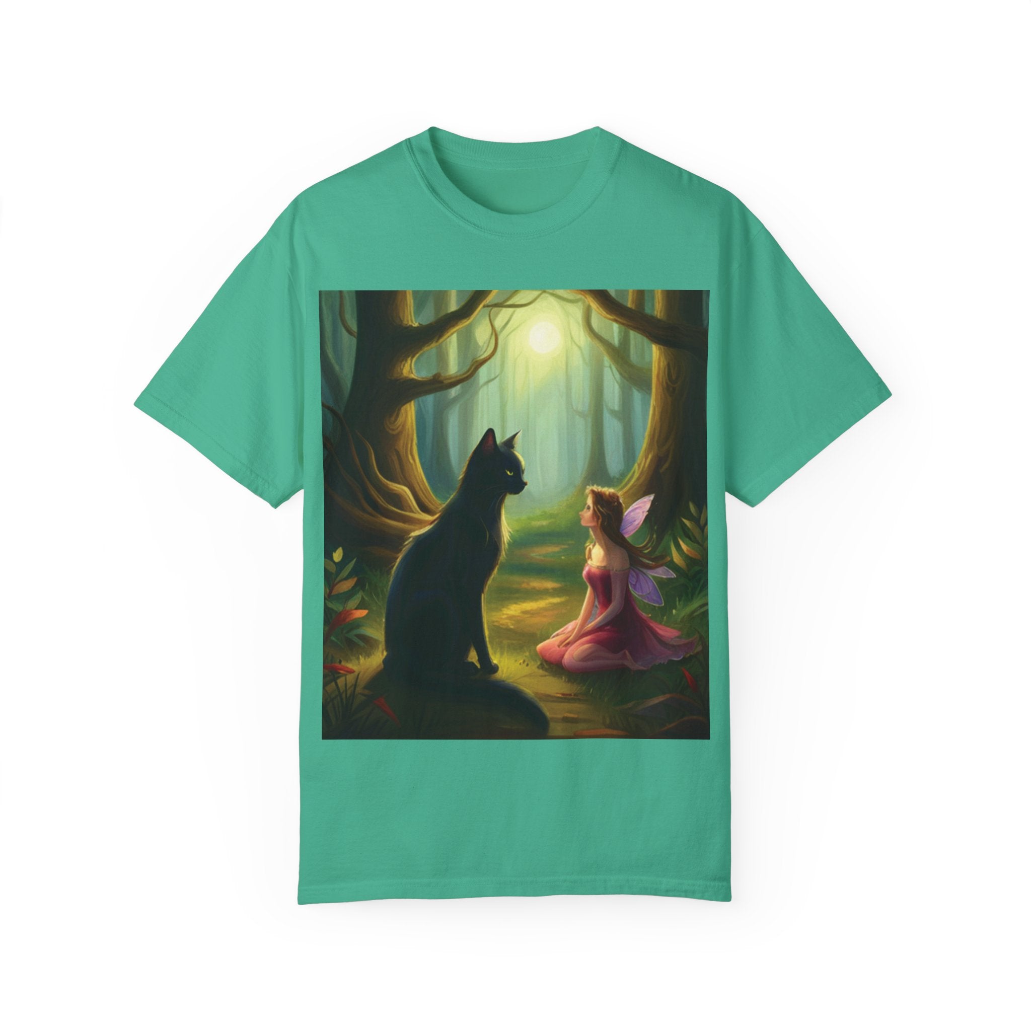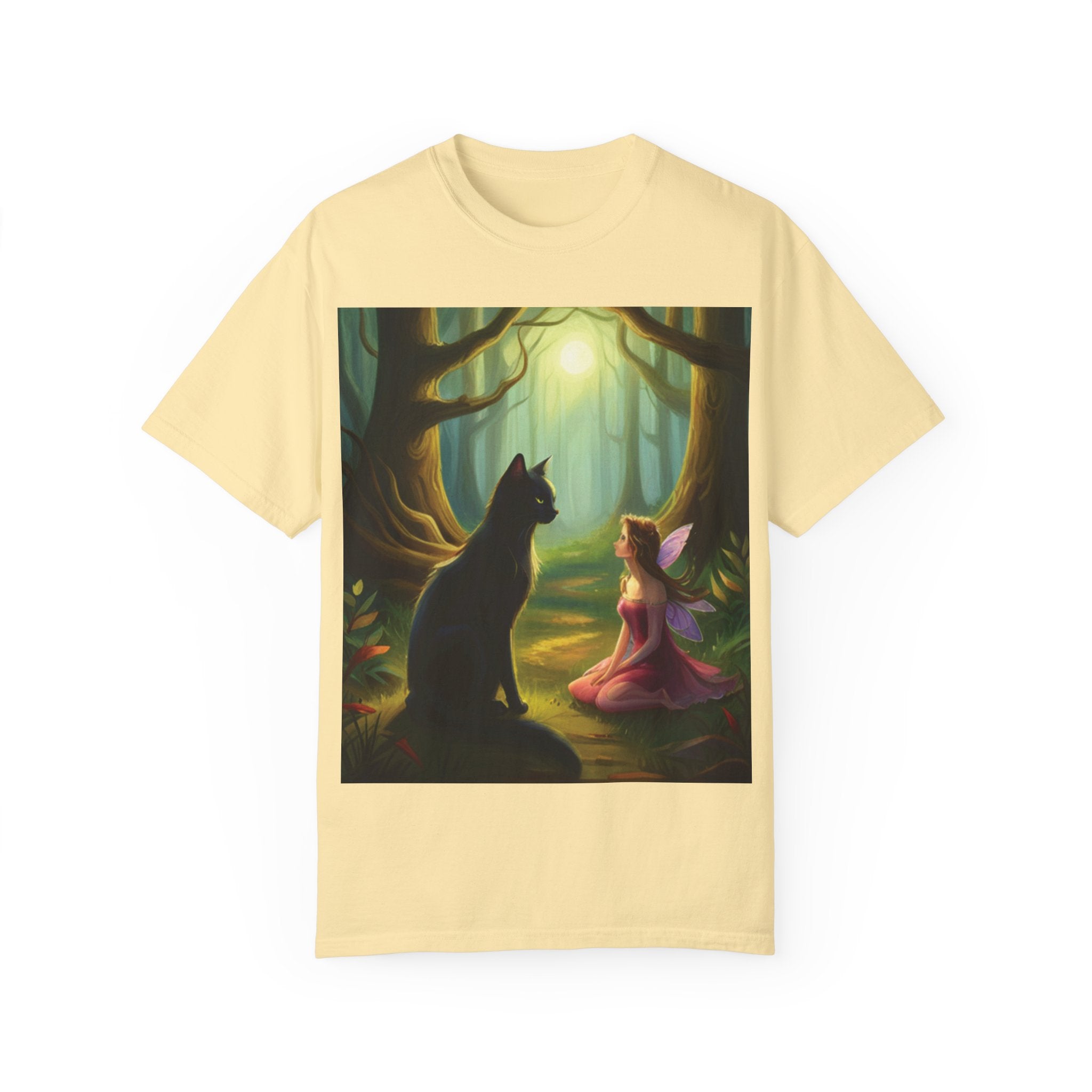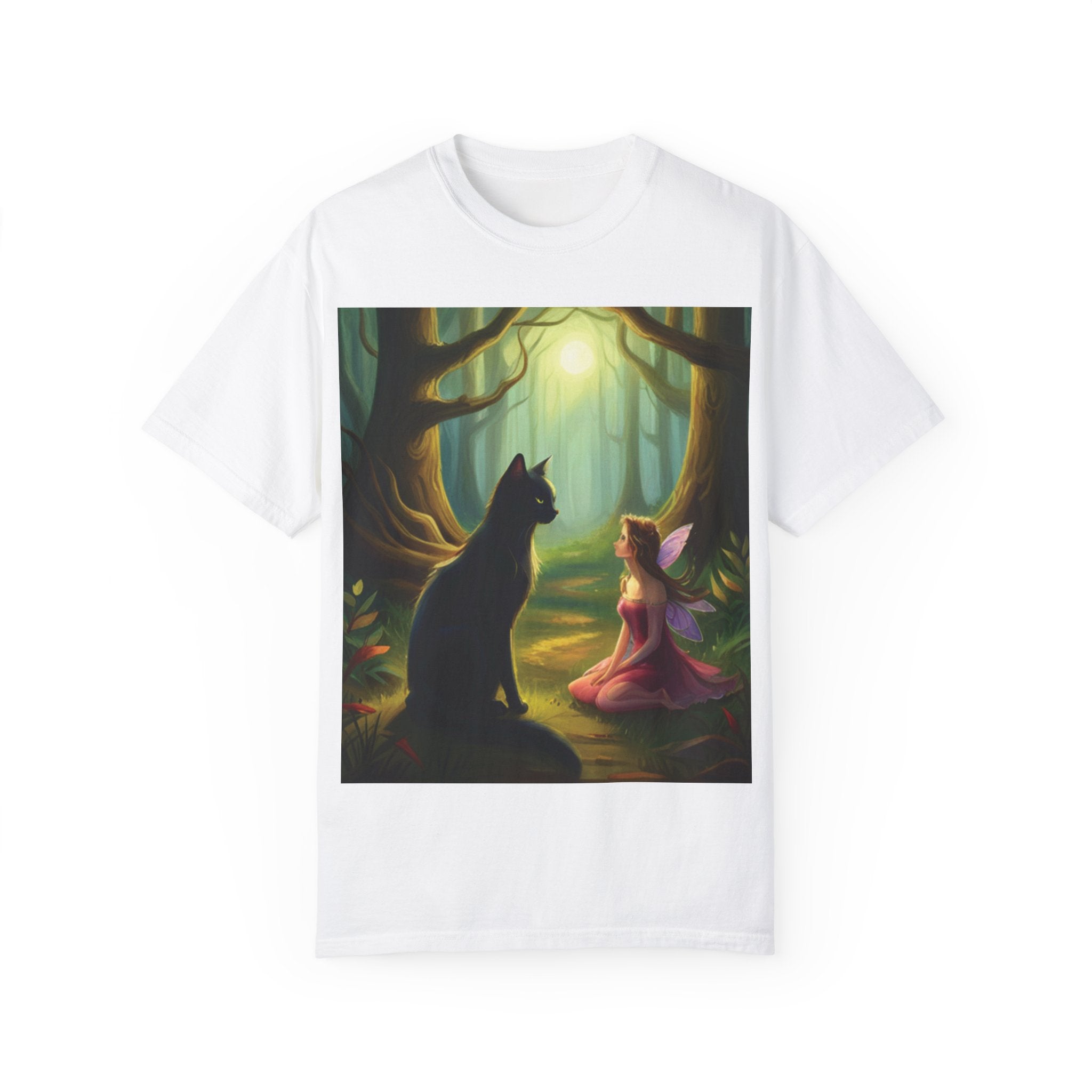 Step into a world of magic and whimsy with this delightful unisex garment-dyed T-shirt. Featuring enchanting artwork of a fairy sharing a moment with a mysterious black cat, this T-shirt radiates a sense of wonder and adventure. Perfect for those who embrace their unique style and love fantasy, it's ideal for casual outings, special gatherings, or cozy nights in. Whether you're celebrating a birthday, participating in a themed event, or simply expressing your personality, this versatile T-shirt is a delightful addition to any wardrobe. Great for adults and pairs beautifully with your favorite jeans or shorts, making it suitable for every season!